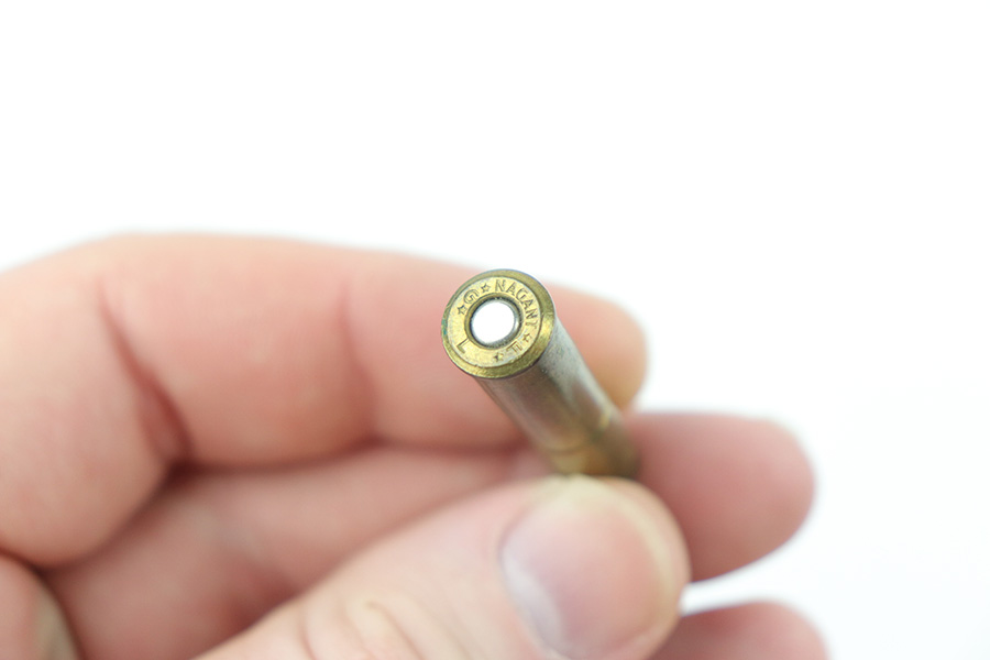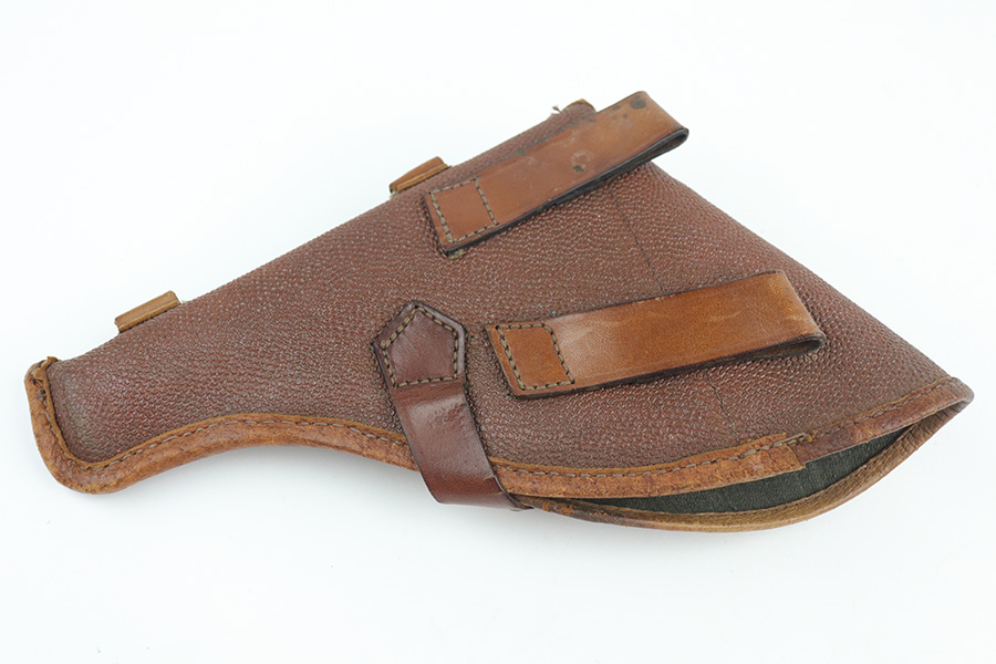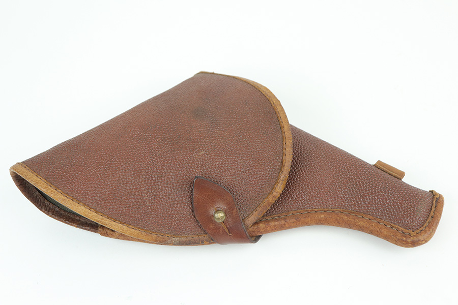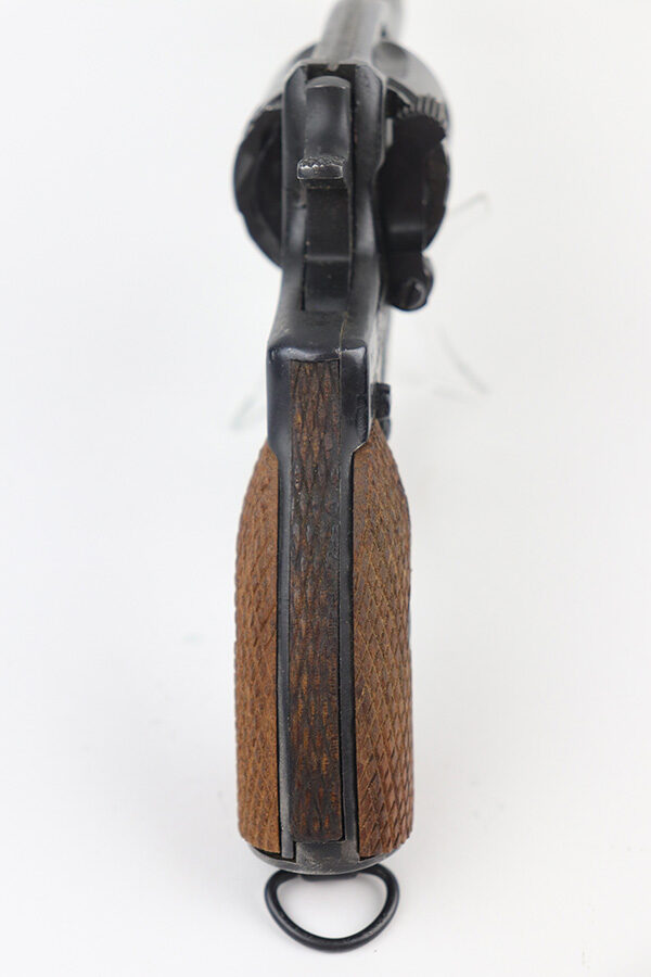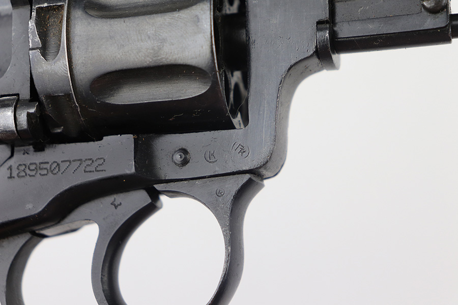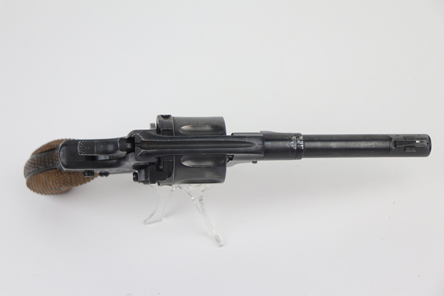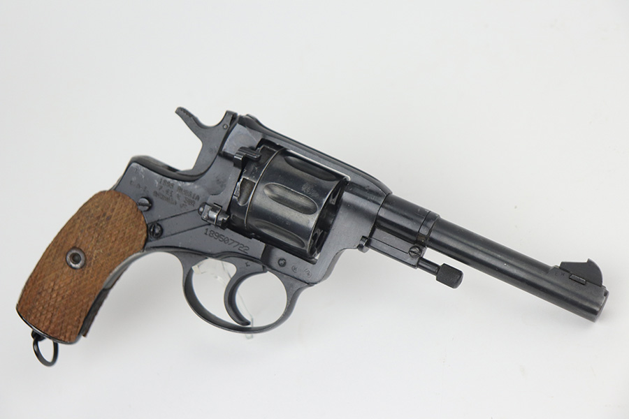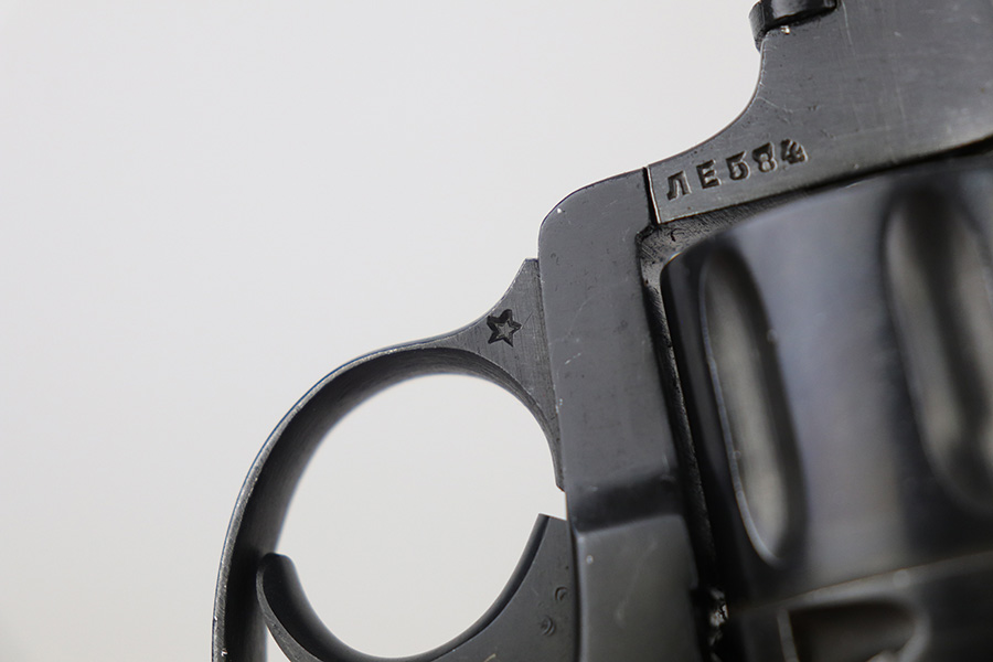 11/19/21 – This is an excellent example of a Russian Nagant Model 1895 revolver manufactured in 1940. It is all matching and has the proper Russian proofs throughout. There is an import mark and an added serial number on the right side of the frame. It comes as a rig with a proper holster (looks like it might be dated 1930), cleaning rod, and 12 cartridges (not dated). The entire gun has been arsenal-refurbished. It has retained about 97% of its bluing. There are small areas of splotchy discoloration here and there, most noticeable on both sides of the frame and on the cylinder. There is what looks like black paint on the right side of frame that is starting to chip away. Comes with minty wood grips. The bore is excellent with strong rifling.