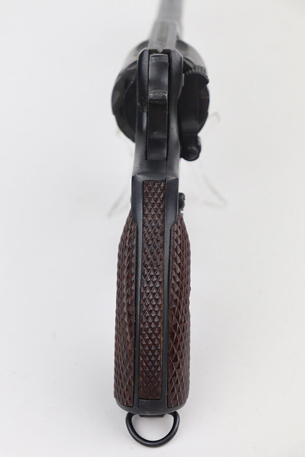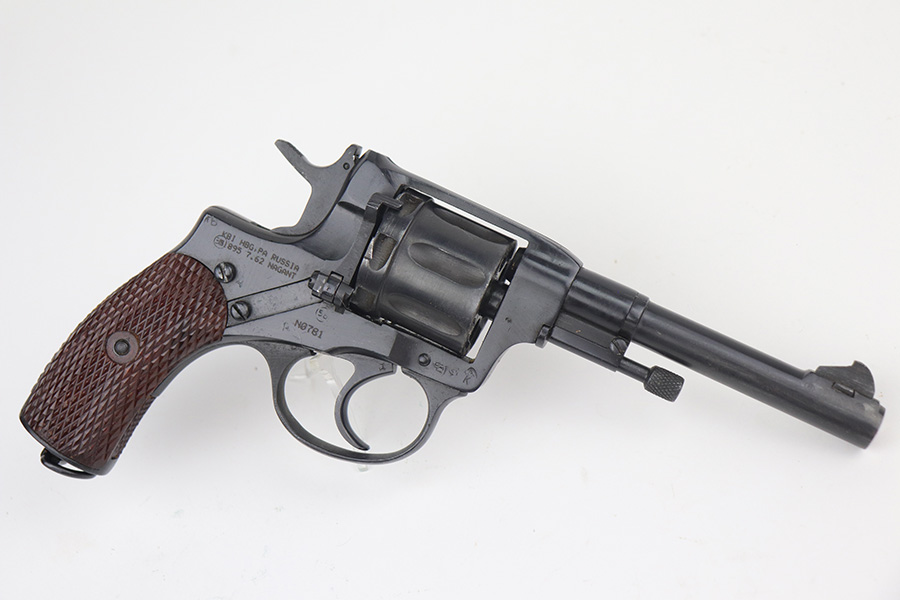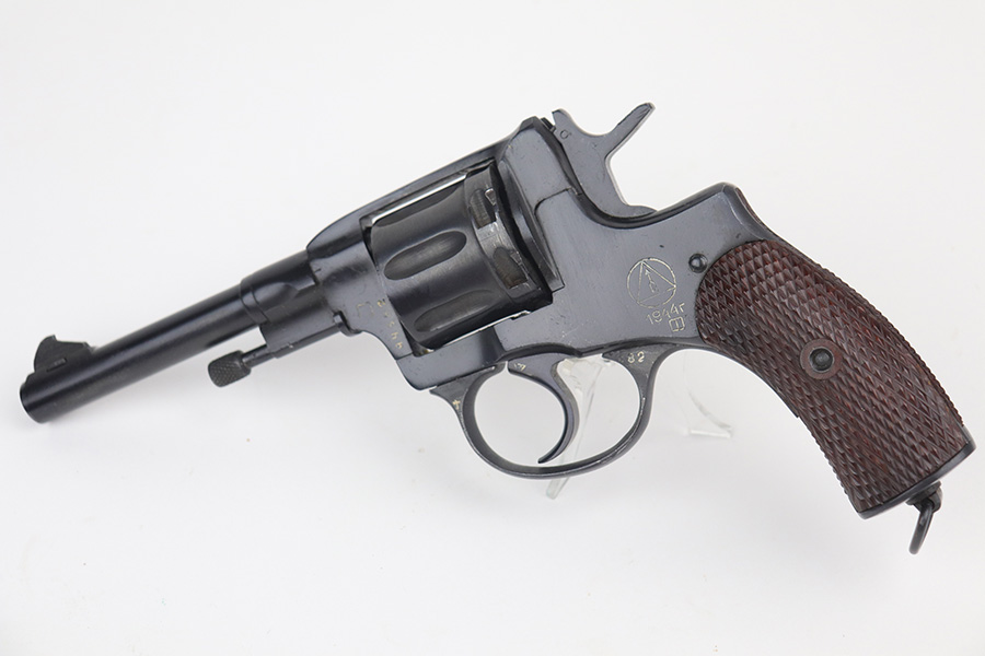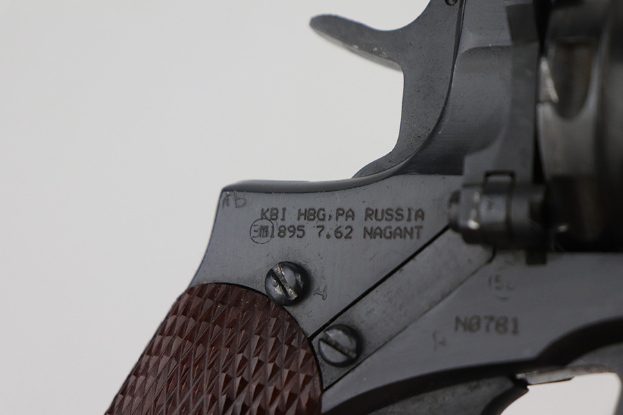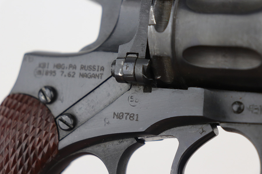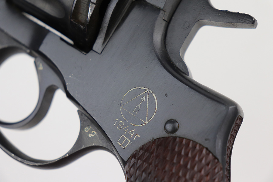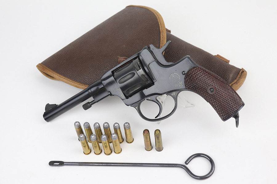 11/19/21 – This is an excellent example of a Russian Nagant Model 1895 revolver manufactured in 1944. It is all matching and has the proper Russian proofs throughout. There is an import mark and an added serial number on the right side of the frame. It comes as a rig with a proper holster (looks like it’s dated 1953), cleaning rod, and 12 cartridges (not dated). The entire gun has been arsenal-refurbished. It has retained about 99% of its bluing. just a very faint roll mark on the cylinder and some very light handling marks here and there. Comes with excellent reddish bakelite grips. The bore is mint.