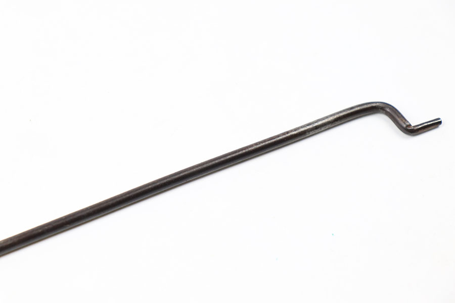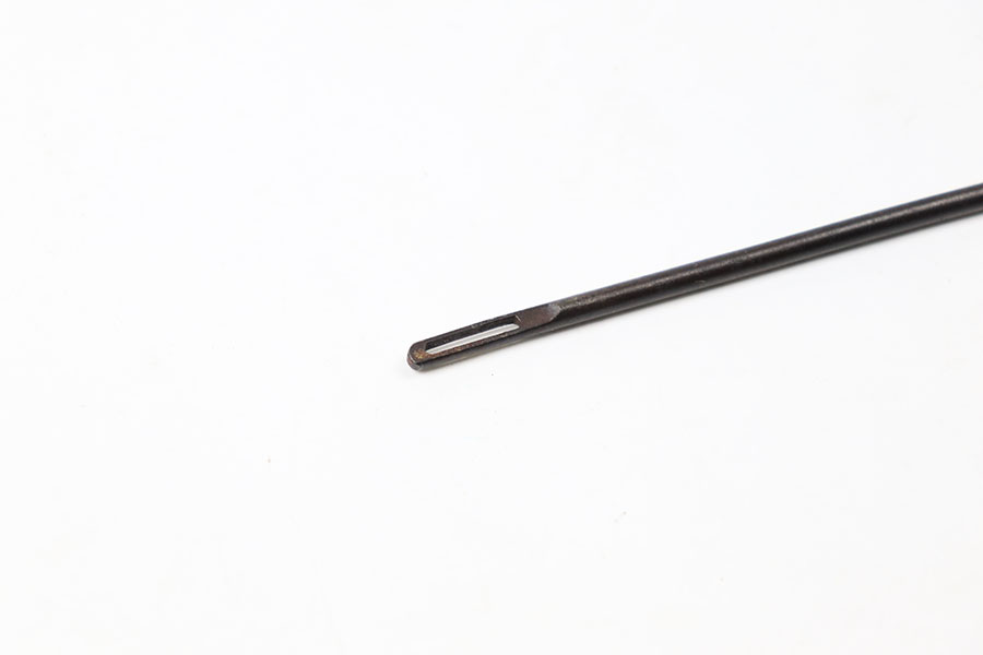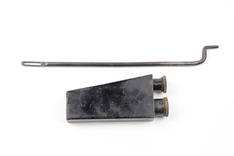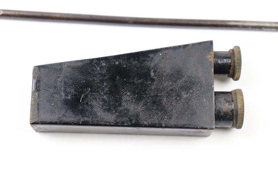 9/30/21 – This is an original Type 14 Nambu cleaning rod, with an unusual oiler. The oiler is unmarked except for a very small stamp on one of the knobs. This stamp looks like a small MW overlapping each other. The knobs unscrew without issue. We found the oiler inside a Type 14 Nambu holster, so we assume that’s what this is for, but we’ve never seen another like this one. The cleaning rod has dark patina throughout and no markings or stamps.
