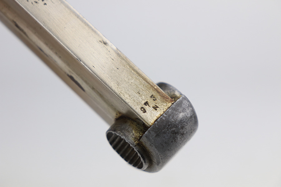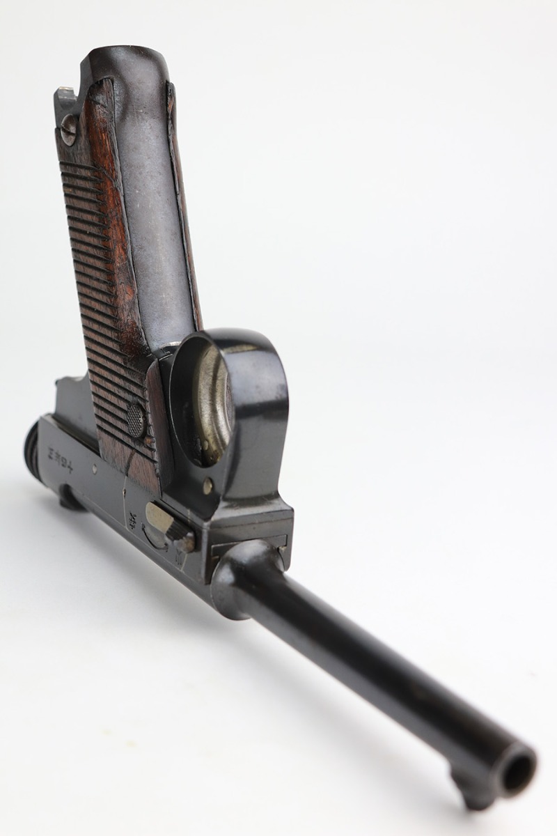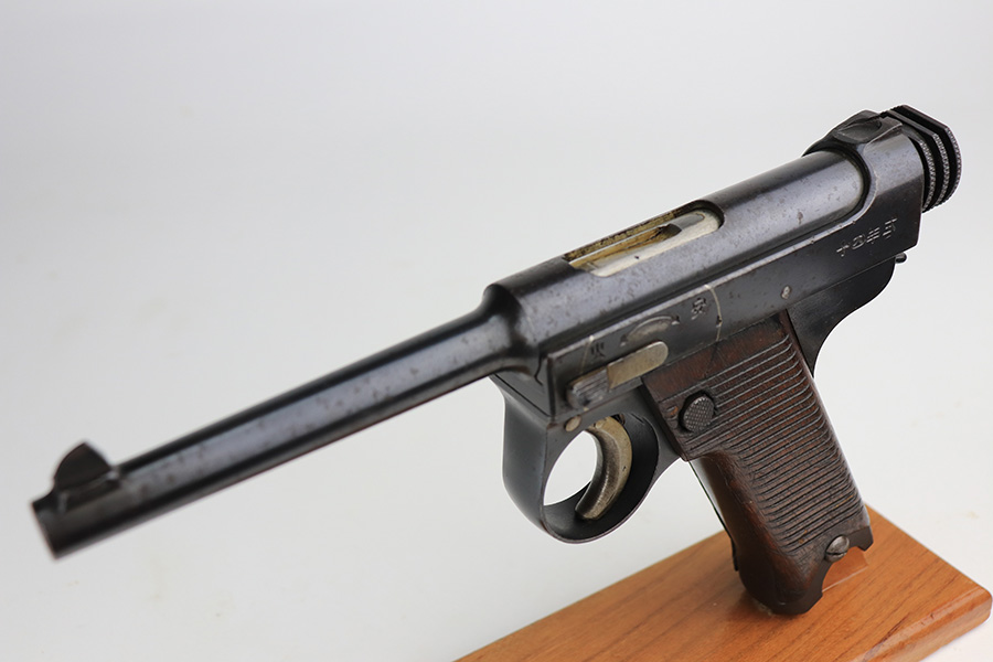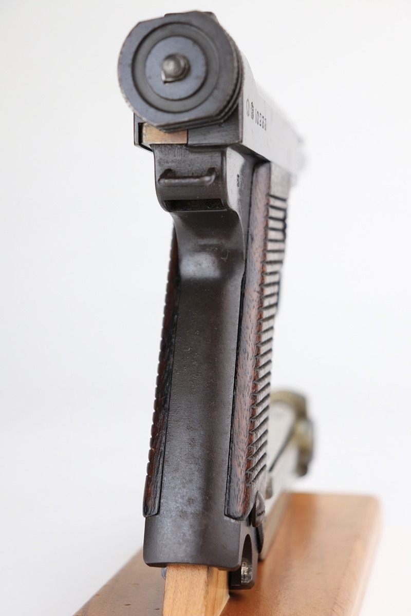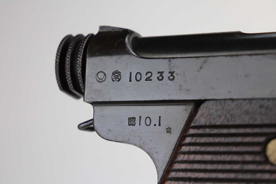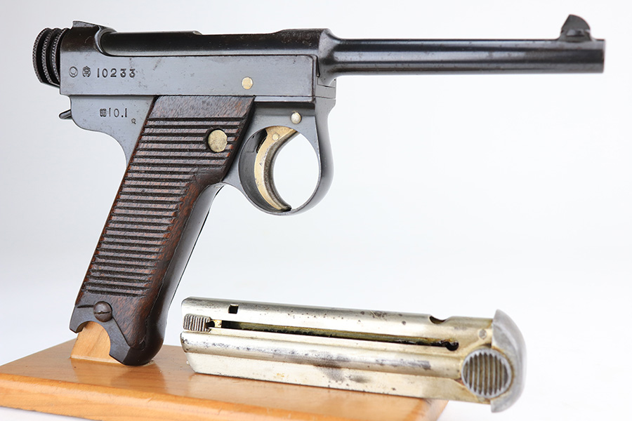 1/7/22 – This is an excellent example of an early Nambu Type 14 issued to the Japanese military in January of 1935. The gun is all matching and has early features, such as the small trigger guard and straw small parts. Comes with a proper early nickel-tube magazine that is mismatched. The gun has retained about 98% of its original finish with minor wear on the underside of the barrel near the muzzle and on the underside of the trigger guard. While there is very little actual finish loss, there is spotty oxidation throughout and some pitting on the chamber and around the rear sight. Comes with nice period-correct wood grips – the left panel is numbered, but we can’t make out the number. Mint bore.