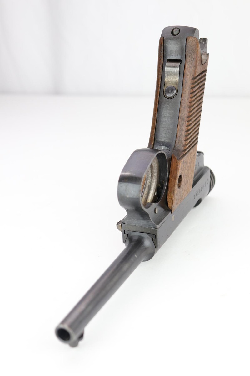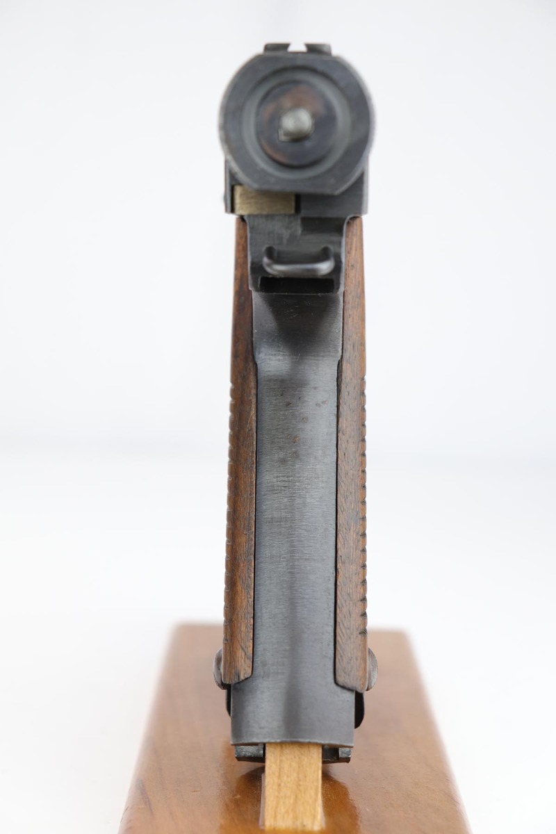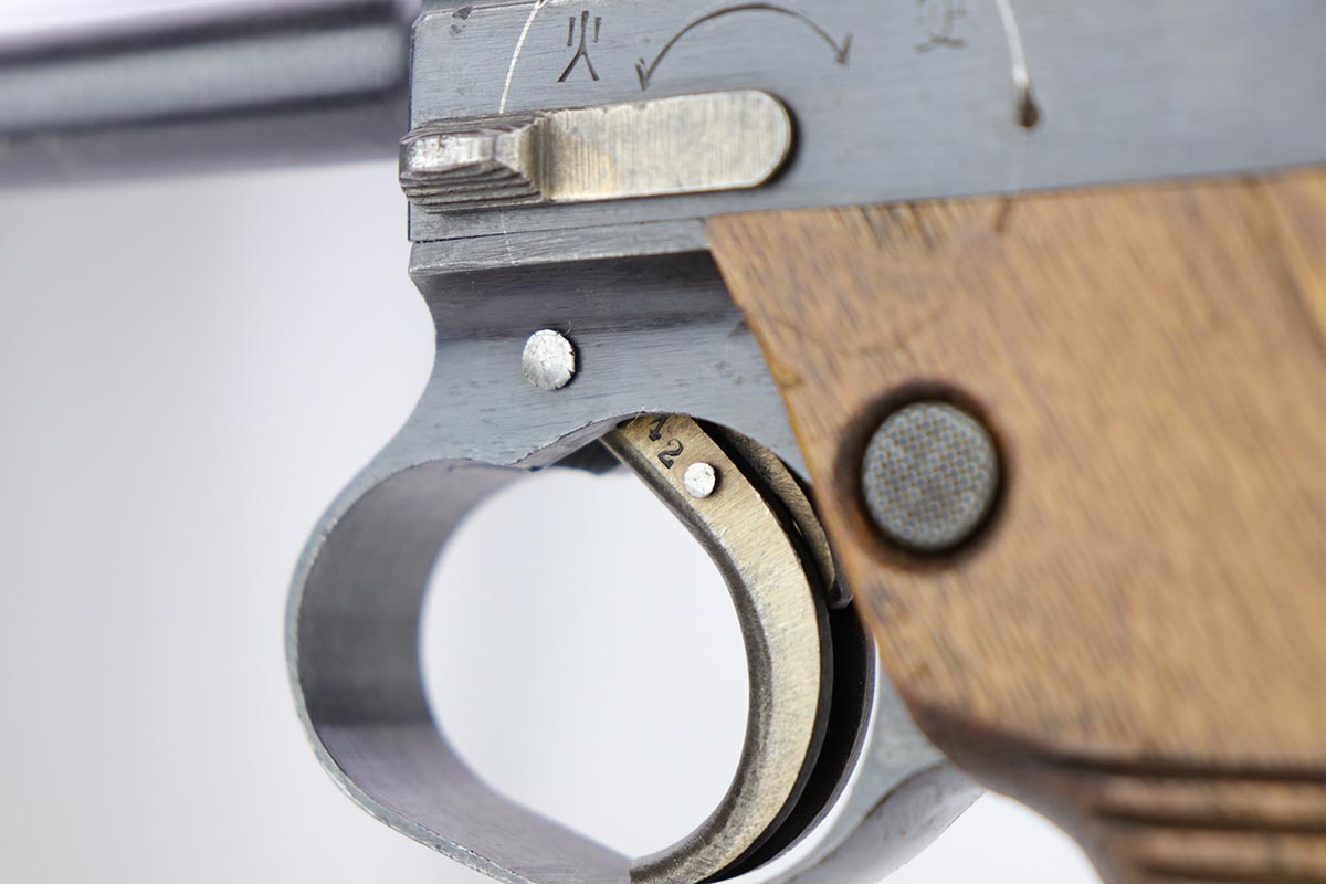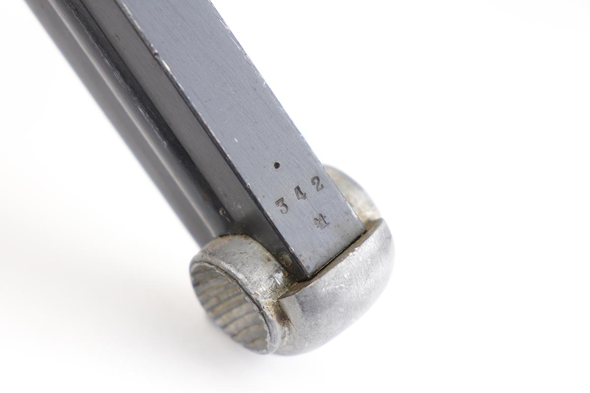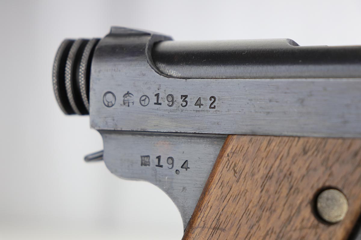 1/31/20 – This is an all matching and original Type 14 Nambu that was made in April of 1944. It has one of the original, matching magazines, and the grips are hand numbered to the gun. Bluing rates at about 96% with a spot of wear on the trigger guard and another on the left side of the frame. There is also some minor freckling on the back strap and above the chamber. Mint bore and excellent grips.
