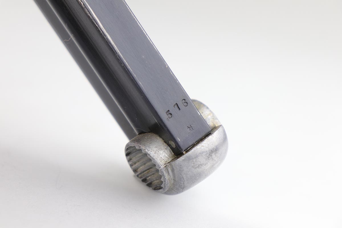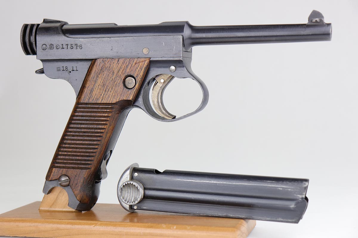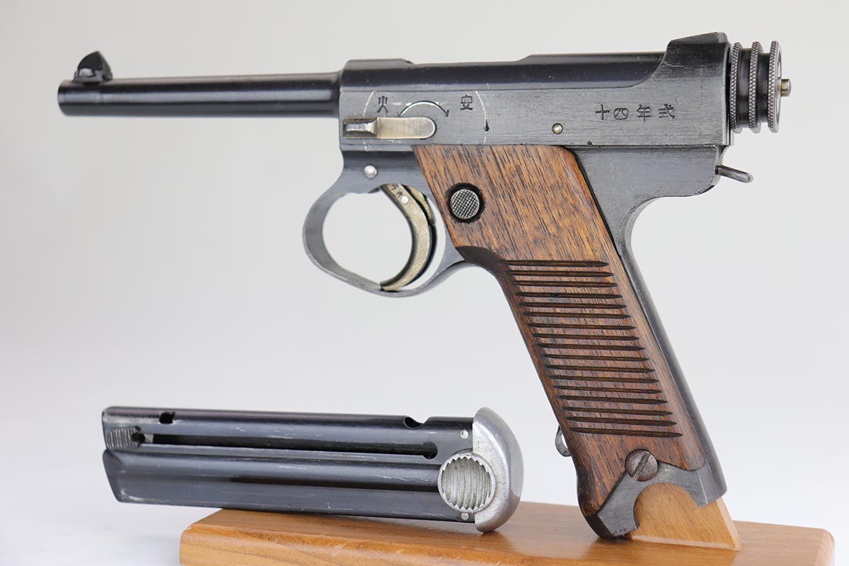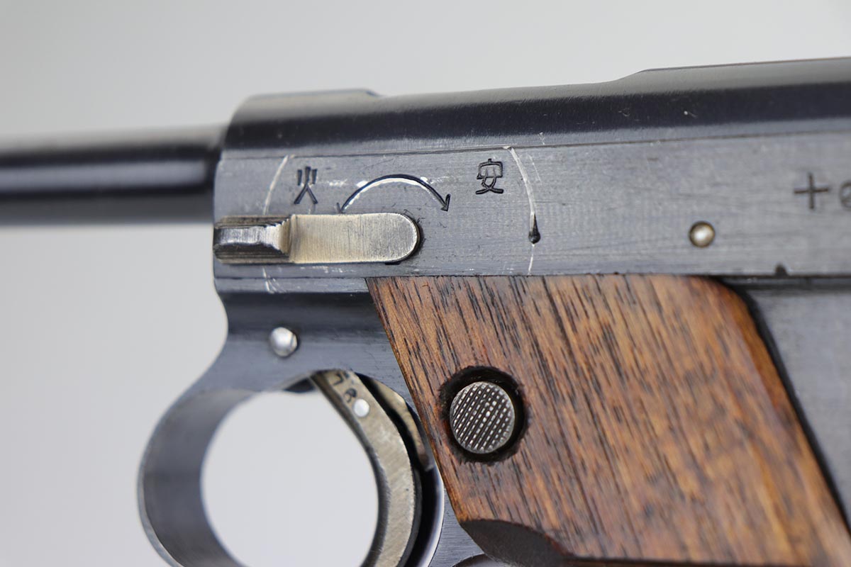 3/16/20 – This is a matching and original Nambu Type 14 pistol from November of 1943. The finish on this one was a little hard to rate, as it is a little difficult to discern what may be thinning finish versus what may just be late-war machining and finishing processes. The pistol has a mint bore, so it seems to have been used minimally. There is some thinning and browning on the back strap. The original matching magazine is present. The grips are hand numbered but it is faint and can’t be confirmed to match or mismatch.