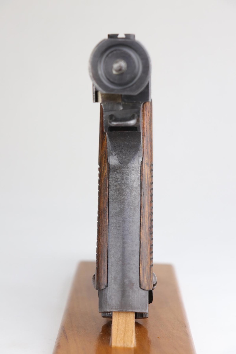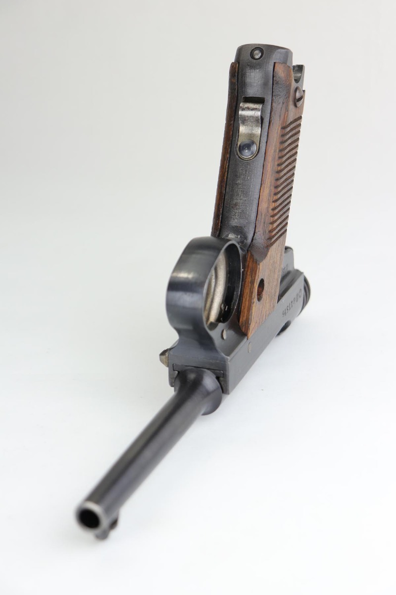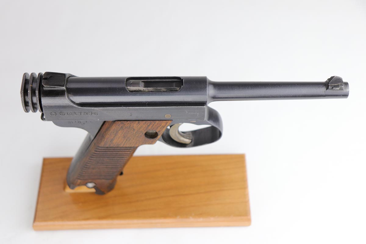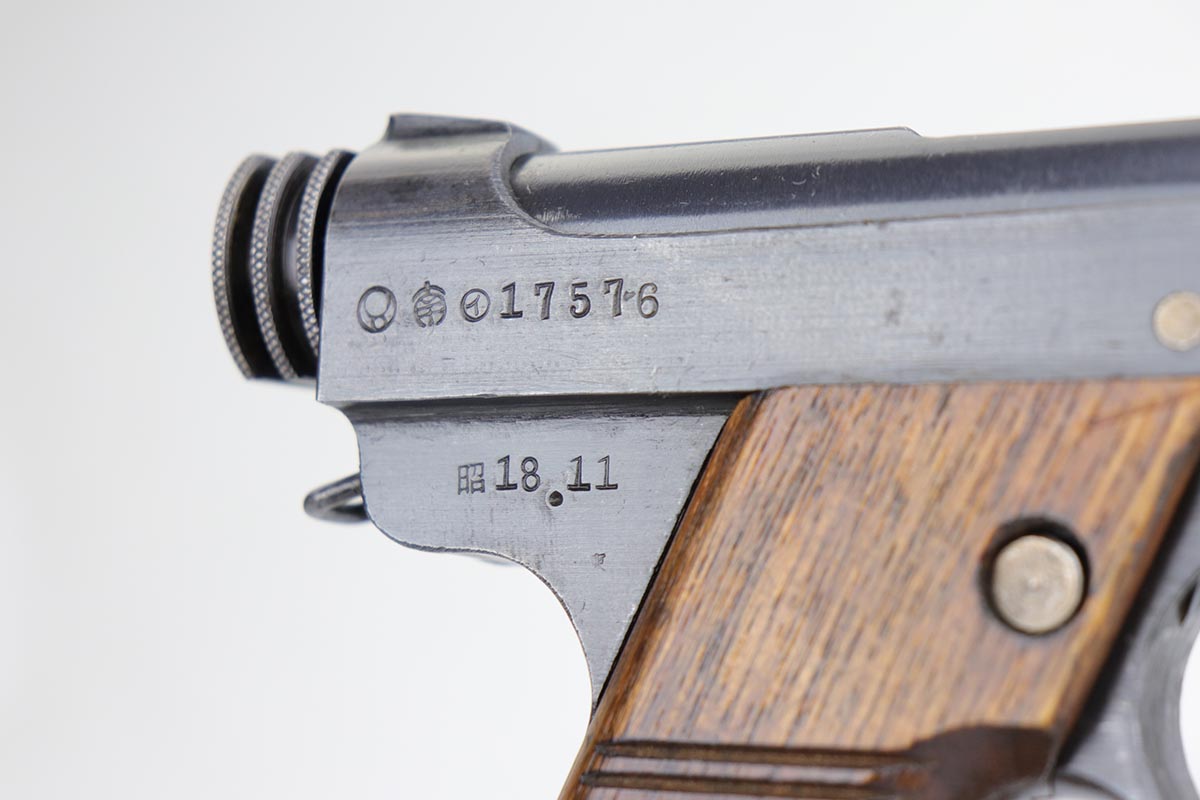 3/16/20 – This is a matching and original Nambu Type 14 pistol from November of 1943. The finish on this one was a little hard to rate, as it is a little difficult to discern what may be thinning finish versus what may just be late-war machining and finishing processes. The pistol has a mint bore, so it seems to have been used minimally. There is some thinning and browning on the back strap. The original matching magazine is present. The grips are hand numbered but it is faint and can’t be confirmed to match or mismatch.