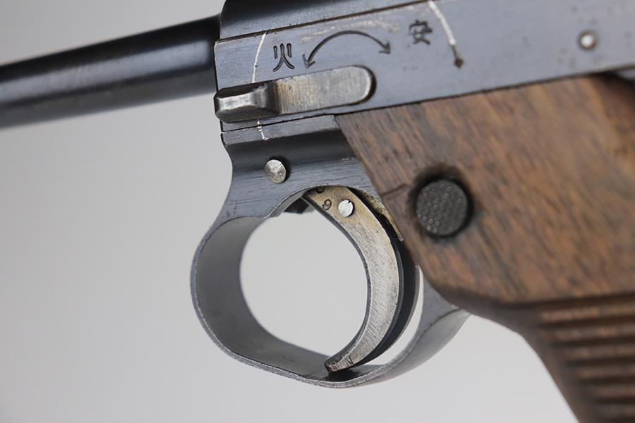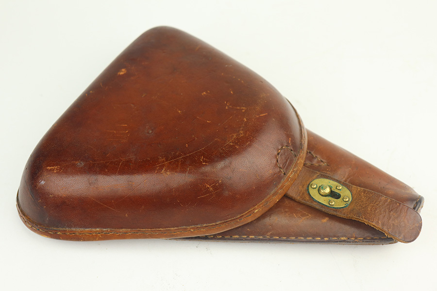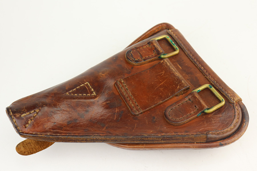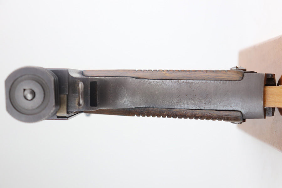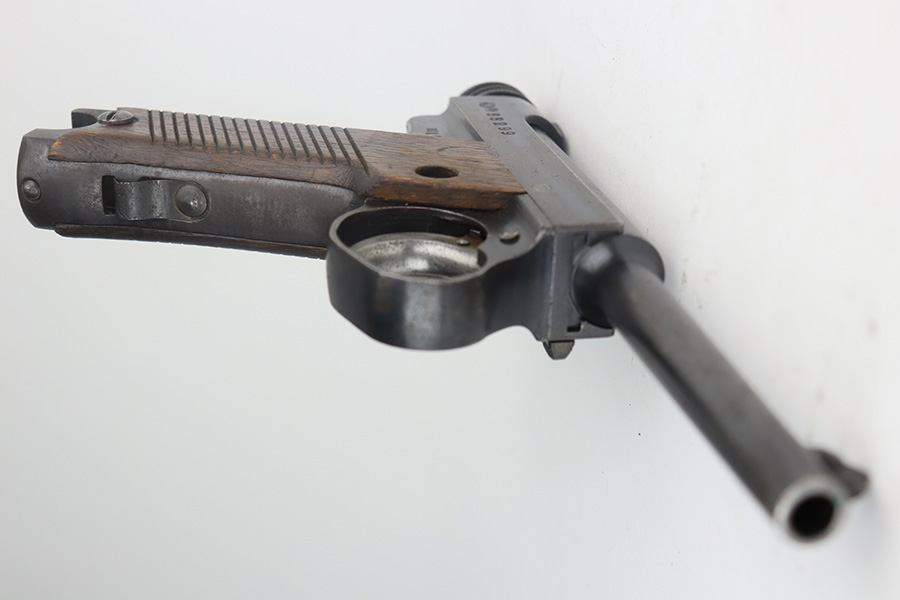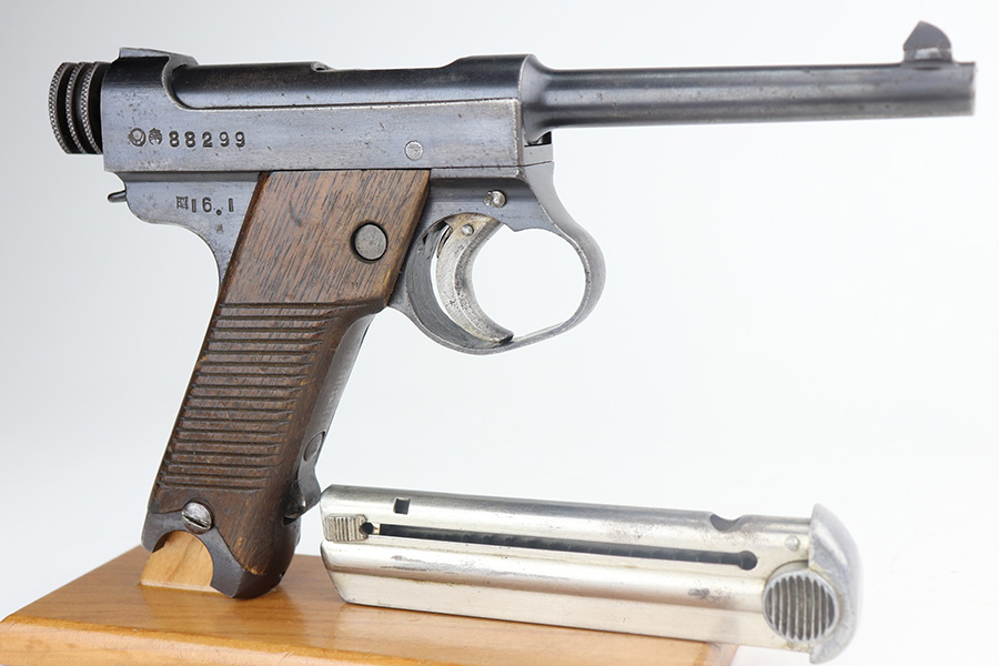 5/17/21 – This is an excellent example of a Nambu Type 14 rig issued to the Japanese military in January of 1941. The gun is all matching and come with an original matching magazine. The gun also comes with an original hard shell holster, cleaning rod, and spare firing pin. The gun has retained about 97% of its original bluing. There is very minor wear on the front strap and on some of the high edges. There is minor pitting throughout. Comes with nice un-numbered grips. The bore is shiny but the rifling is slightly worn.