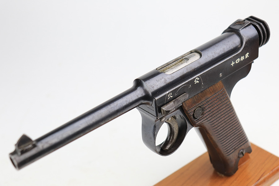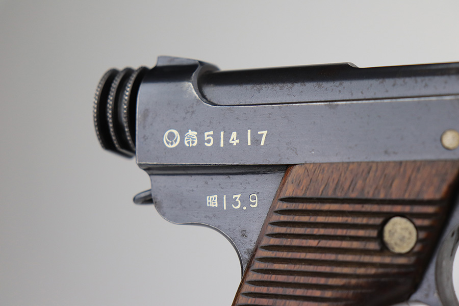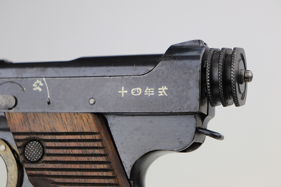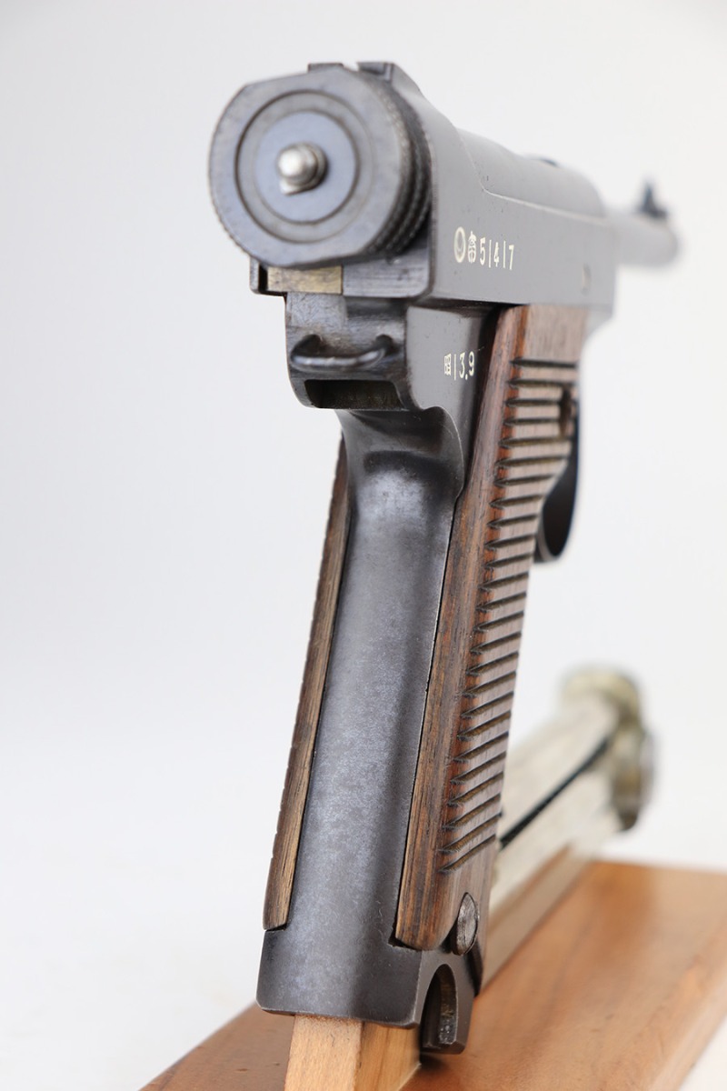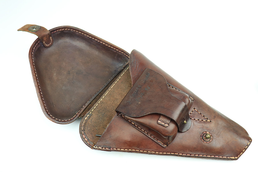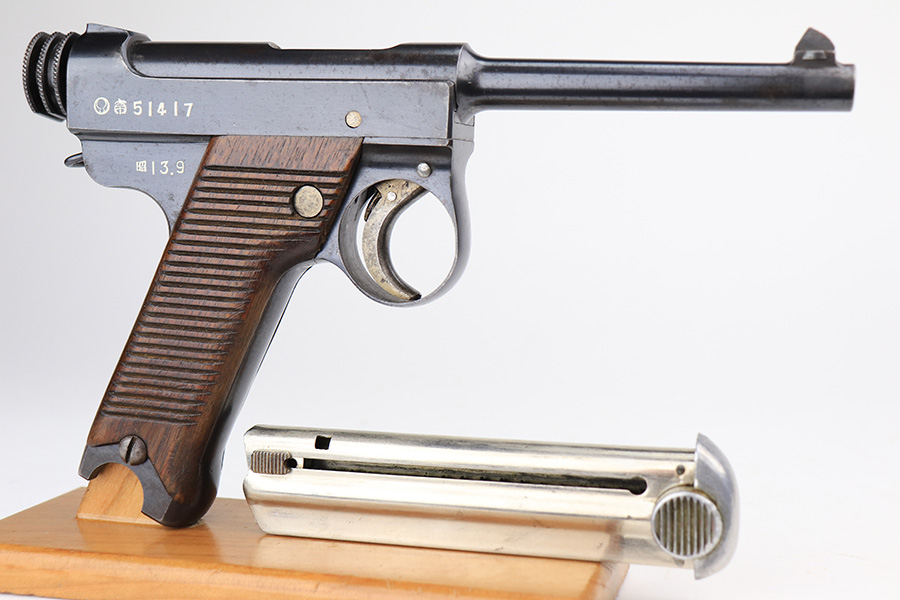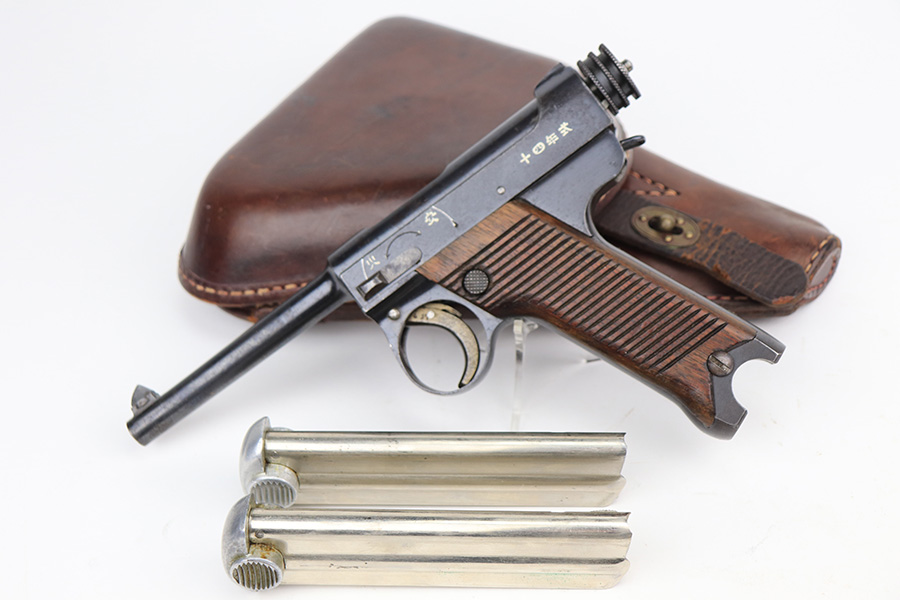 3/4/22 – This is an excellent example of a Nambu Type 14 rig issued to the Japanese military in September of 1938. The gun is all matching and comes as a rig with an excellent hardshell leather holster, blued cleaning rod, and two original matching numbered magazines. The gun has the proper earlier features, such as the small trigger guard and nickeled magazines. “Yokosuka Japan Sept 1945” is scratched into the leather on the inside of the holster, presumably done by the GI who captured it. The gun has retained about 97% of its original bluing. While there is very little actual finish loss, there are tiny dots of oxidation throughout. Comes with excellent period-correct wood grips. They are hand-numbered on the inside to match the gun. The bore is shiny with good rifling.