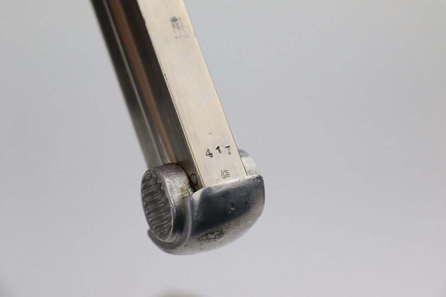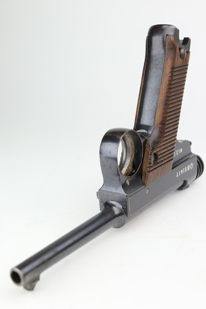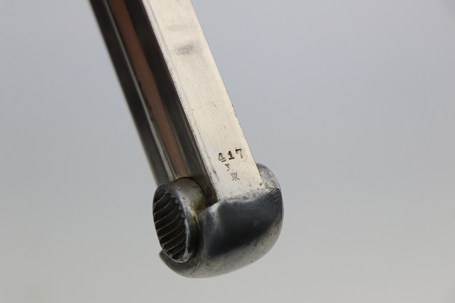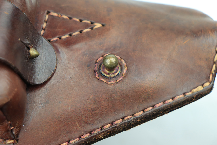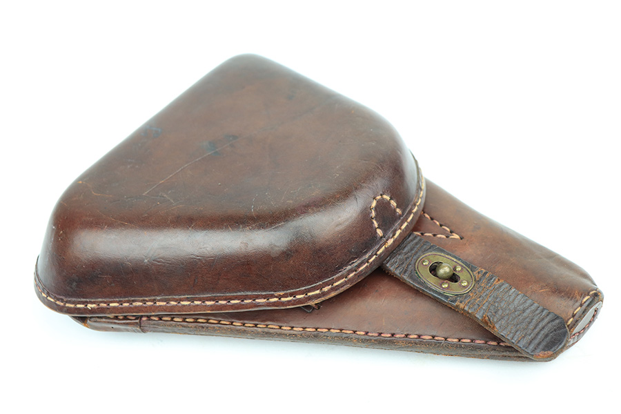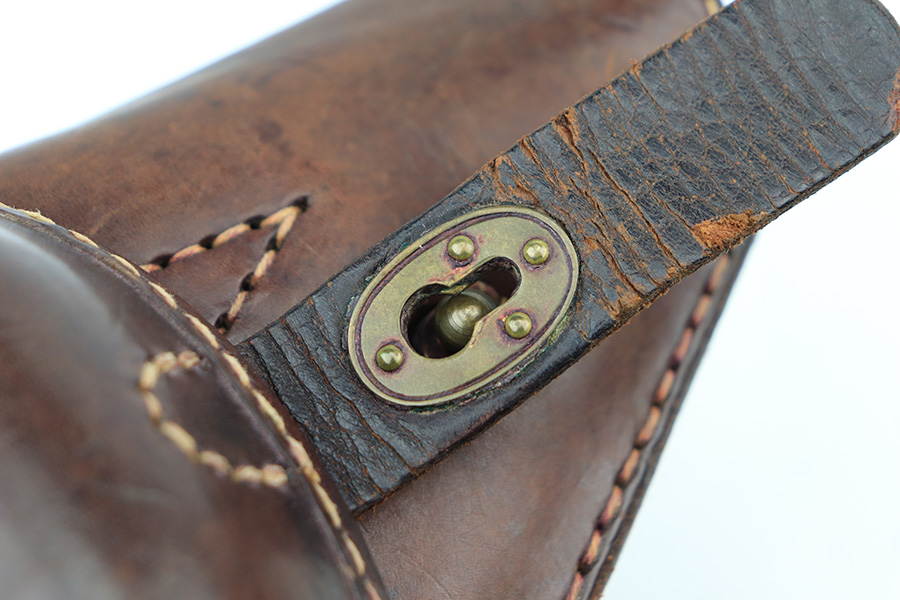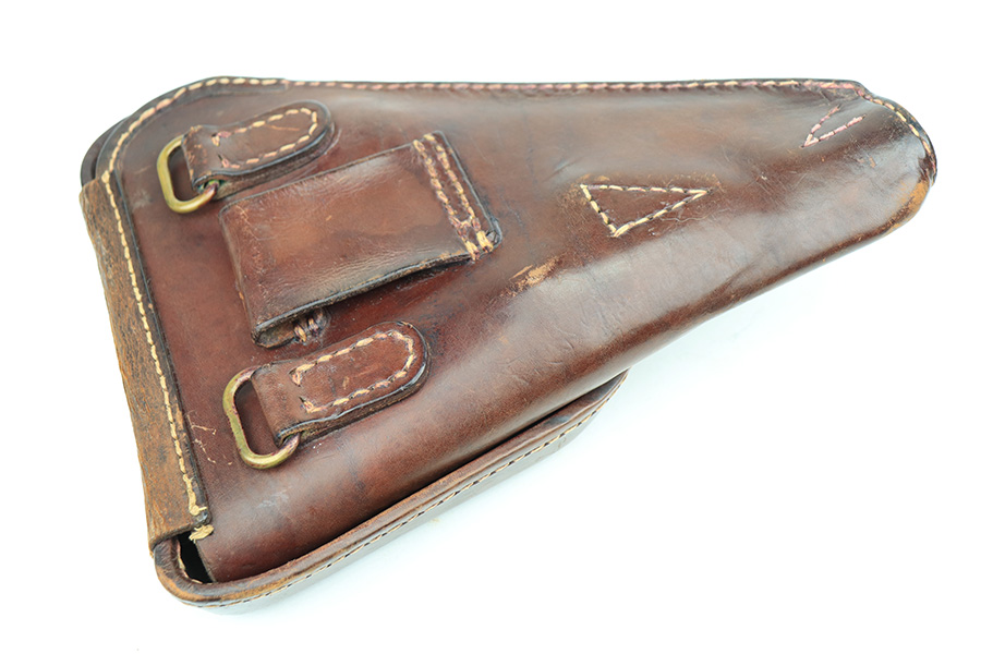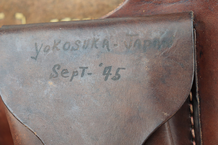 3/4/22 – This is an excellent example of a Nambu Type 14 rig issued to the Japanese military in September of 1938. The gun is all matching and comes as a rig with an excellent hardshell leather holster, blued cleaning rod, and two original matching numbered magazines. The gun has the proper earlier features, such as the small trigger guard and nickeled magazines. “Yokosuka Japan Sept 1945” is scratched into the leather on the inside of the holster, presumably done by the GI who captured it. The gun has retained about 97% of its original bluing. While there is very little actual finish loss, there are tiny dots of oxidation throughout. Comes with excellent period-correct wood grips. They are hand-numbered on the inside to match the gun. The bore is shiny with good rifling.