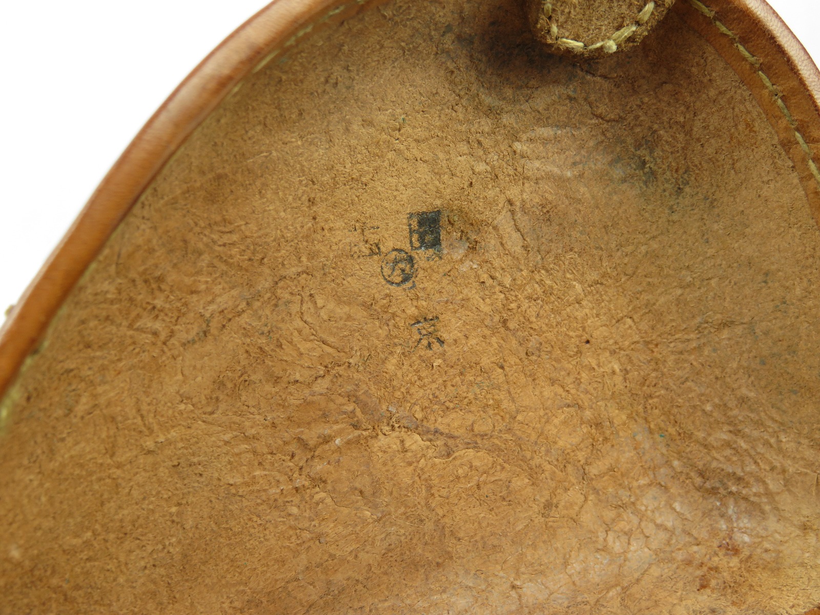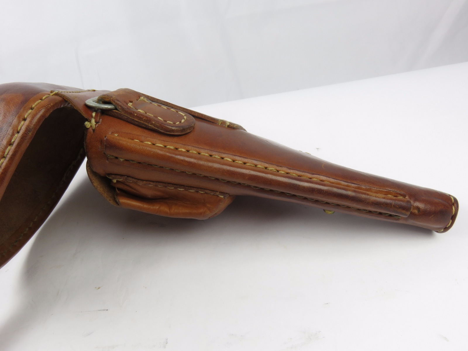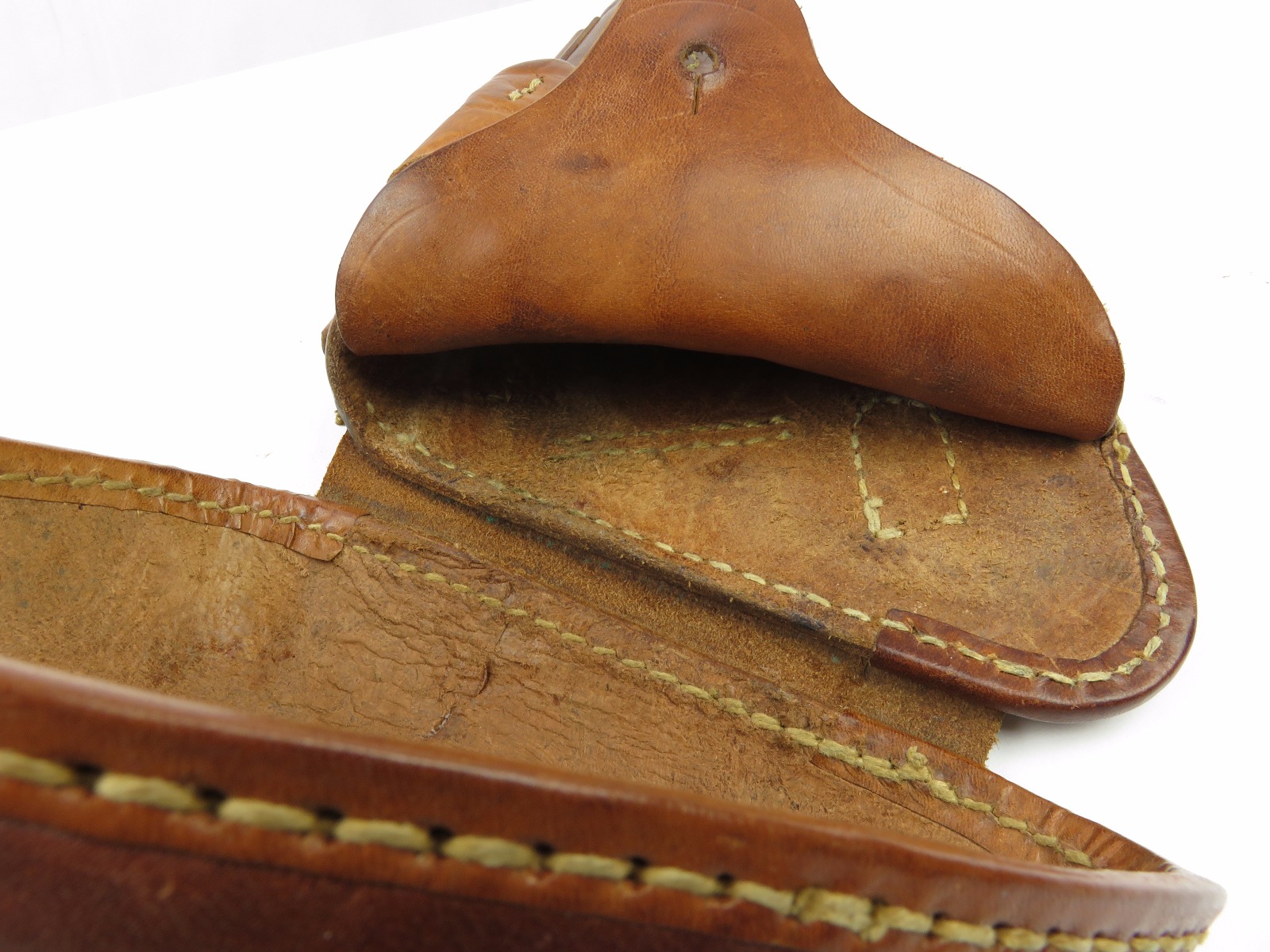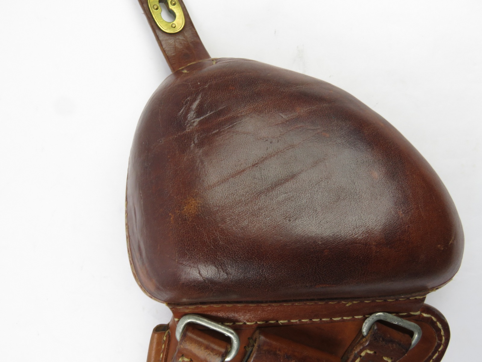 8/15/17 – This is an original Nambu Type 26 Revolver holster. The holster has excellent light brown leather and all original stitching. The only flaw is a wrinkle in the top lid of leather. The photos clearly show this minor flaw, and the rest of the leather is firm and excellent. There are no stitching issues either. The holster is ink stamped on the interior lid. Has nice early brass knobs and fixtures. Guaranteed original and authentic.