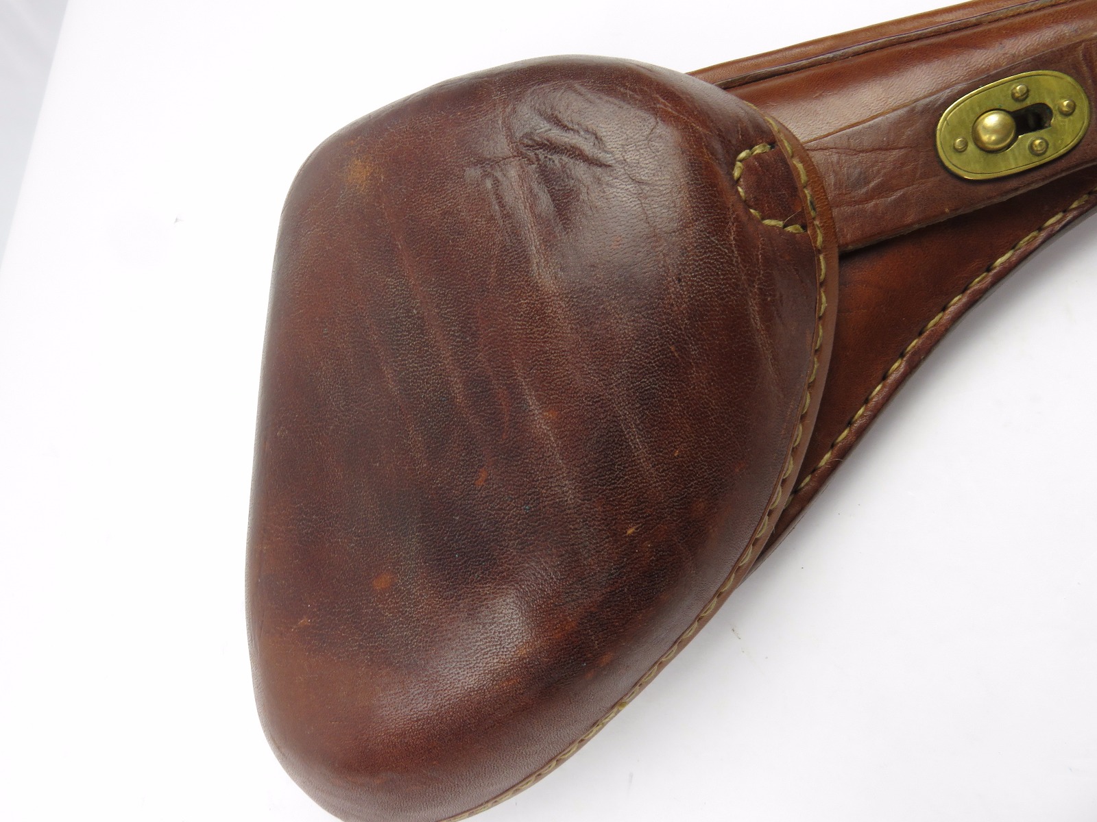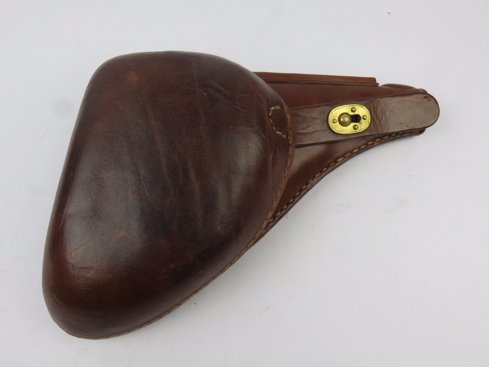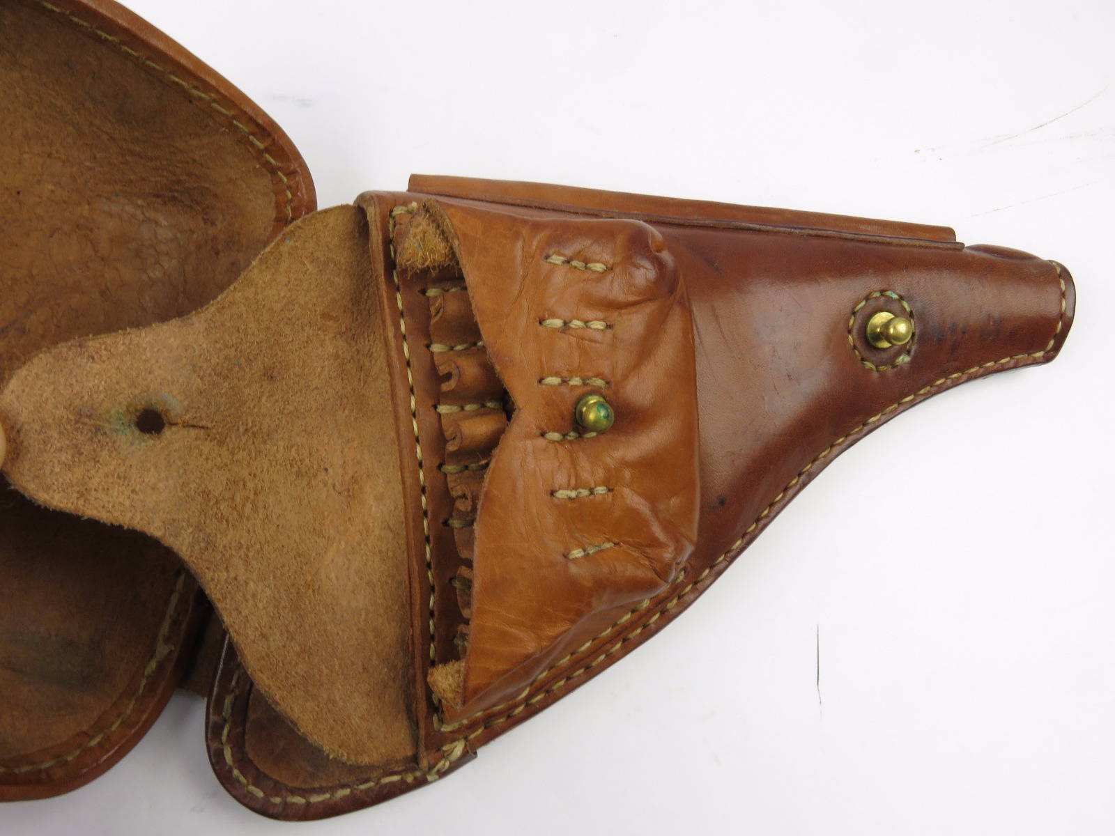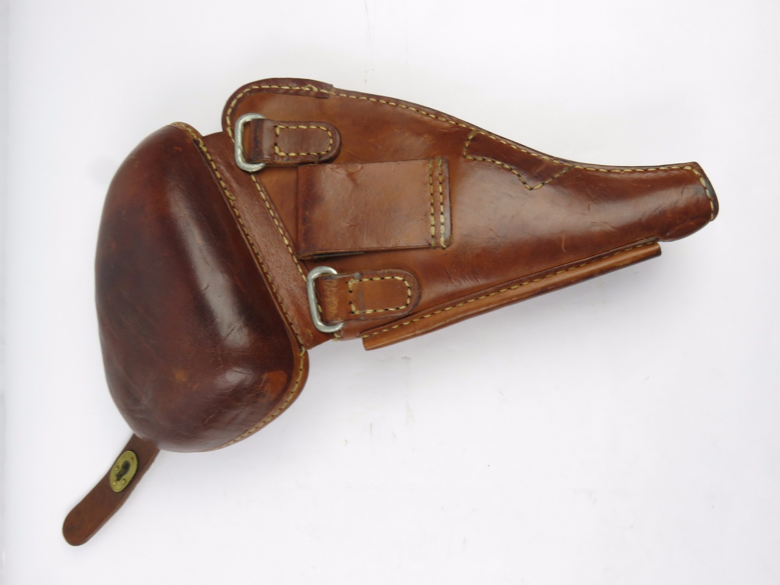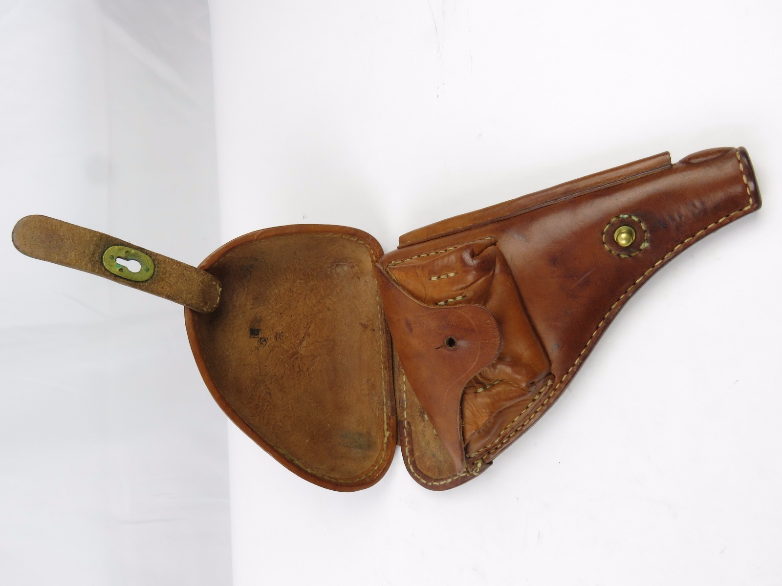 8/15/17 – This is an original Nambu Type 26 Revolver holster. The holster has excellent light brown leather and all original stitching. The only flaw is a wrinkle in the top lid of leather. The photos clearly show this minor flaw, and the rest of the leather is firm and excellent. There are no stitching issues either. The holster is ink stamped on the interior lid. Has nice early brass knobs and fixtures. Guaranteed original and authentic.