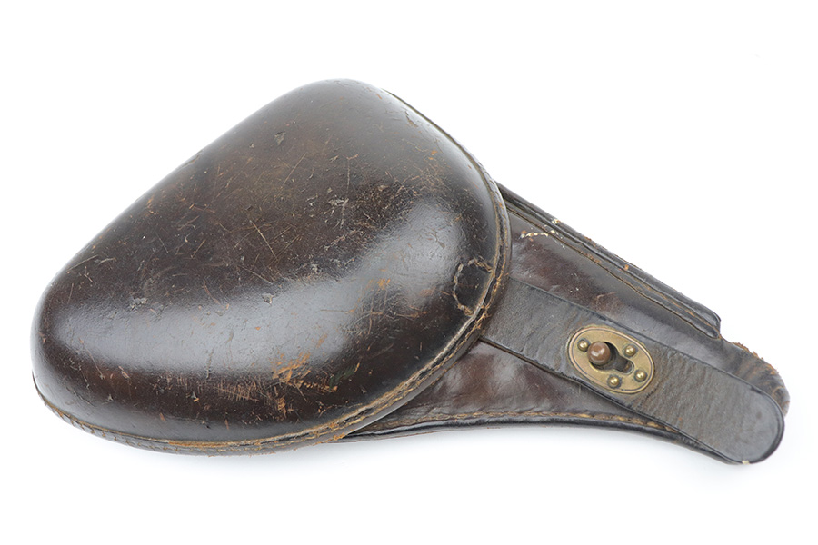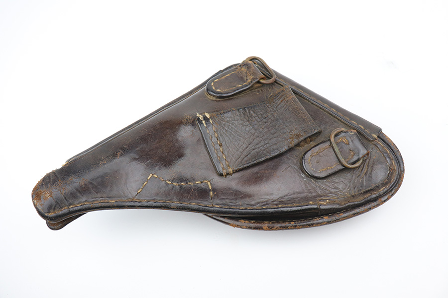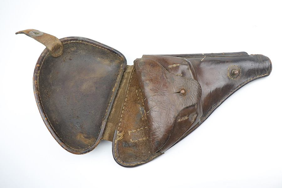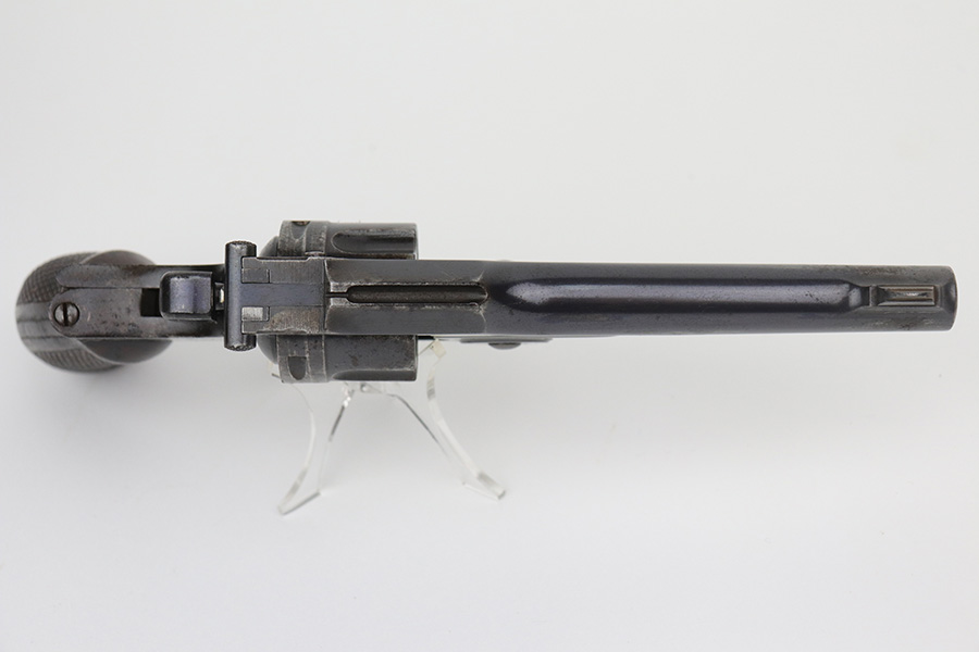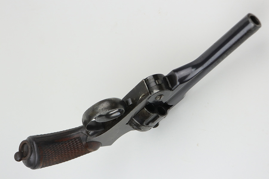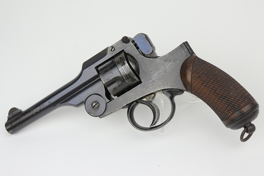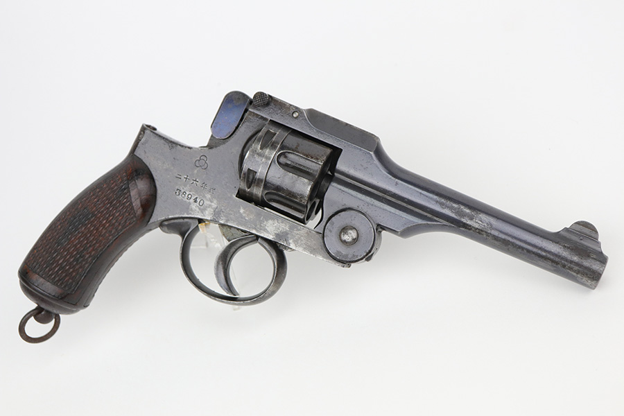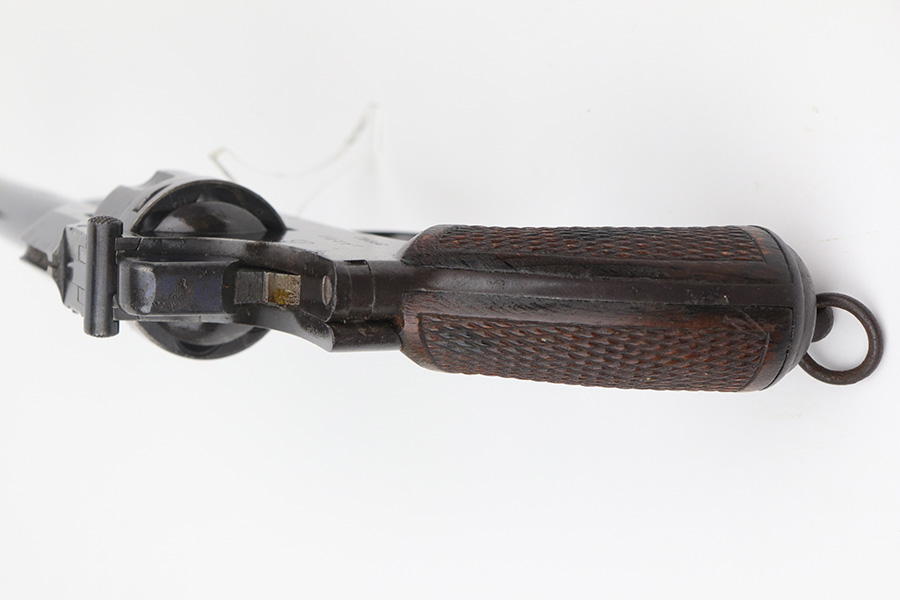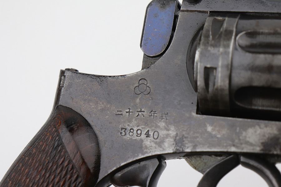 11/24/21 – – This is an original example of a Nambu Type 26 revolver and holster. The Type 26 or Model 26 “hammerless” revolver was the first modern revolver adopted by the Imperial Japanese Army. It was developed at the Koishikawa Arsenal and is named for its year of adoption in the Japanese dating system (the 26th year of the reign of the Meiji emperor, i.e., 1893). The revolver saw action in conflicts including the Russo-Japanese War, World War I and World War II. This particular gun has retained roughly 60% of its original finish. Notable wear on all sides, with some freckling on the barrel and cylinder. Bore is excellent though and the revolver appears to function properly. Excellent grips. Holster shows some wear and a small hole near the toe, but includes the cleaning rod. NOTE: This revolver has a few mechanical issues/missing parts that would affect functionality. It’s missing the barrel latch plunger and the tension spring in the barrel cam. The tension spring may not affect function but the barrel latch plunger affects the barrel latching properly each time. The grip screw on right grip is stripped, and the hand that advances the cylinder is beat up on the end, which affects the hammer releasing correctly. So this is a bit of a minor project gun for whoever may buy it.