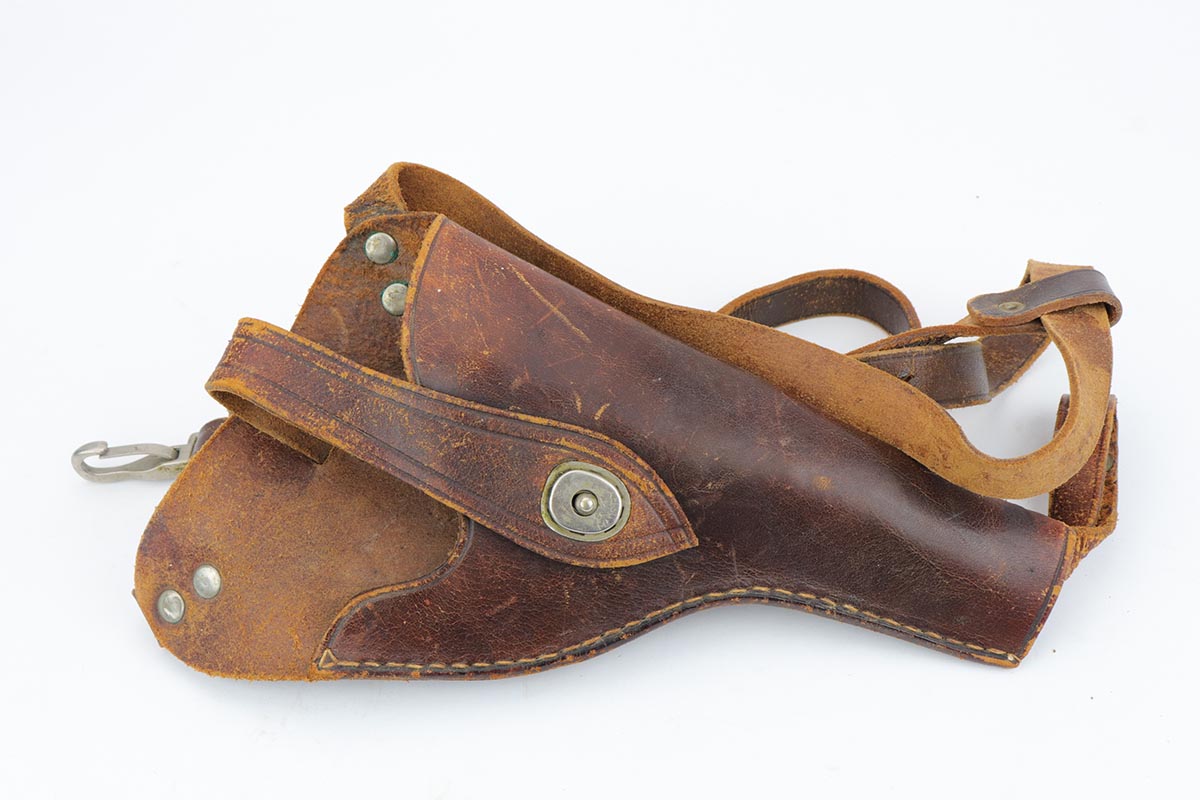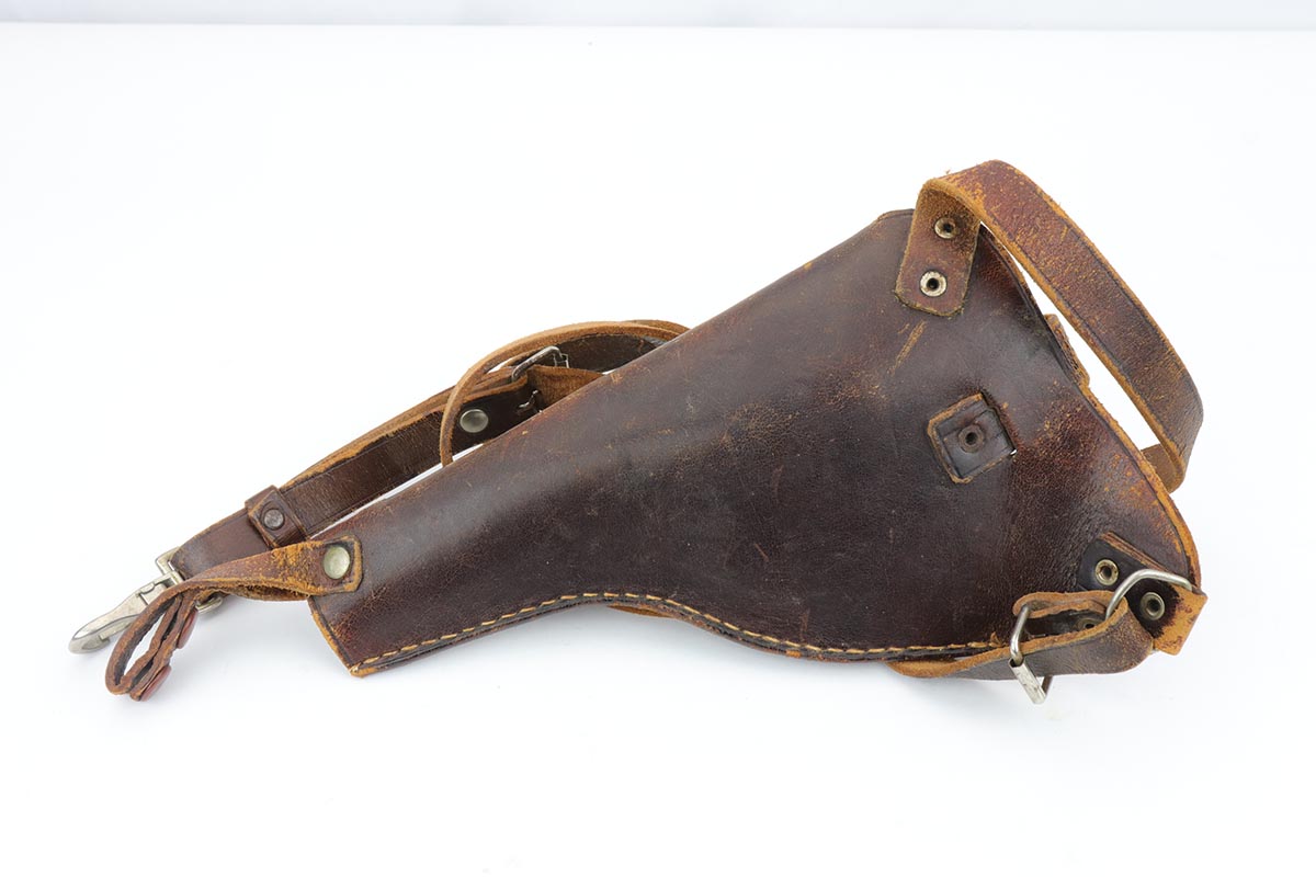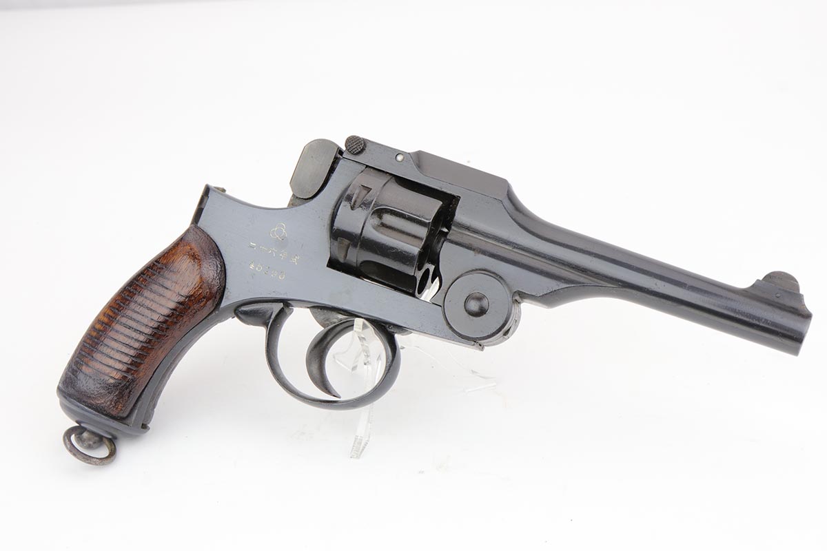 12/18/19 – This is a nice example of a Nambu Type 26 revolver with what appears to be an American shoulder holster. The Type 26 or Model 26 “hammerless” revolver was the first modern revolver adopted by the Imperial Japanese Army. It was developed at the Koishikawa Arsenal and is named for its year of adoption in the Japanese dating system (the 26th year of the reign of the Meiji emperor, i.e., 1893). The revolver saw action in conflicts including the Russo-Japanese War, World War I and World War II. This particular revolver has nearly 100% bluing but appears to be Arsenal refurbished, which isn’t uncommon for this model. The bore is mint, and grips are excellent. The action on the gun is a little clunky though, and seemingly the lockup/timing can get a little off. The holster is in good condition with minor age and wear.