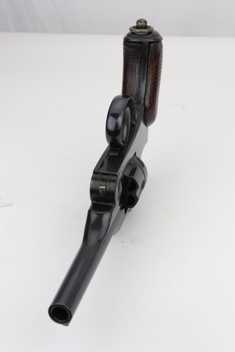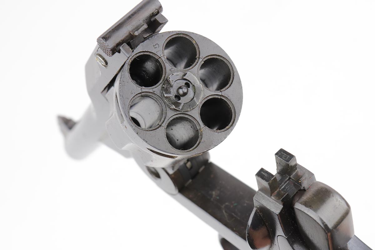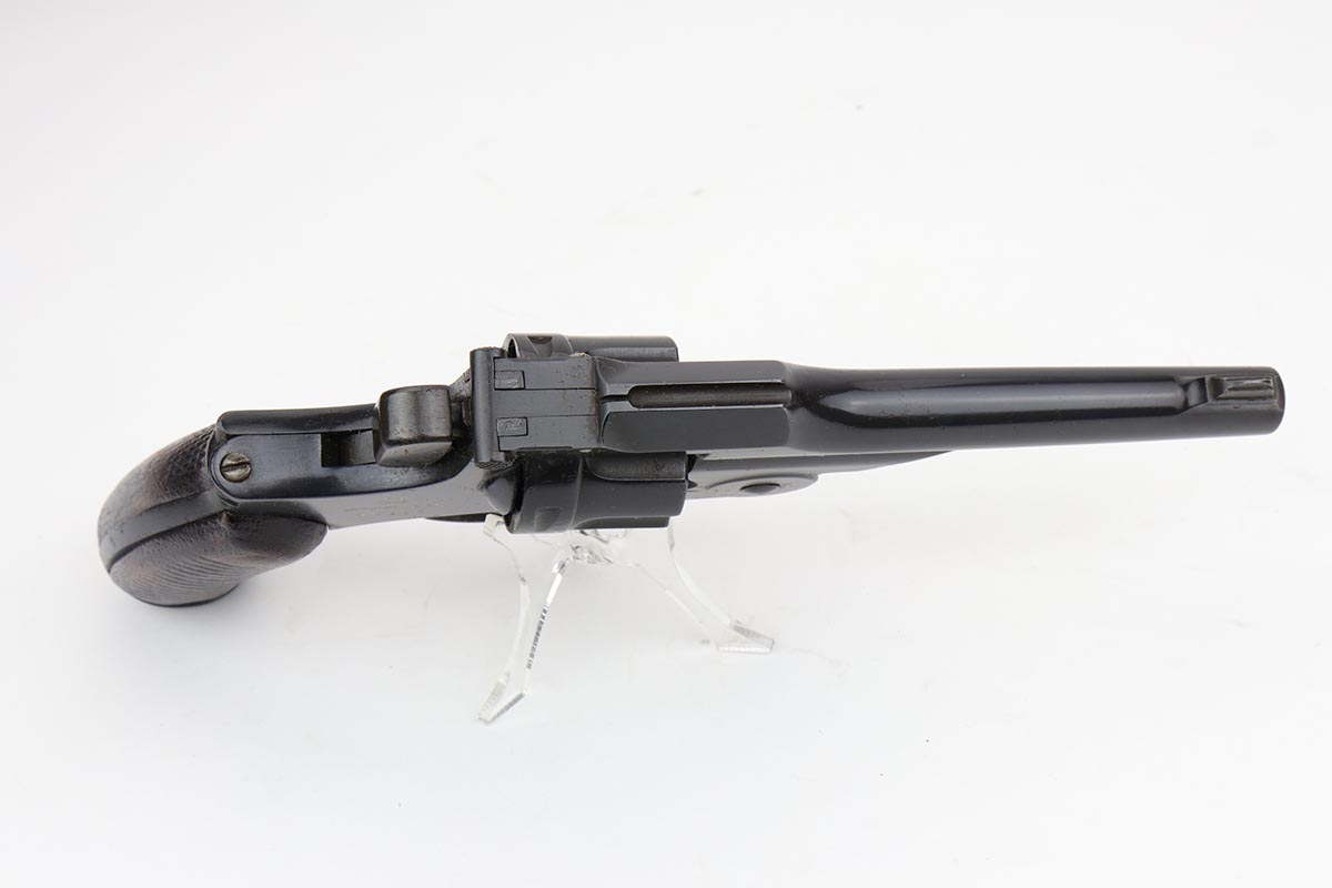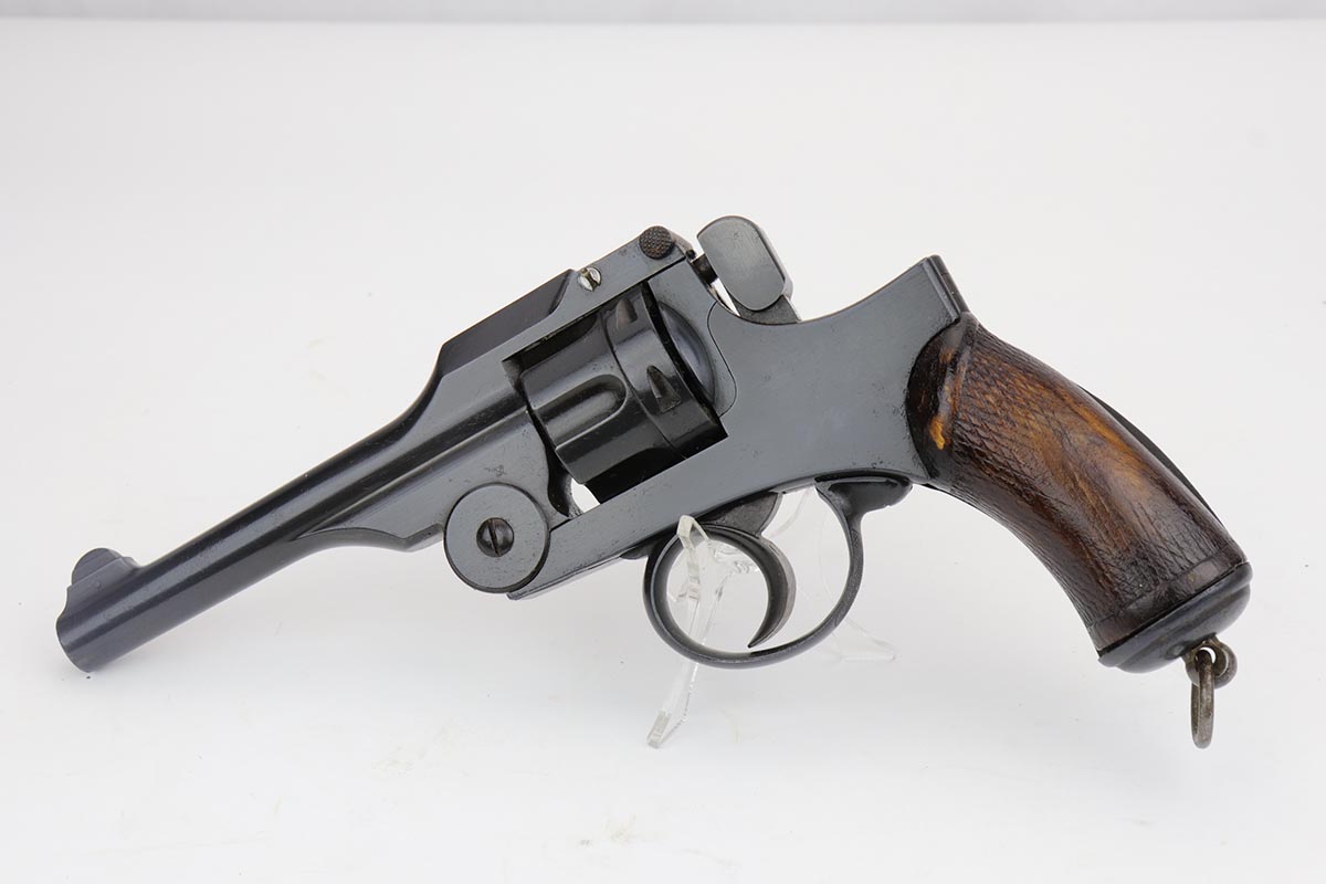 12/18/19 – This is a nice example of a Nambu Type 26 revolver with what appears to be an American shoulder holster. The Type 26 or Model 26 “hammerless” revolver was the first modern revolver adopted by the Imperial Japanese Army. It was developed at the Koishikawa Arsenal and is named for its year of adoption in the Japanese dating system (the 26th year of the reign of the Meiji emperor, i.e., 1893). The revolver saw action in conflicts including the Russo-Japanese War, World War I and World War II. This particular revolver has nearly 100% bluing but appears to be Arsenal refurbished, which isn’t uncommon for this model. The bore is mint, and grips are excellent. The action on the gun is a little clunky though, and seemingly the lockup/timing can get a little off. The holster is in good condition with minor age and wear.