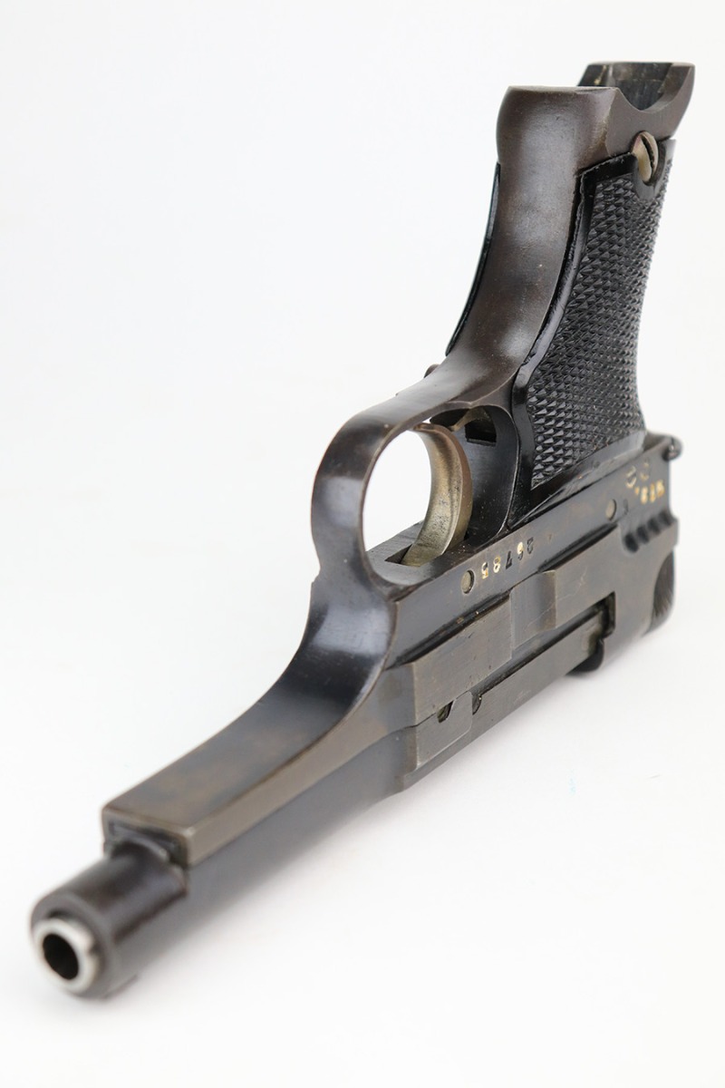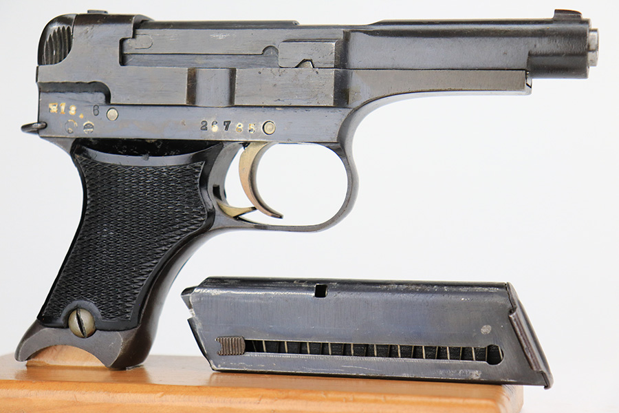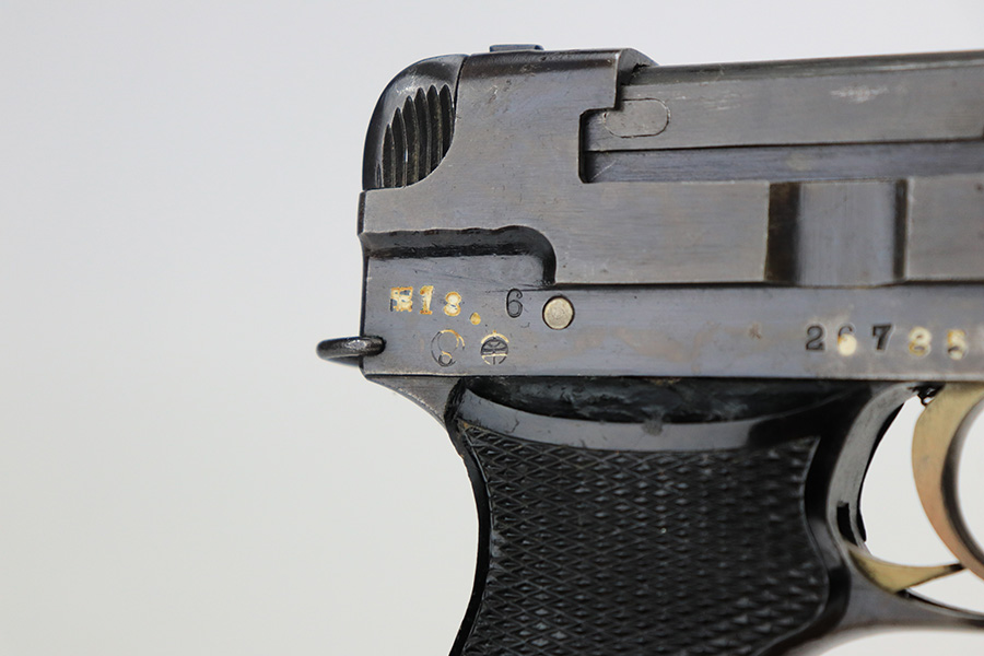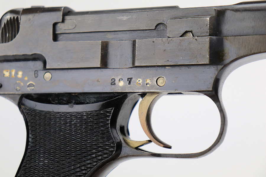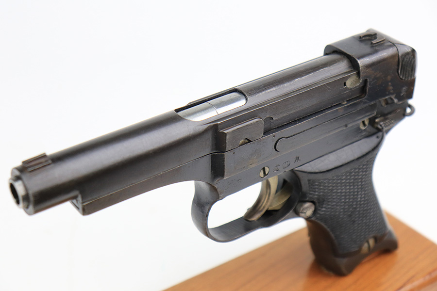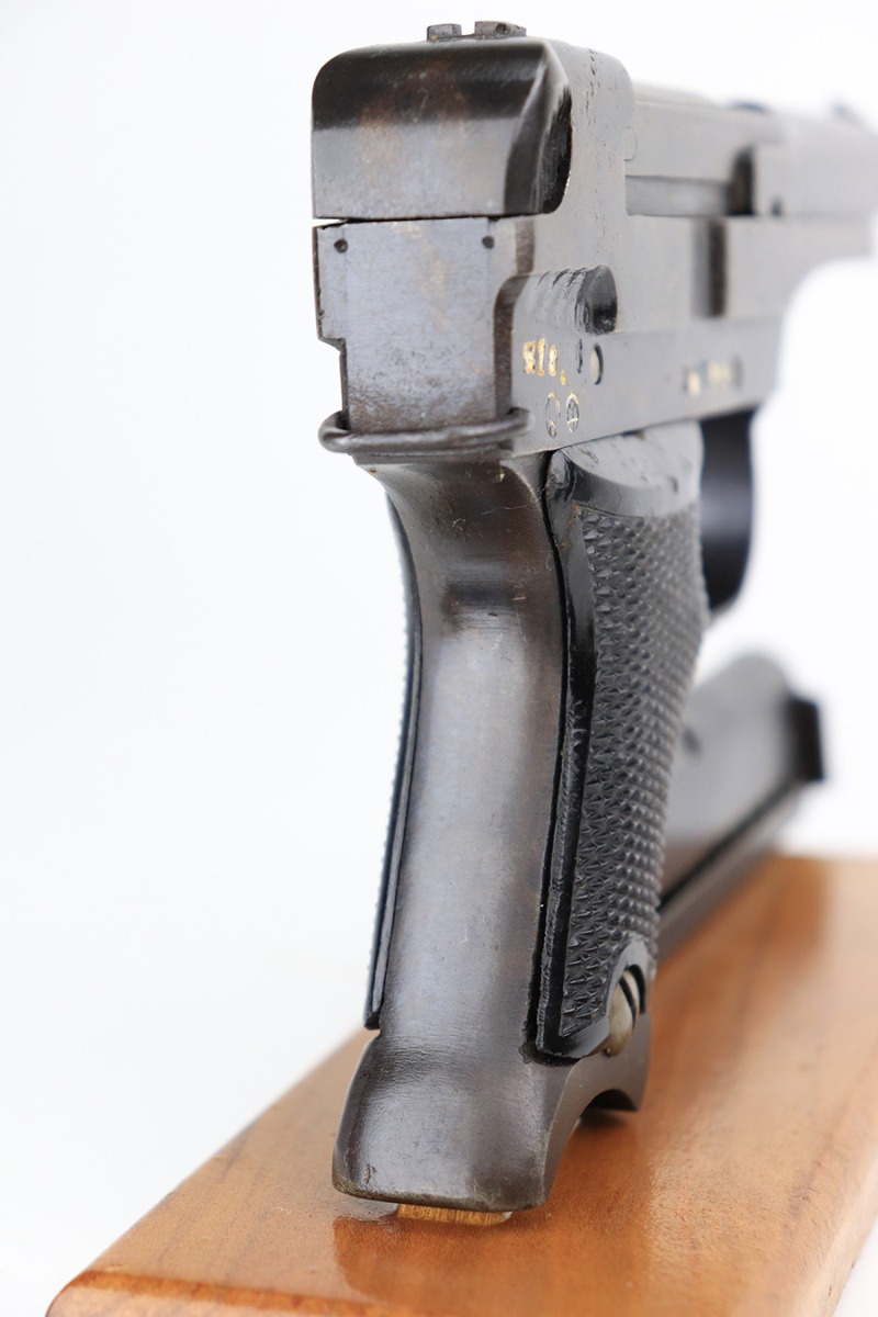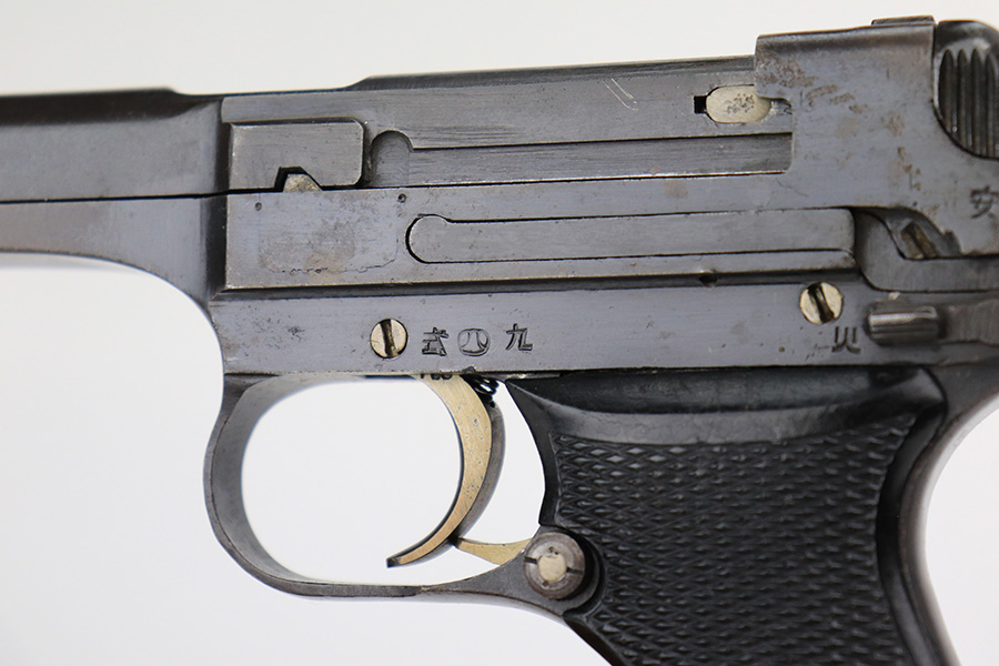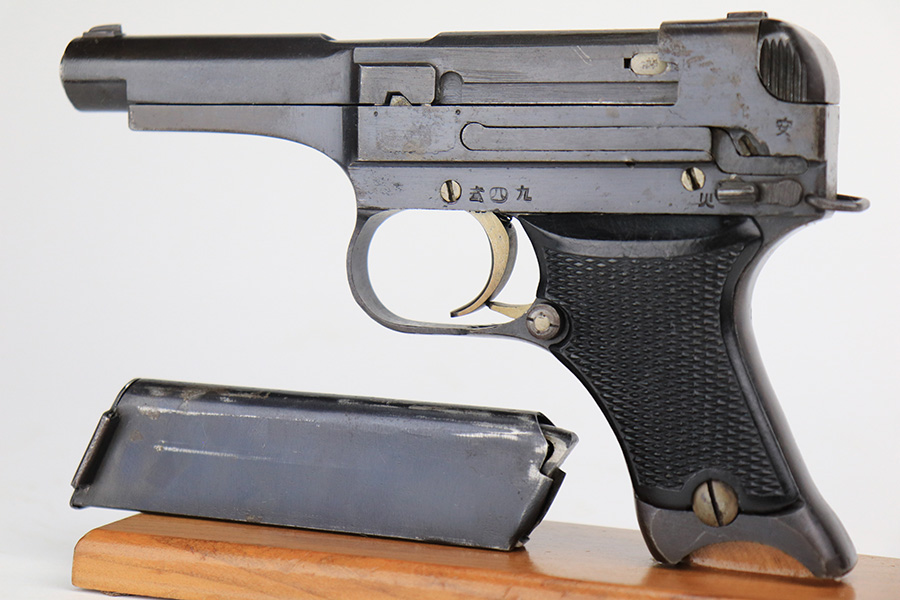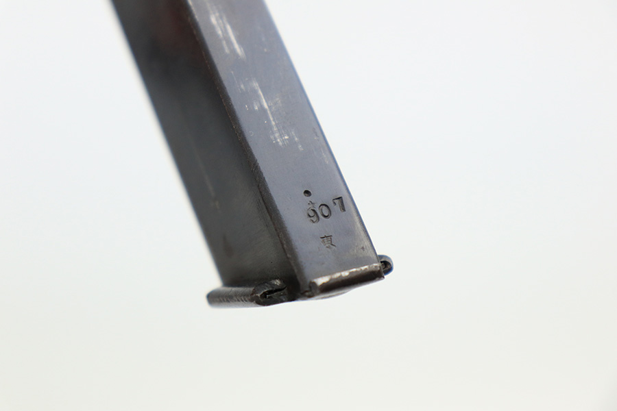 5/19/22 – This is a nice example of a Nambu Type 94 issued to the Japanese military in June of 1943. The gun is all matching and comes with a period-correct magazine that is not matching to the gun. It has retained roughly 85% of its finish. This one is a little difficult to rate, because the majority of the finish loss comes in the form of splotchy discoloration on the whole right side of the gun. Some minor pitting at the back left of the frame. Comes with excellent period-correct black bakelite grips. The bore has strong rifling, but there are some areas of minor pin-pricking throughout.