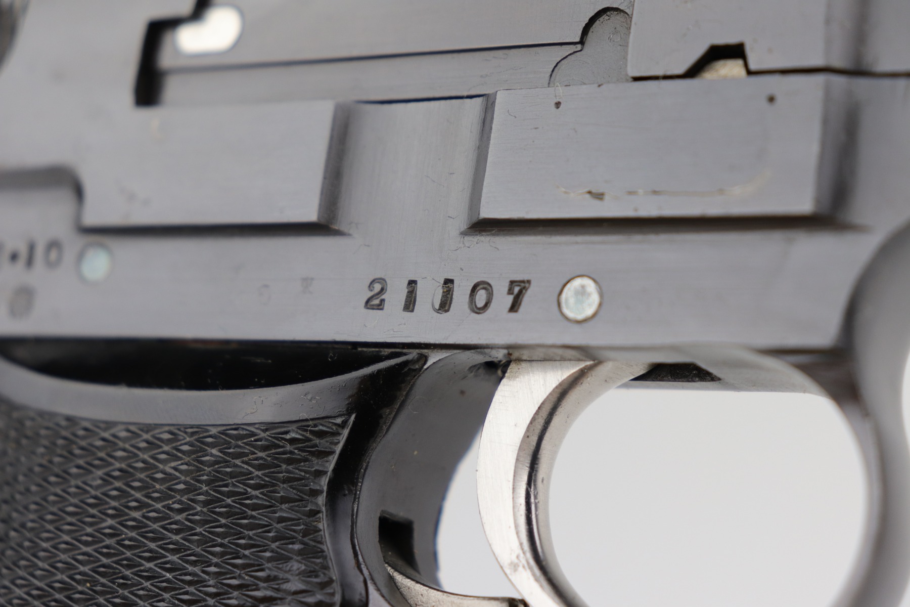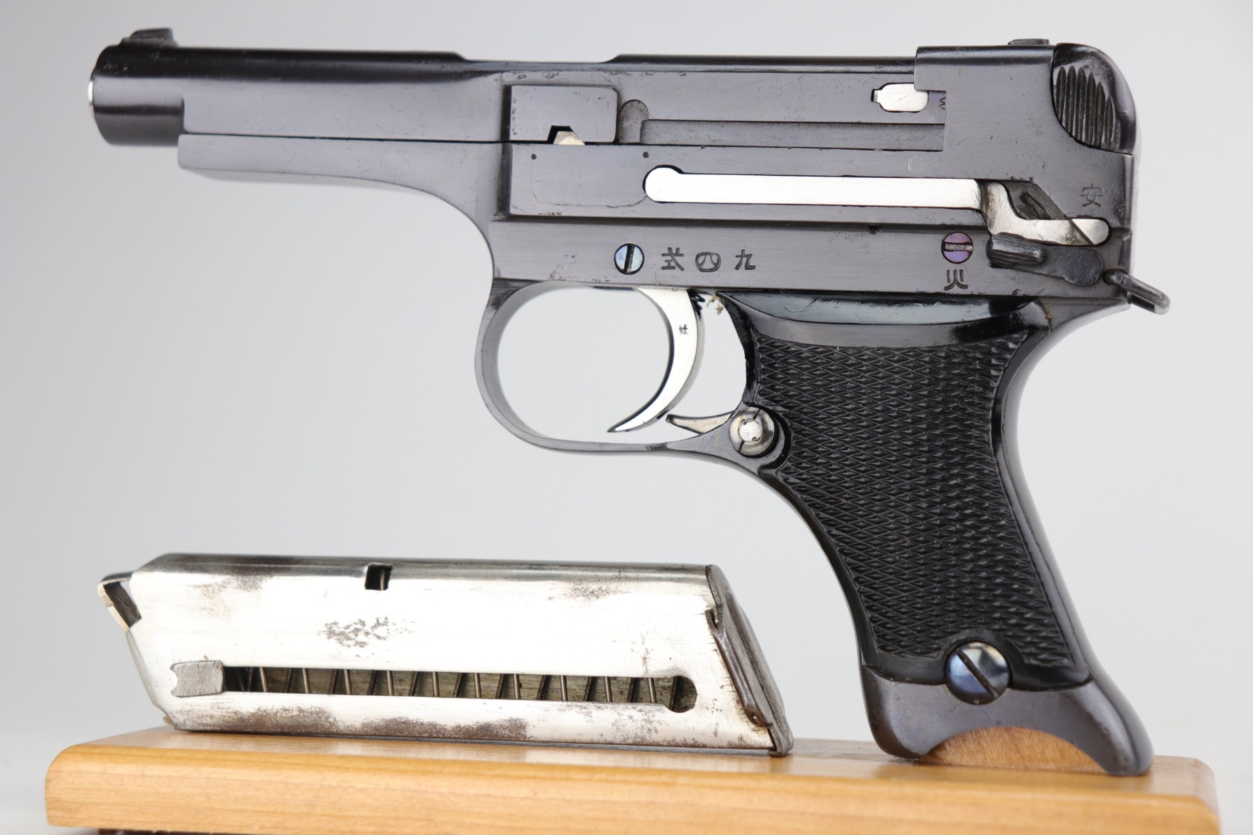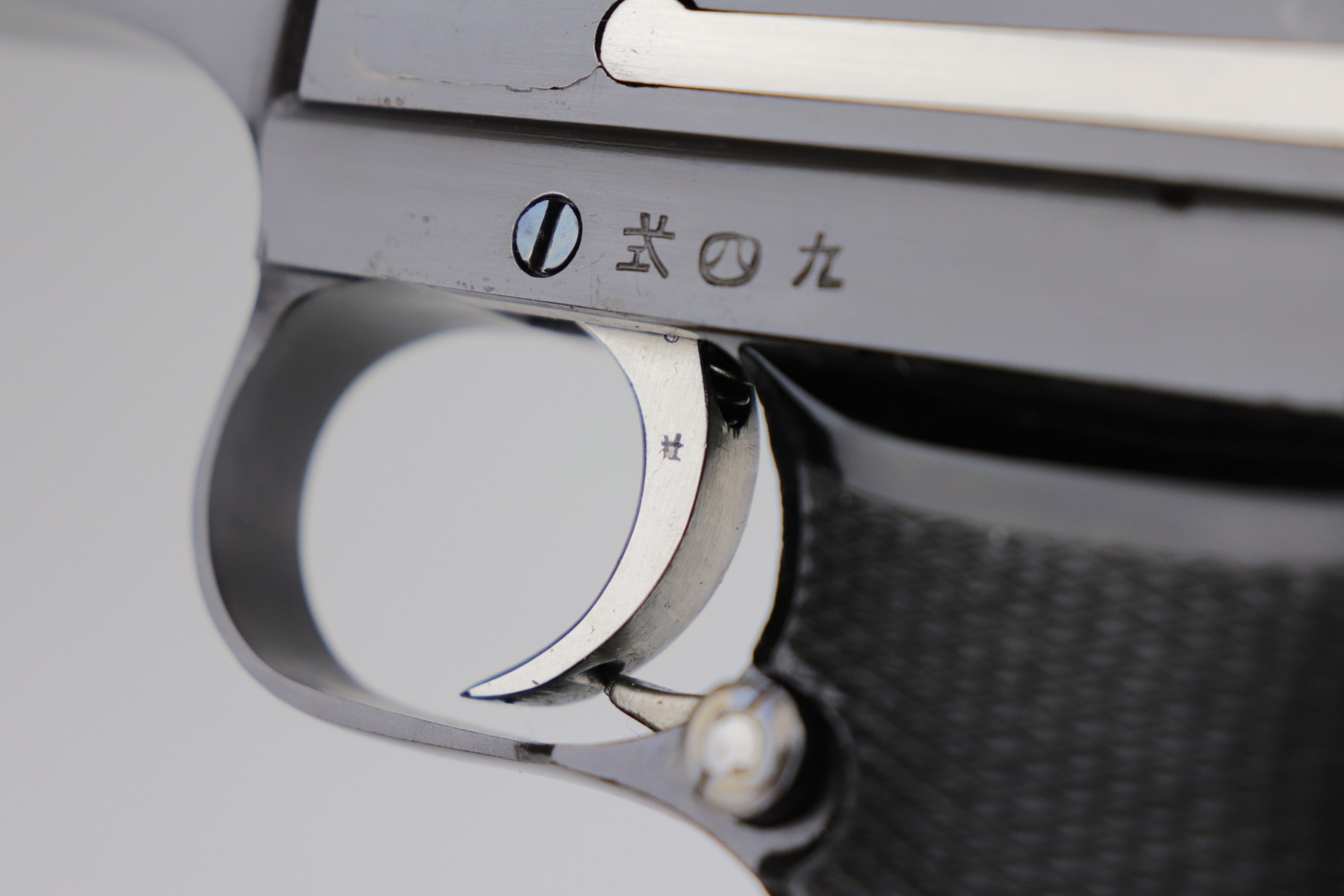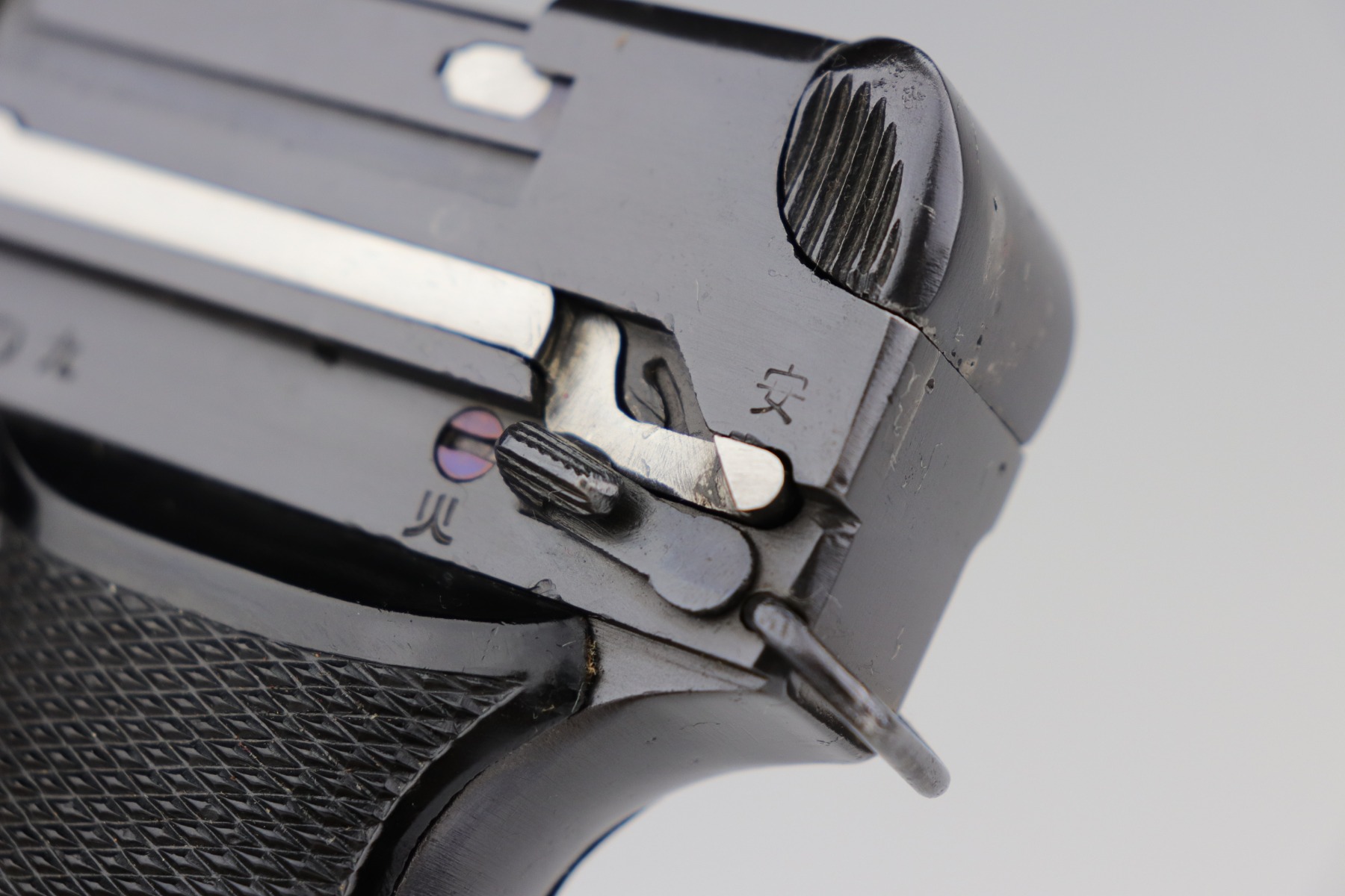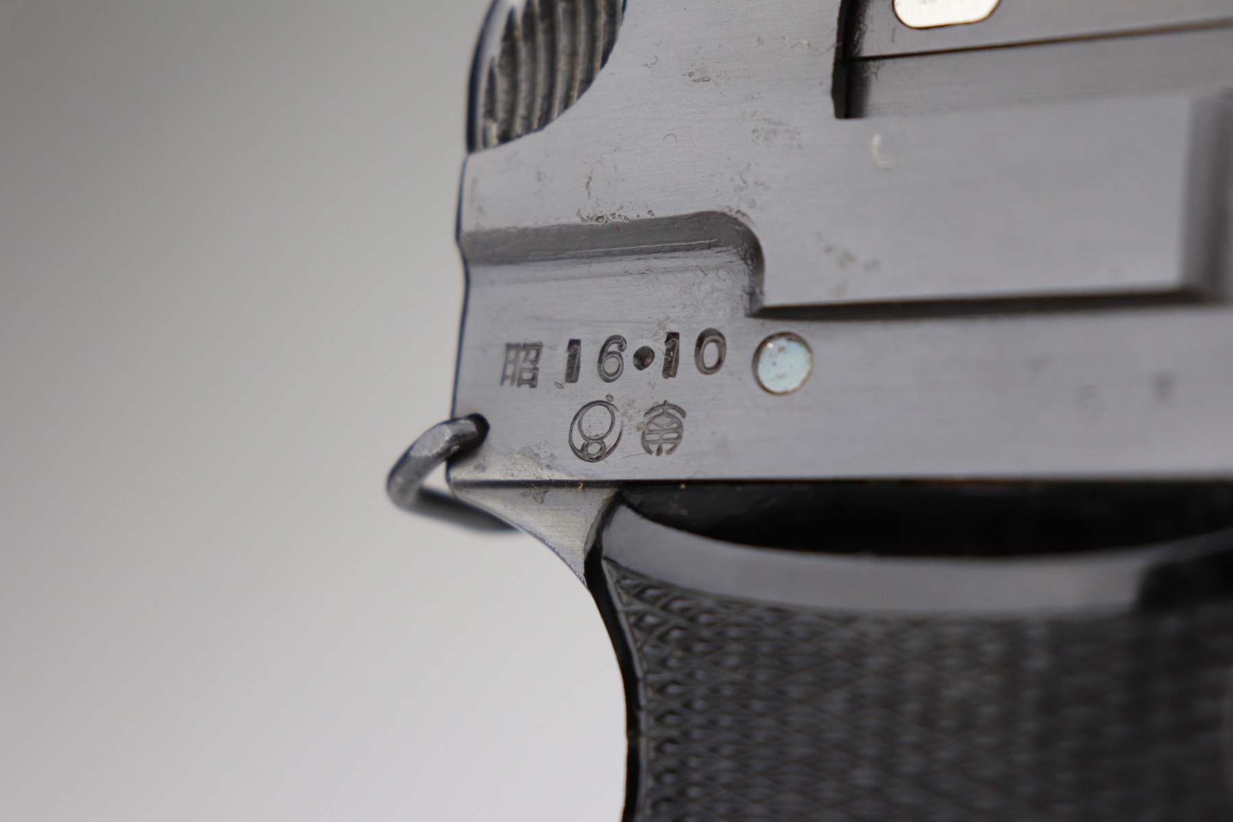 2/5/21 – This is an excellent example of a Nambu Type 94 Rig issued to the Japanese military in October of 1941. It is all matching, and from its appearance we believe it was arsenal re-blued. In any case, the gun has retained virtually all of its finish. There are a few sparse areas of very minor pitting that has been blued over. The gun comes with a period-correct holster and a mismatched period magazine. Very nice bore – shiny with strong rifling and just a few small areas of minor freckling.
