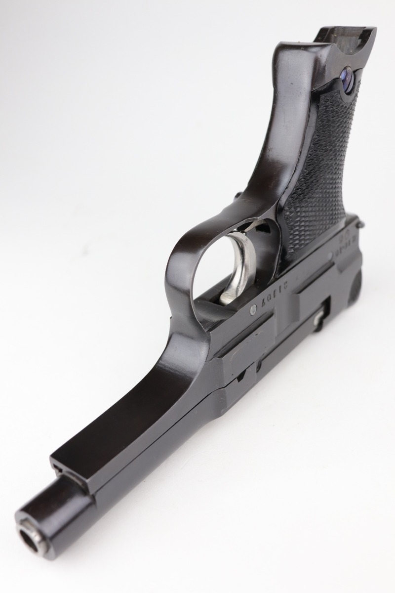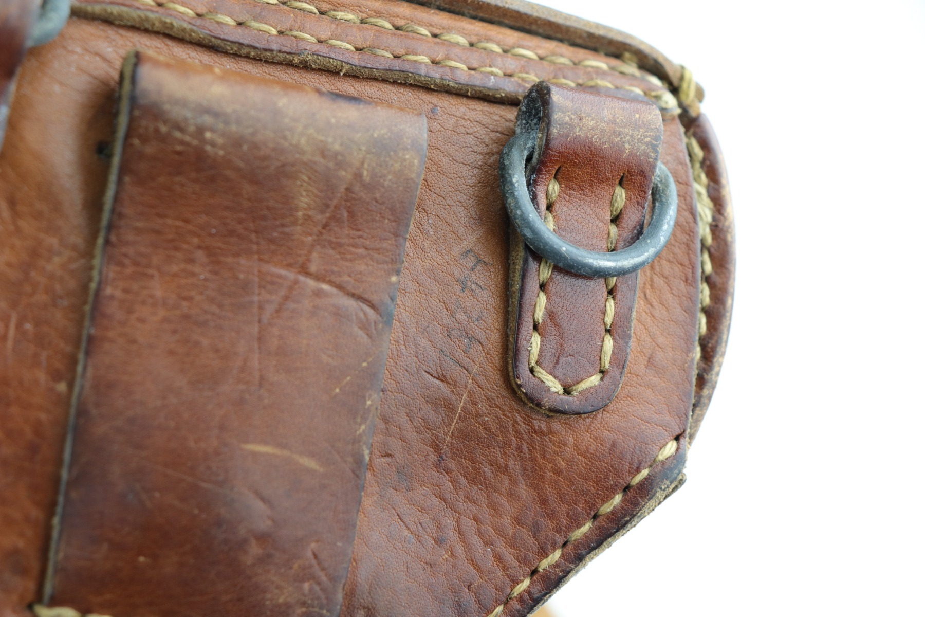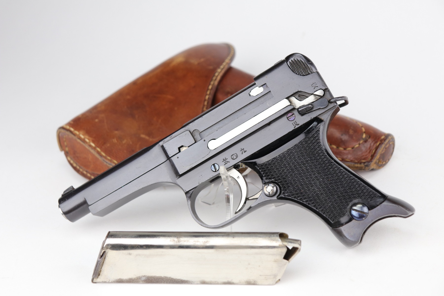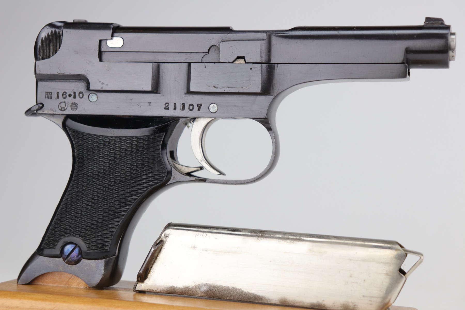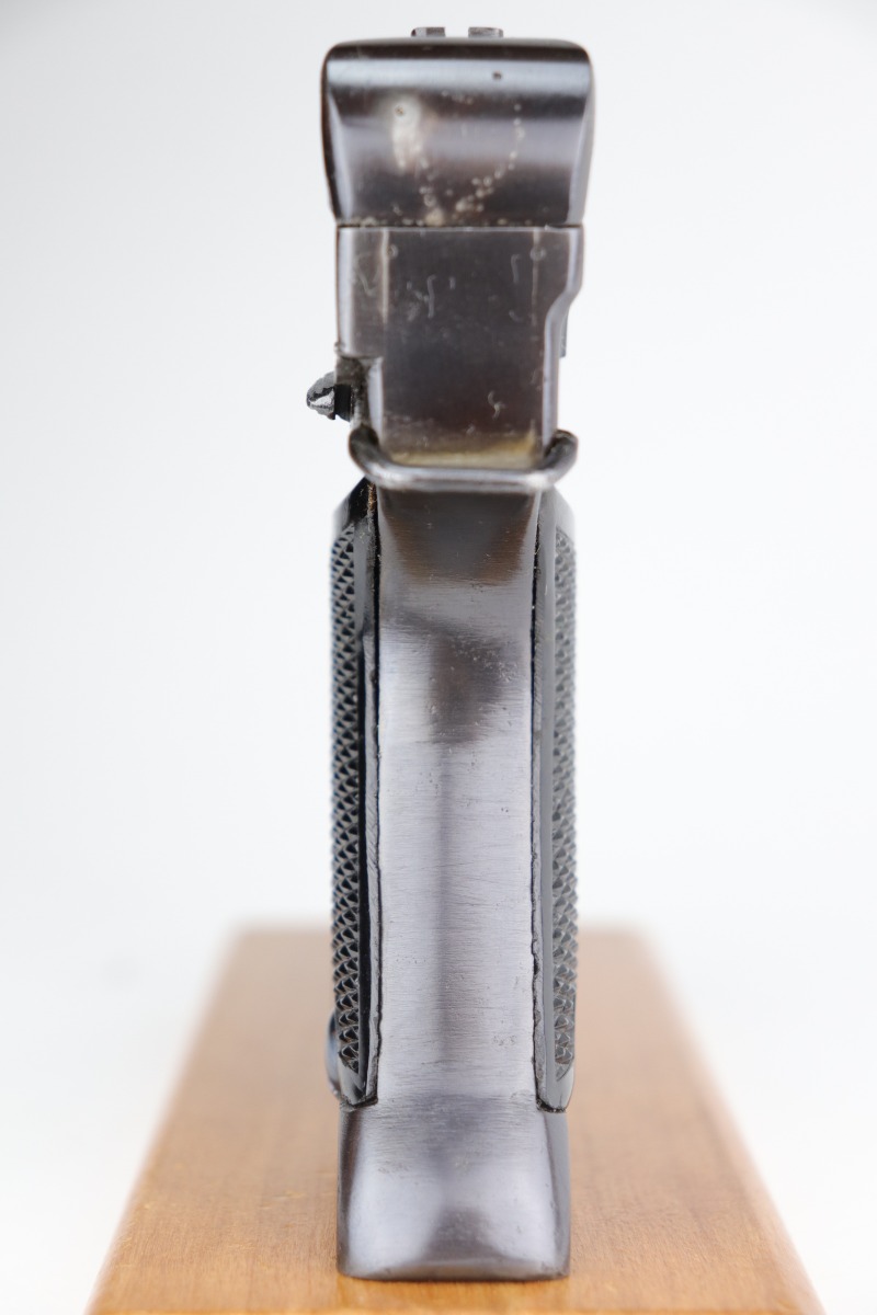2/5/21 – This is an excellent example of a Nambu Type 94 Rig issued to the Japanese military in October of 1941. It is all matching, and from its appearance we believe it was arsenal re-blued. In any case, the gun has retained virtually all of its finish. There are a few sparse areas of very minor pitting that has been blued over. The gun comes with a period-correct holster and a mismatched period magazine. Very nice bore – shiny with strong rifling and just a few small areas of minor freckling.
