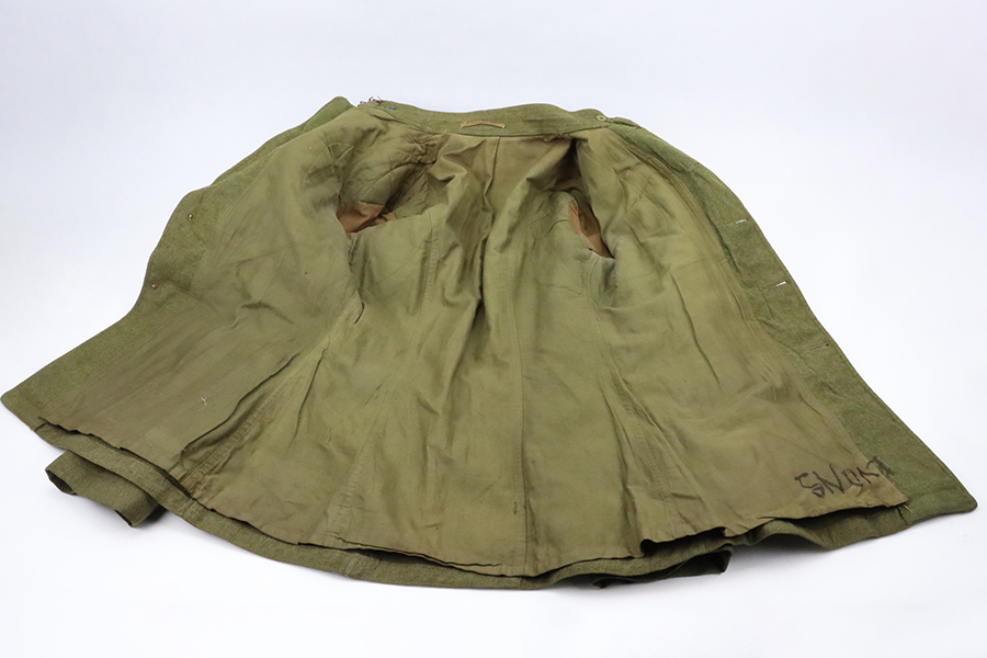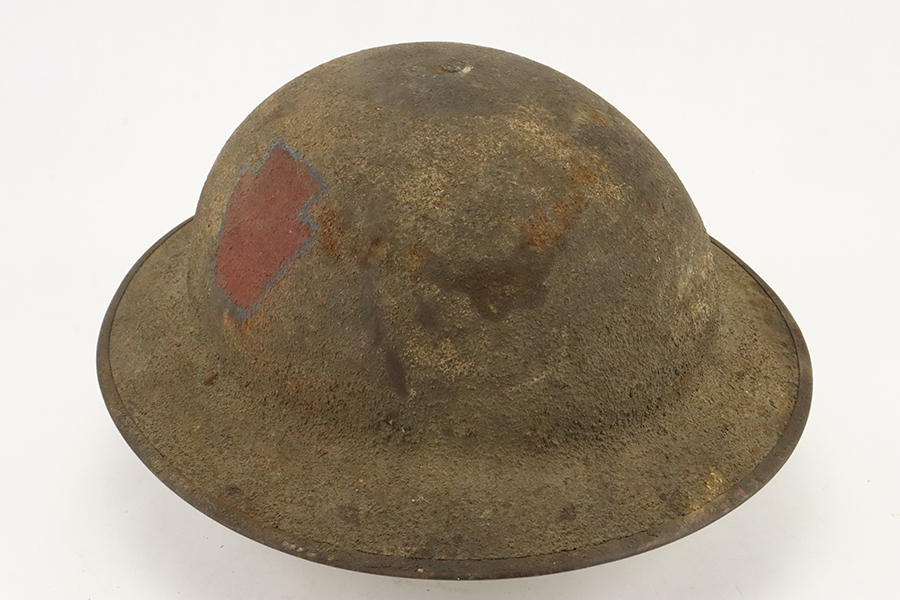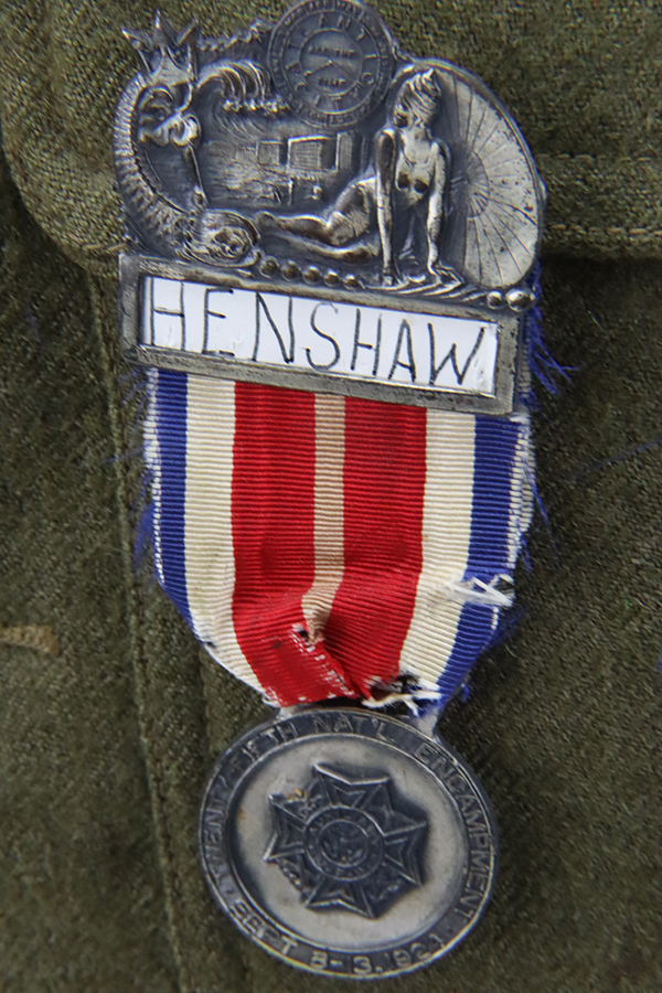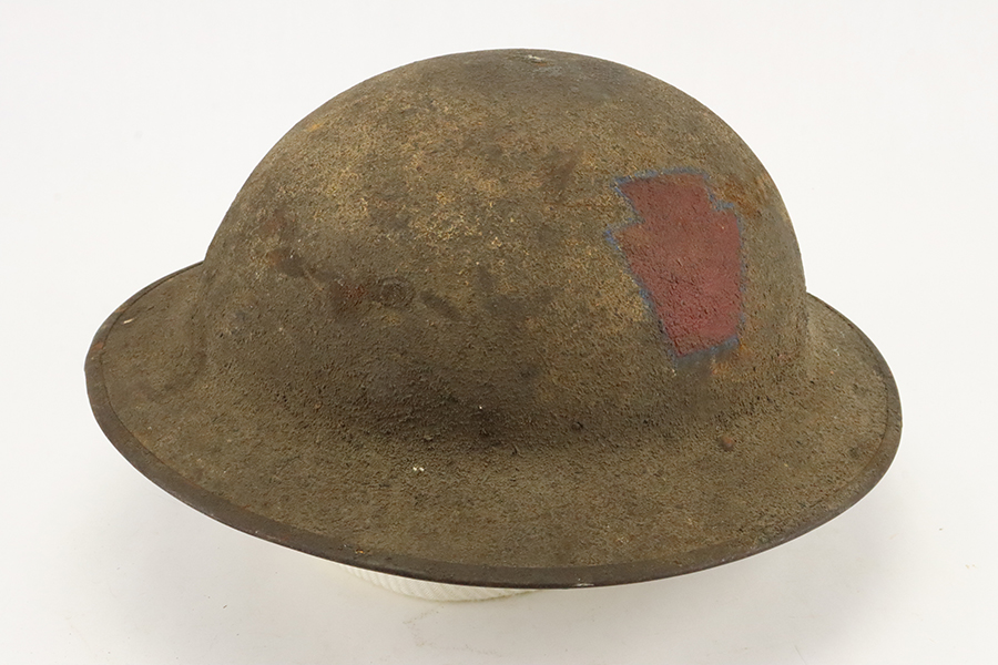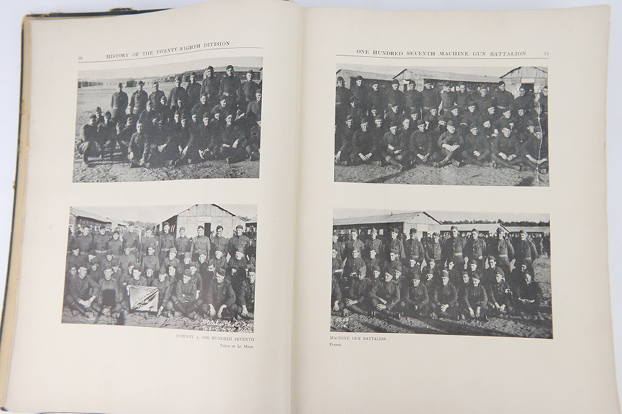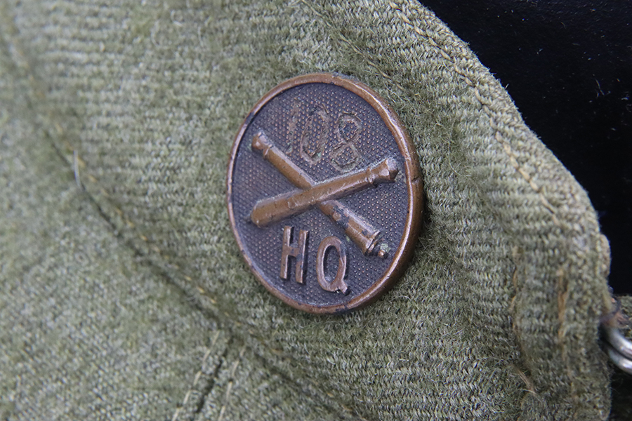 3/20/24 – This listing represents the original jacket, helmet, dog tag and “yearbook” for Ernest Henshaw, a WW1 Private in the 108th Field Artillery, 28th Division. The jacket and dog tag, along with supporting paper work, all carry Henshaw’s name. The helmet and jacket also represent his service in the Pennsylvania Cavalry, which is also written on a copy of his Veteran’s Compensation Application. He is listed as having served at the Meuse-Argonne offensive. The yearbook has details of the unit, and some additional paperwork is included with more details on his service. The jacket is in good condition but the helmet shows its age, with cracking inner lining.
