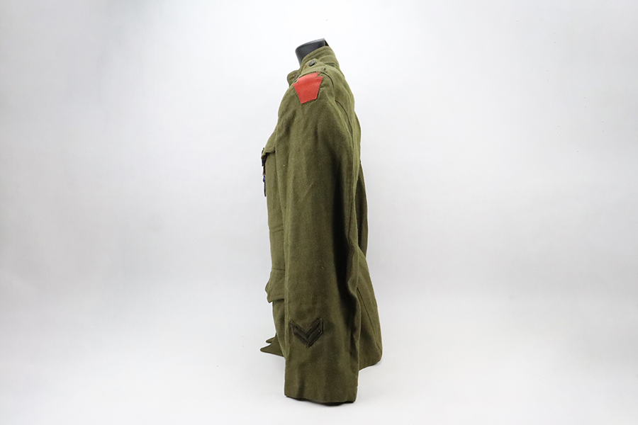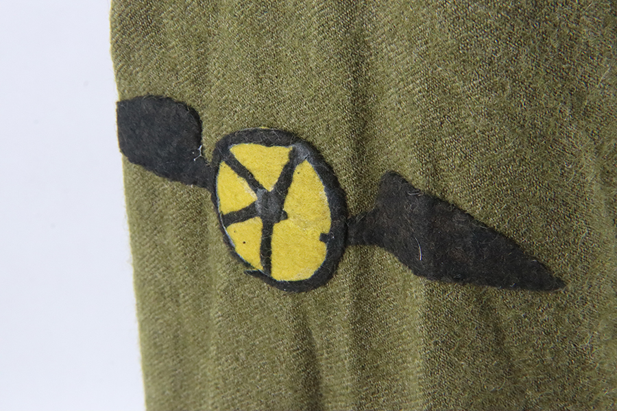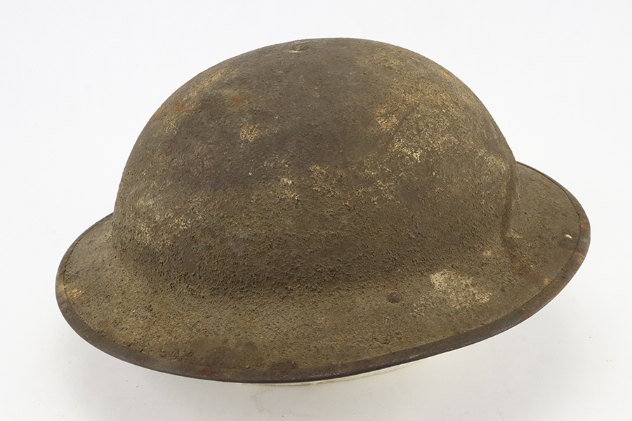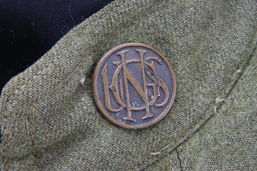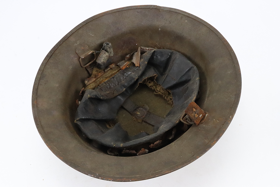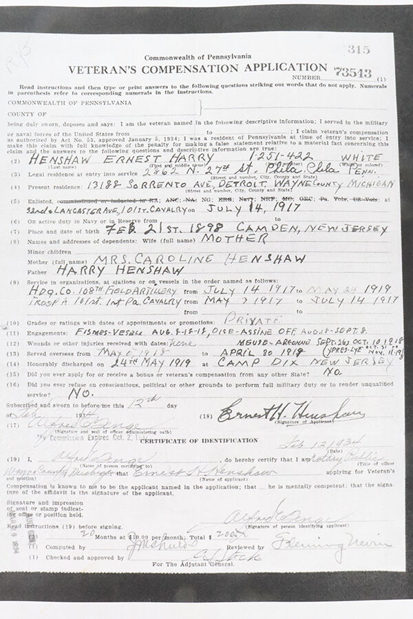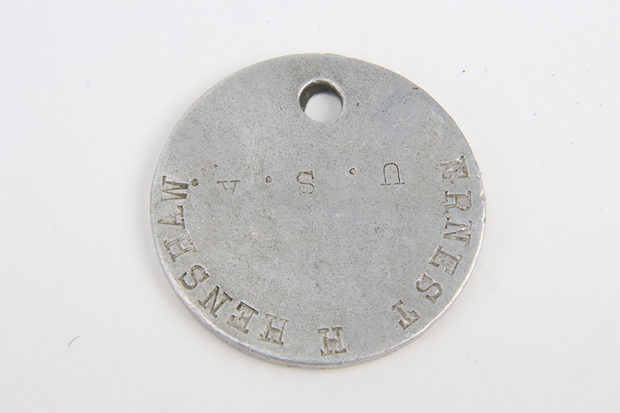 3/20/24 – This listing represents the original jacket, helmet, dog tag and “yearbook” for Ernest Henshaw, a WW1 Private in the 108th Field Artillery, 28th Division. The jacket and dog tag, along with supporting paper work, all carry Henshaw’s name. The helmet and jacket also represent his service in the Pennsylvania Cavalry, which is also written on a copy of his Veteran’s Compensation Application. He is listed as having served at the Meuse-Argonne offensive. The yearbook has details of the unit, and some additional paperwork is included with more details on his service. The jacket is in good condition but the helmet shows its age, with cracking inner lining.