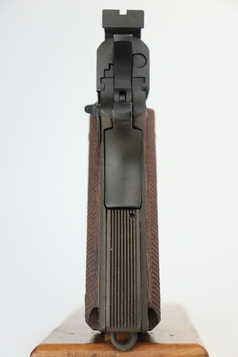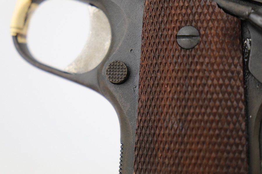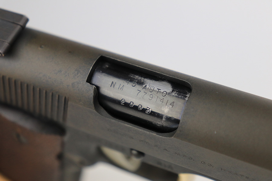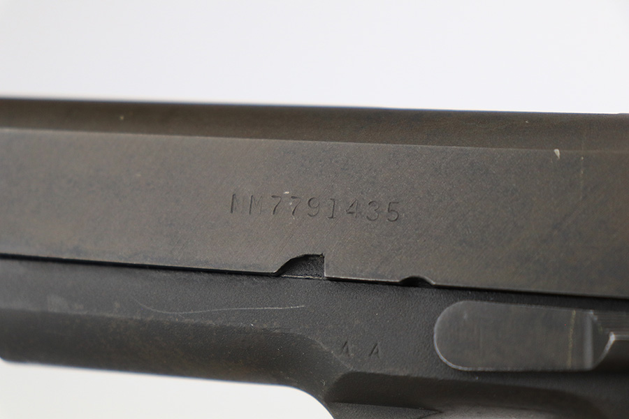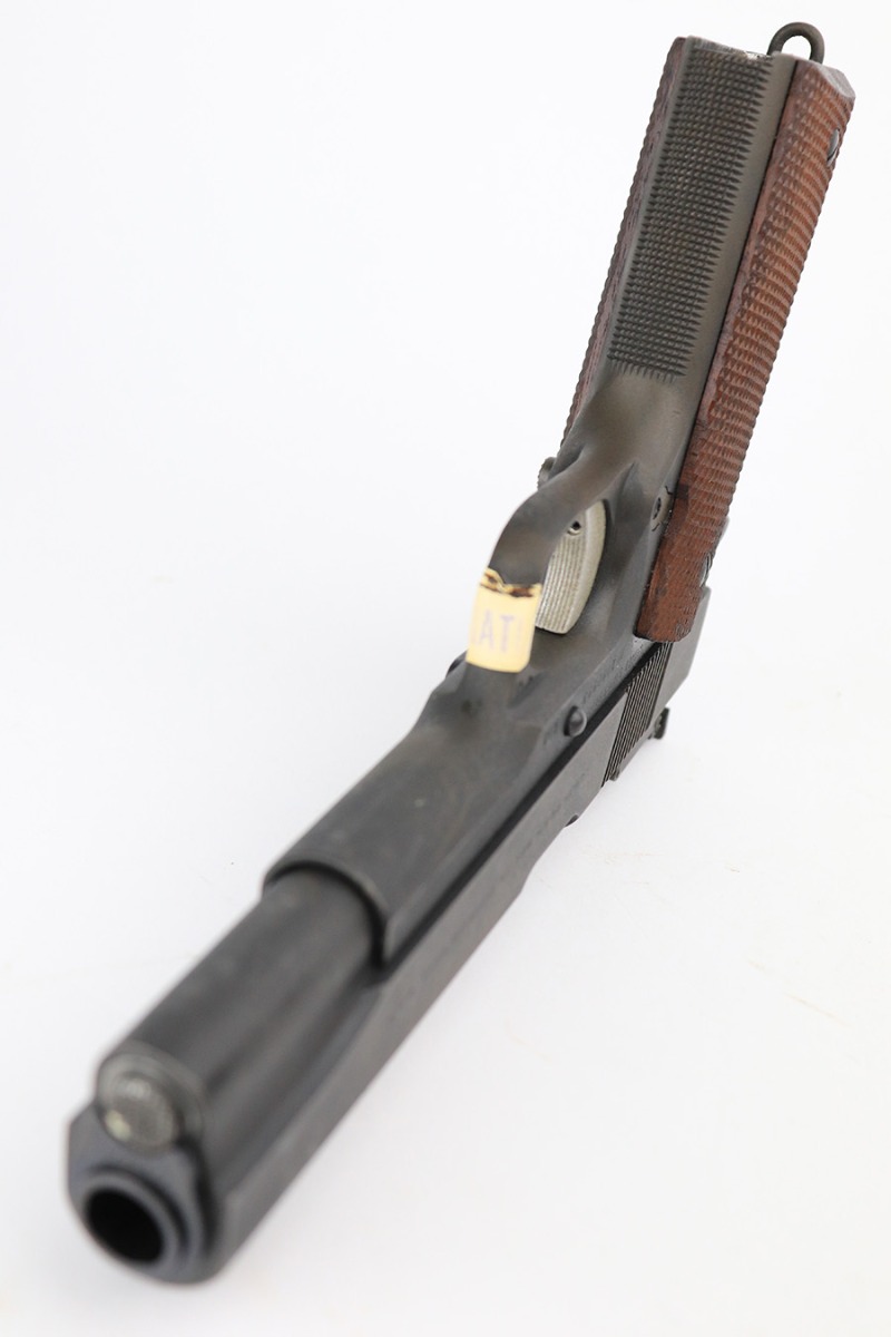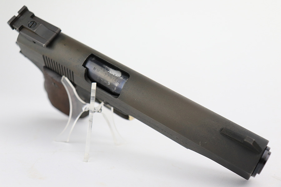 5/31/23 – This is a WW2-era Model 1911A1 that was modified in the 1960’s for National Match shooting for civilians at Camp Perry. Commonly known as the “Camp Perry National Match” gun. It has the National Match barrel, slide and sights. All correct for this model. Also, the unique front strap features a unique Camp Perry knurling. This one has a particularly scarce Union Switch & Signal-made frame from 1943. “AA” and “RIA” arsenal markings on the frame. This one also has what we believe to be its original arsenal tag on the trigger guard. The finish rates about 99% with almost no actual finish loss – just a few spots of discoloration at the left front of the slide. Fitted with excellent wood grips. Mint bore. Very smooth action.