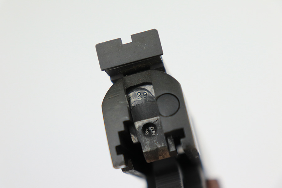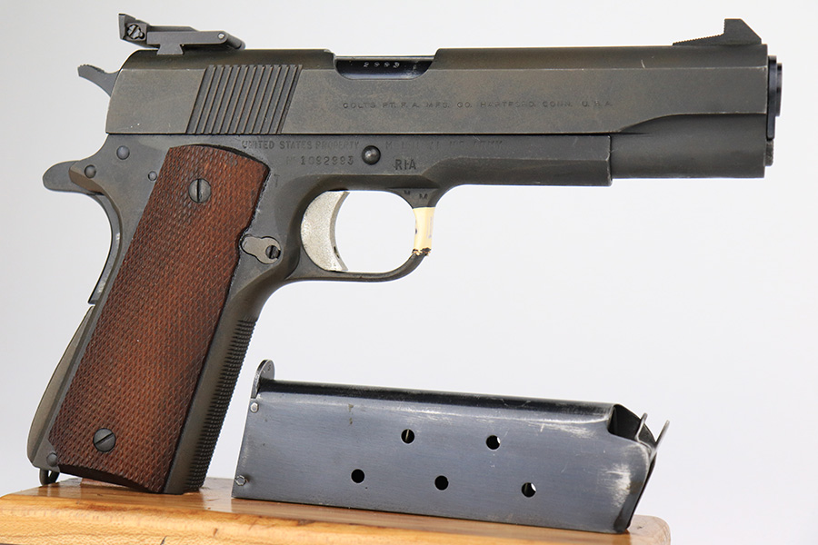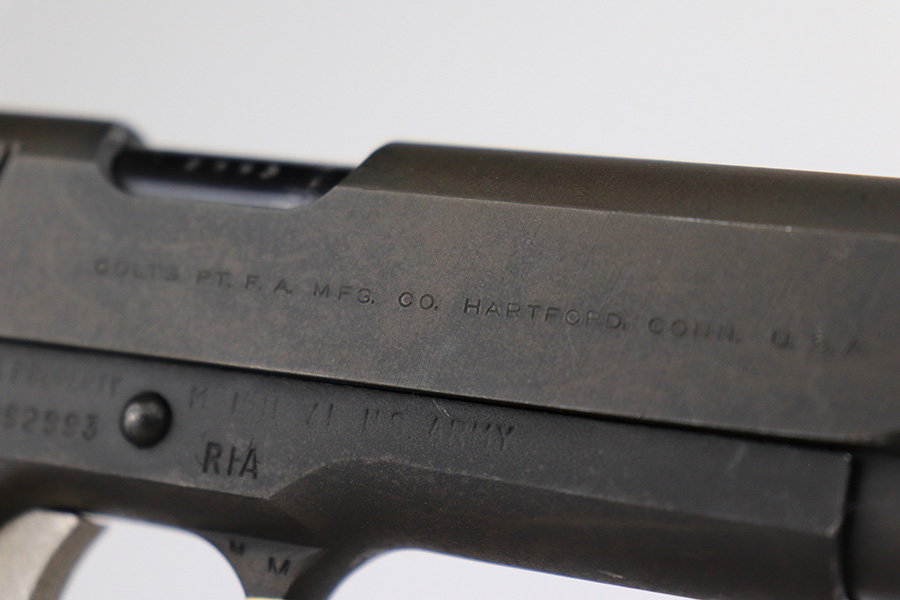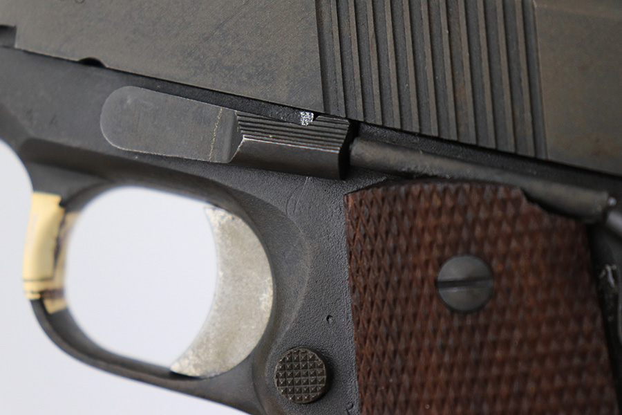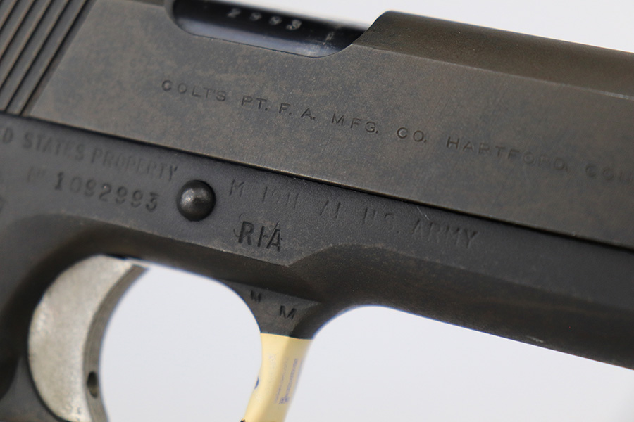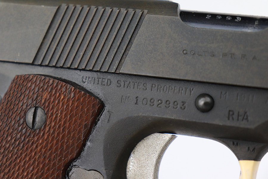 5/31/23 – This is a WW2-era Model 1911A1 that was modified in the 1960’s for National Match shooting for civilians at Camp Perry. Commonly known as the “Camp Perry National Match” gun. It has the National Match barrel, slide and sights. All correct for this model. Also, the unique front strap features a unique Camp Perry knurling. This one has a particularly scarce Union Switch & Signal-made frame from 1943. “AA” and “RIA” arsenal markings on the frame. This one also has what we believe to be its original arsenal tag on the trigger guard. The finish rates about 99% with almost no actual finish loss – just a few spots of discoloration at the left front of the slide. Fitted with excellent wood grips. Mint bore. Very smooth action.