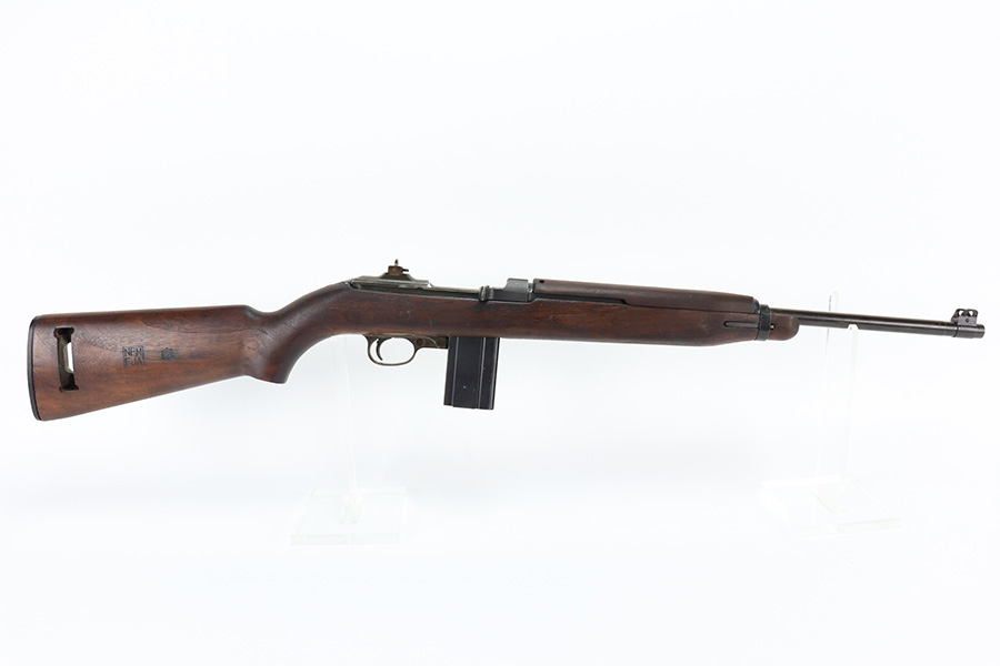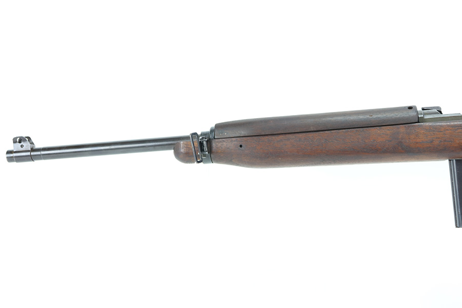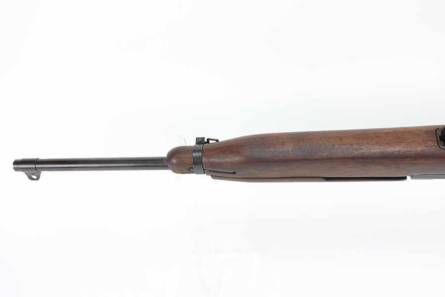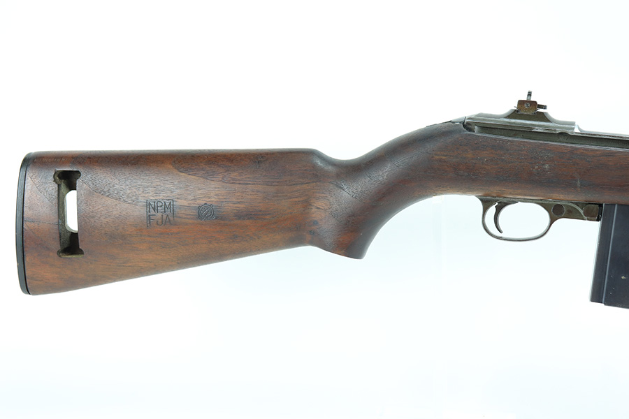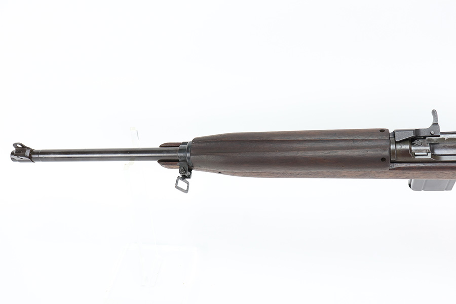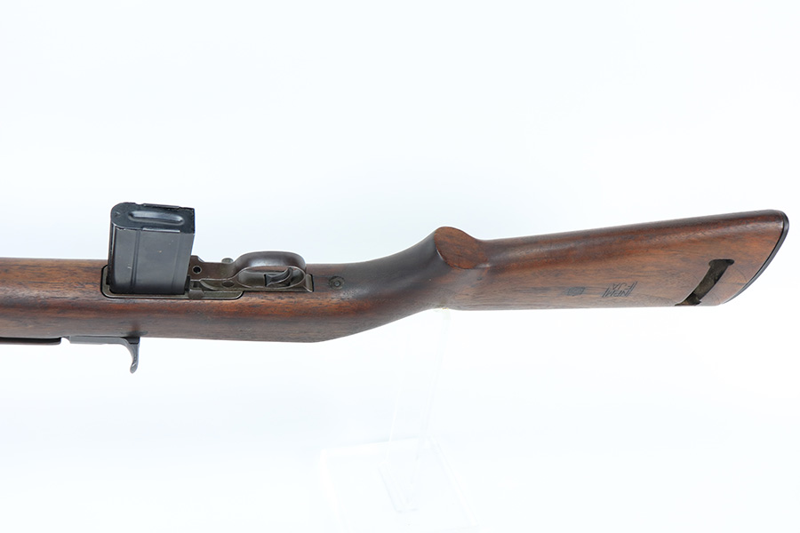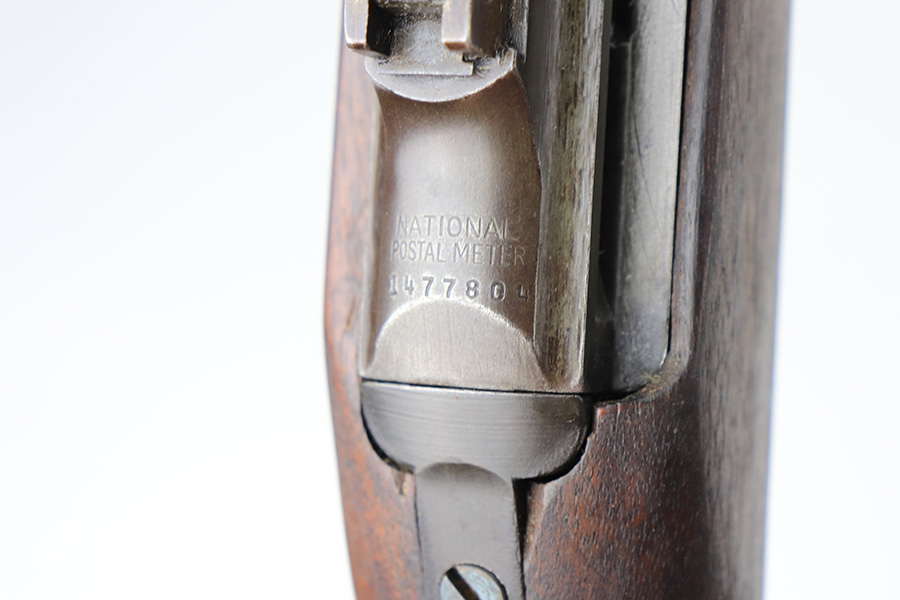 3/1/22 – This is a scarce National Postal Meter M1 Carbine from 1943 with original parts throughout. Excellent original finish on metal parts. Sharp cartouches on stock, though the handguard has some overhang so may have been mated. Early dog leg hammer, with original NPM internals. I-cut stock. Sling swivel may be a replacement. Strong bore with minor frost.