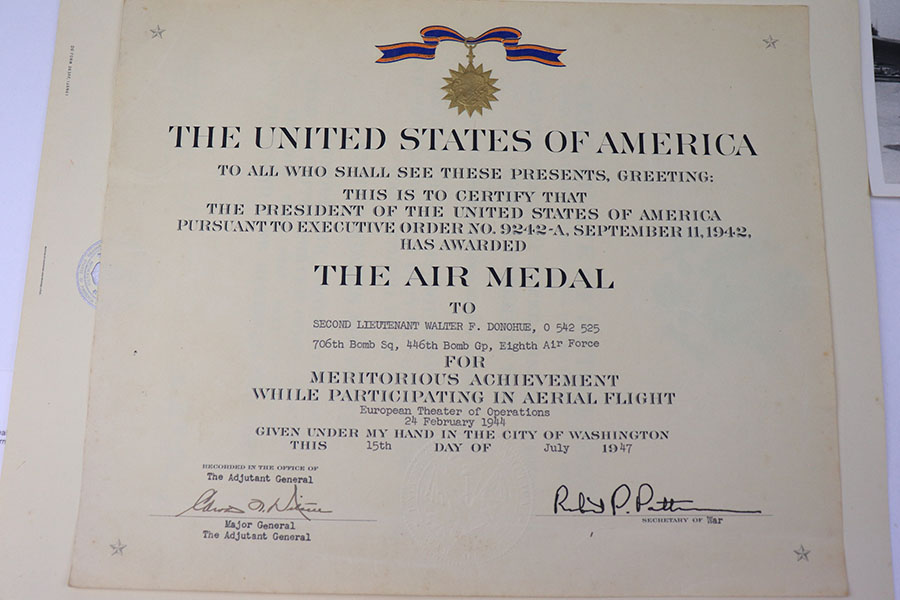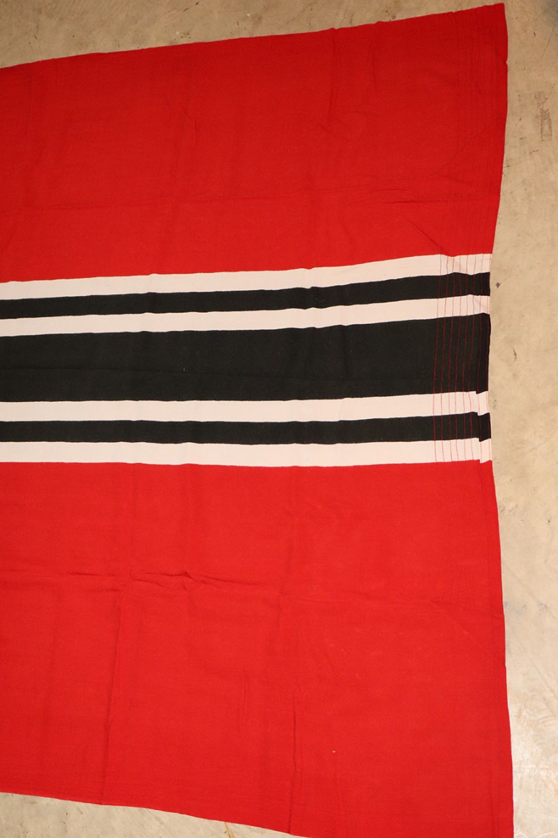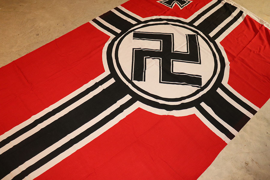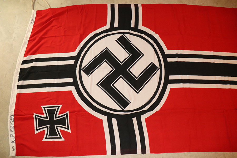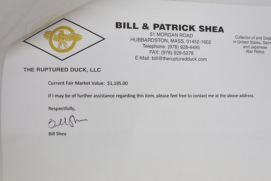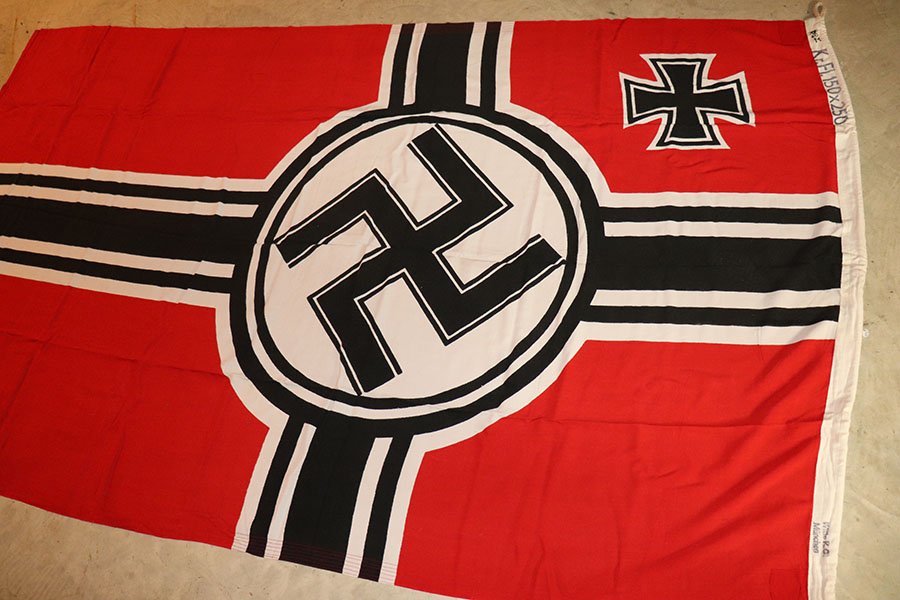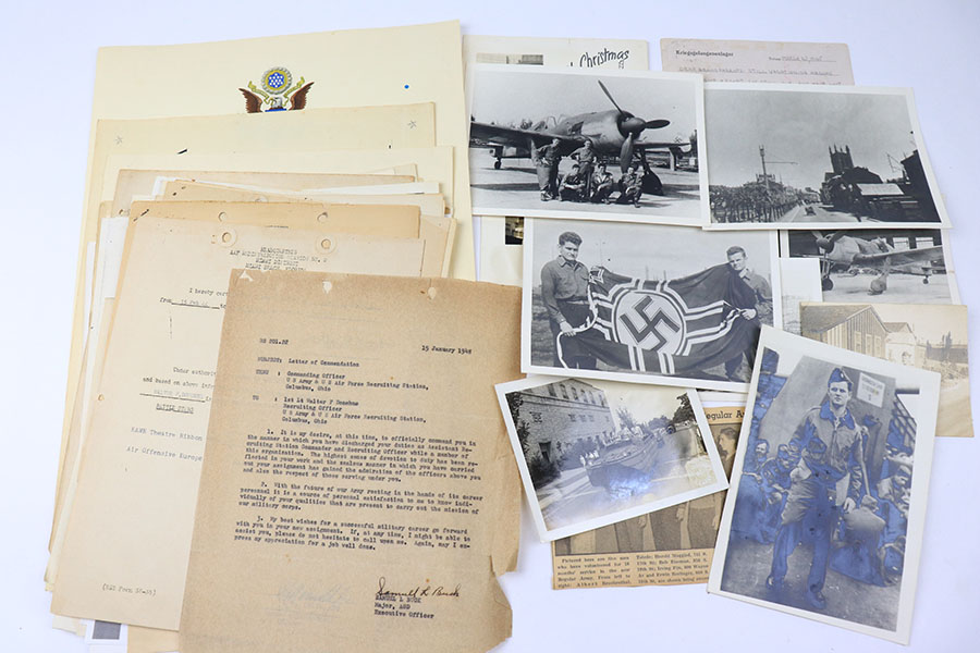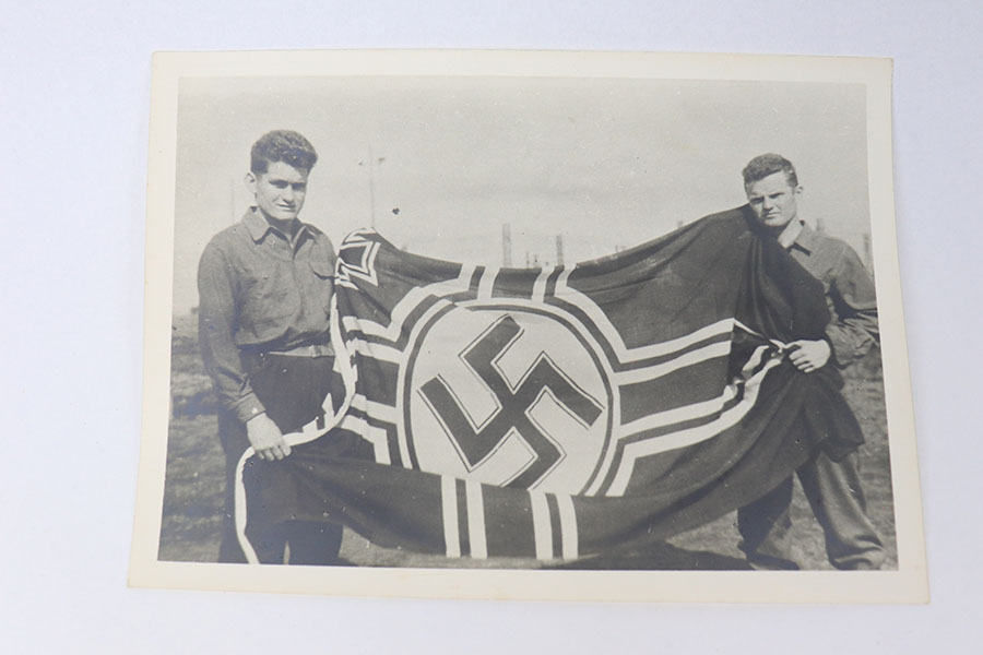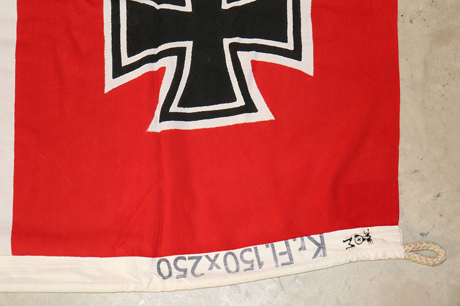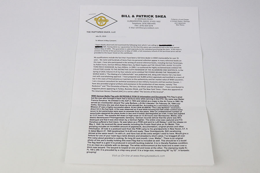 8/13/21 – This is a very cool, unique grouping of a German Kriegsmarine Battle Flag, with documents unrelated to a similar flag. Walter Francis Donahue enlisted in 1943 and retired as a major in 1962. He was a bombardier aboard a B-24J Liberator. On Feb. 24th, 1944 his plane was shot down over Gotha, Germany. According to a unit history (included), the plane received a direct hit to the fuel tank. The plane fell down into high snow and the entire crew was captured. Donahue suffered a foot injury and was taken as a POW to Luft Stalag 1. He was released in May of 1945. He received a Purple Heart and an Air Medal. Included in the documents, postcards, and photos is a photo of Donahue holding a similar flag to the one included. The flag is in excellent condition. Also comes with a Ruptured Duck certificate of authenticity.
