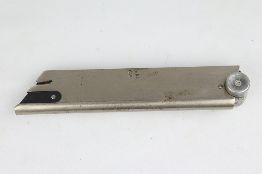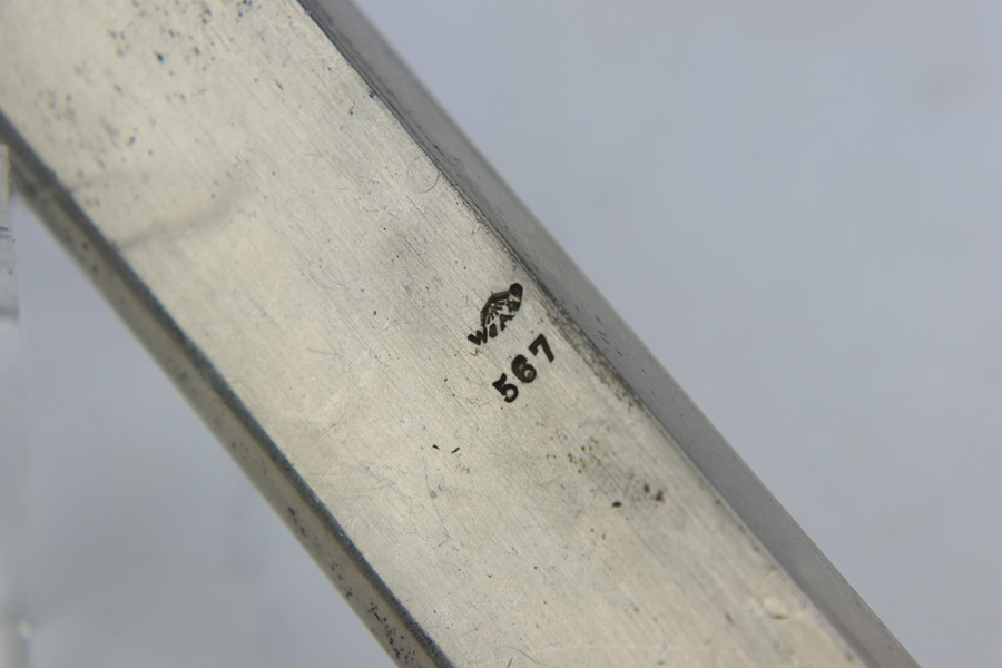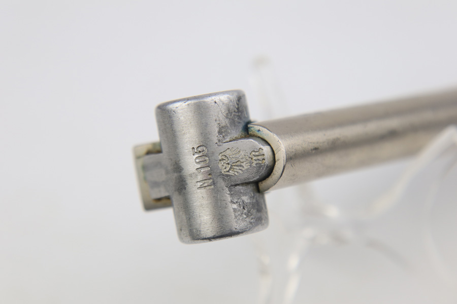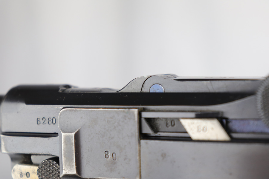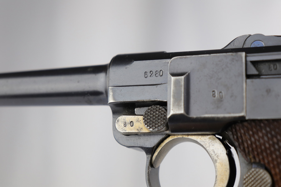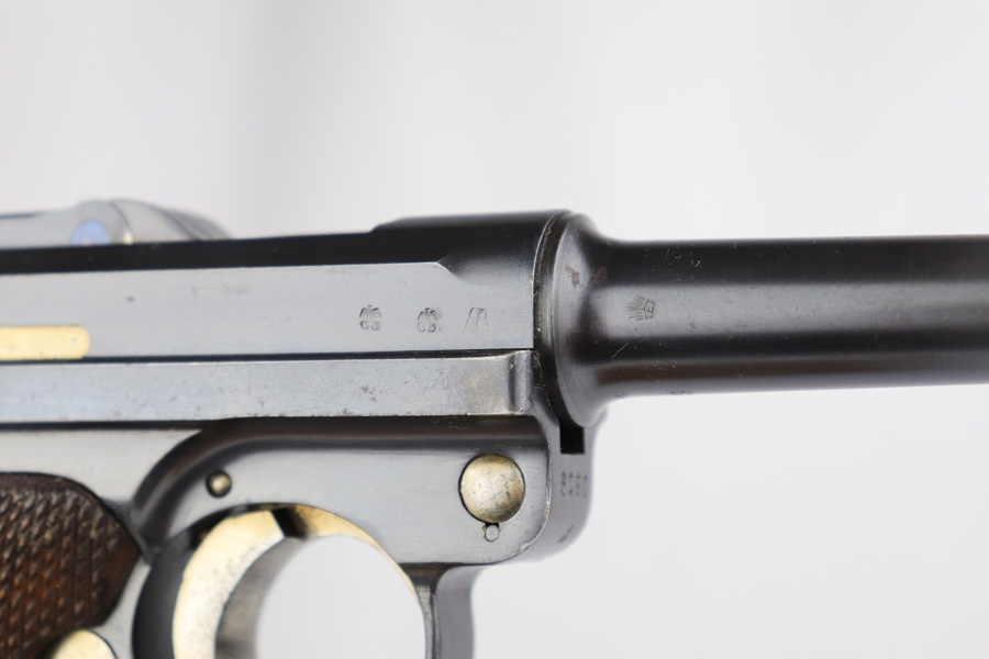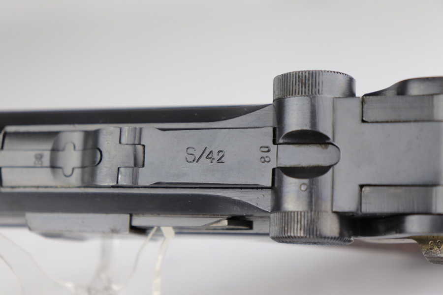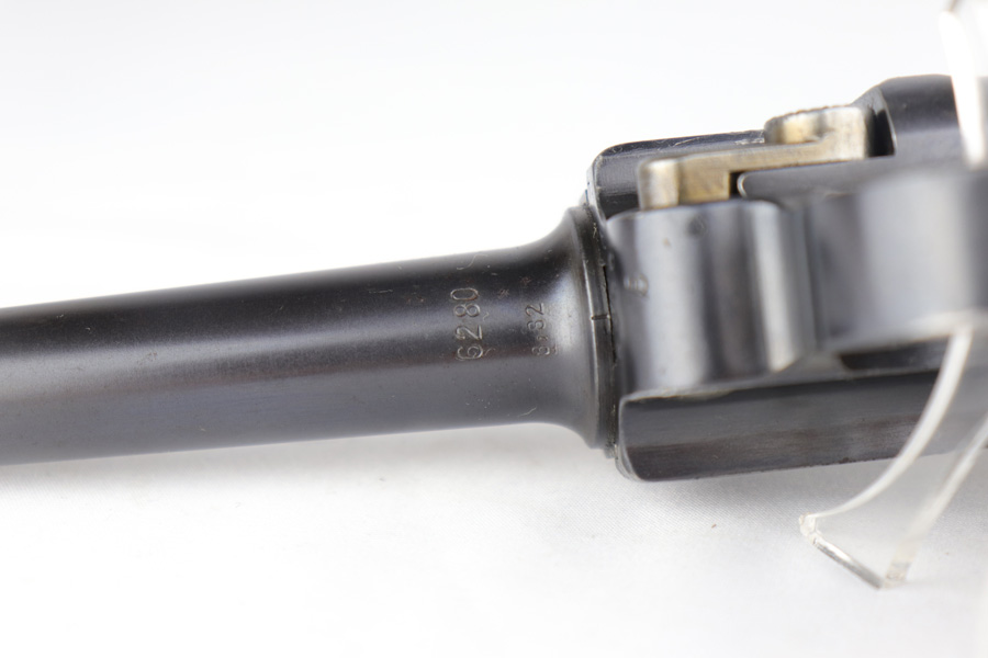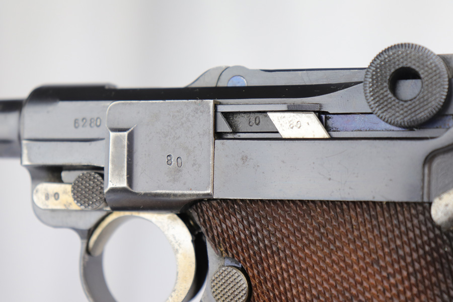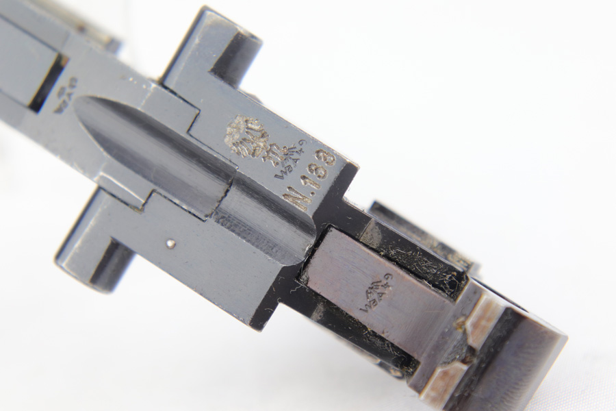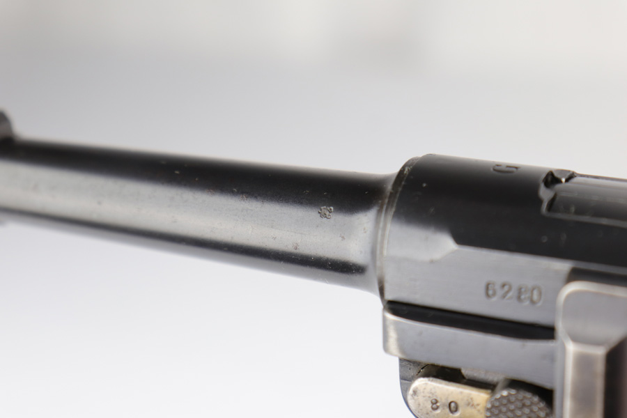 2/25/19 – This is a set that probably becomes available for sale once in a lifetime. It is an all original G Date Luger with Kriegsmarine Nord Sea markings, accompanied by a Kriegsmarine Nord Sea marked .22 caliber conversion unit with a toggle train matched to the gun! Both are completely original and unmessed with. The gun retains around 95% of its original blue with some minor spotting in the finish visible on side plate and on the grip straps, and minor rub wear on high points. There is no pitting or rust anywhere. The gun is all matching including the grips and is accompanied by a non-matching but proper Navy property marked magazine. Excellent bore. The early, original Kriegsmarine markings are present prominently on the front grip strap, including the early Naval eagle. The most unbelievable part of this rig is the early, Kriegsmarine marked conversion kit with a toggle train that matches the last two digits of the gun’s serial number! Although the .22 caliber magazine and the barrel insert are not matched to the toggle train, all the kit components have the same early Kriegsmarine eagle, accompanied by a Nord Sea property number. This is a once in a lifetime opportunity to acquire such scarce set, as only about 300 of the Navy G Date Lugers were made with early KM markings, so to find with a partially matching Navy conversion kit may not be seen again on the market for a long time.