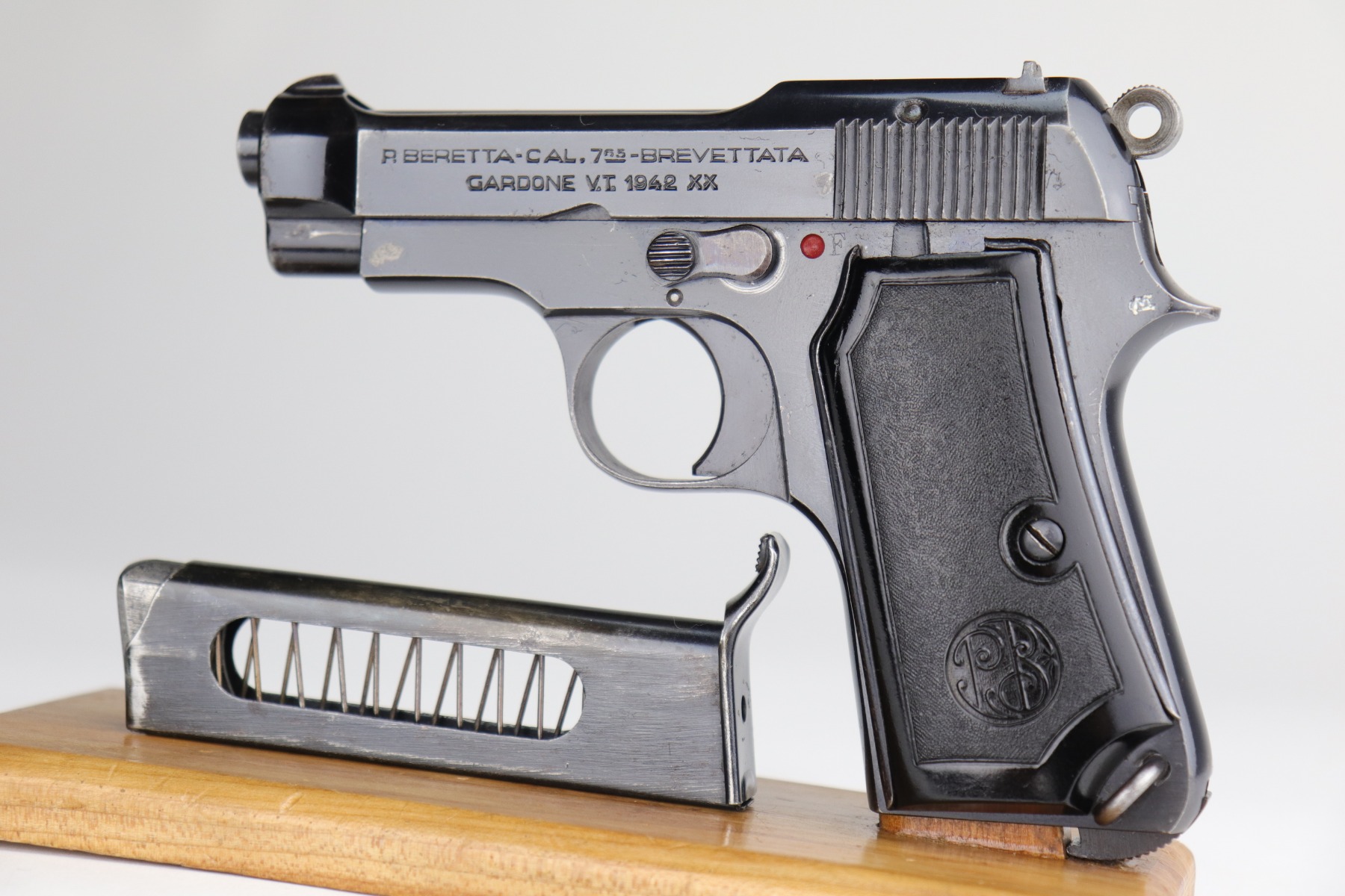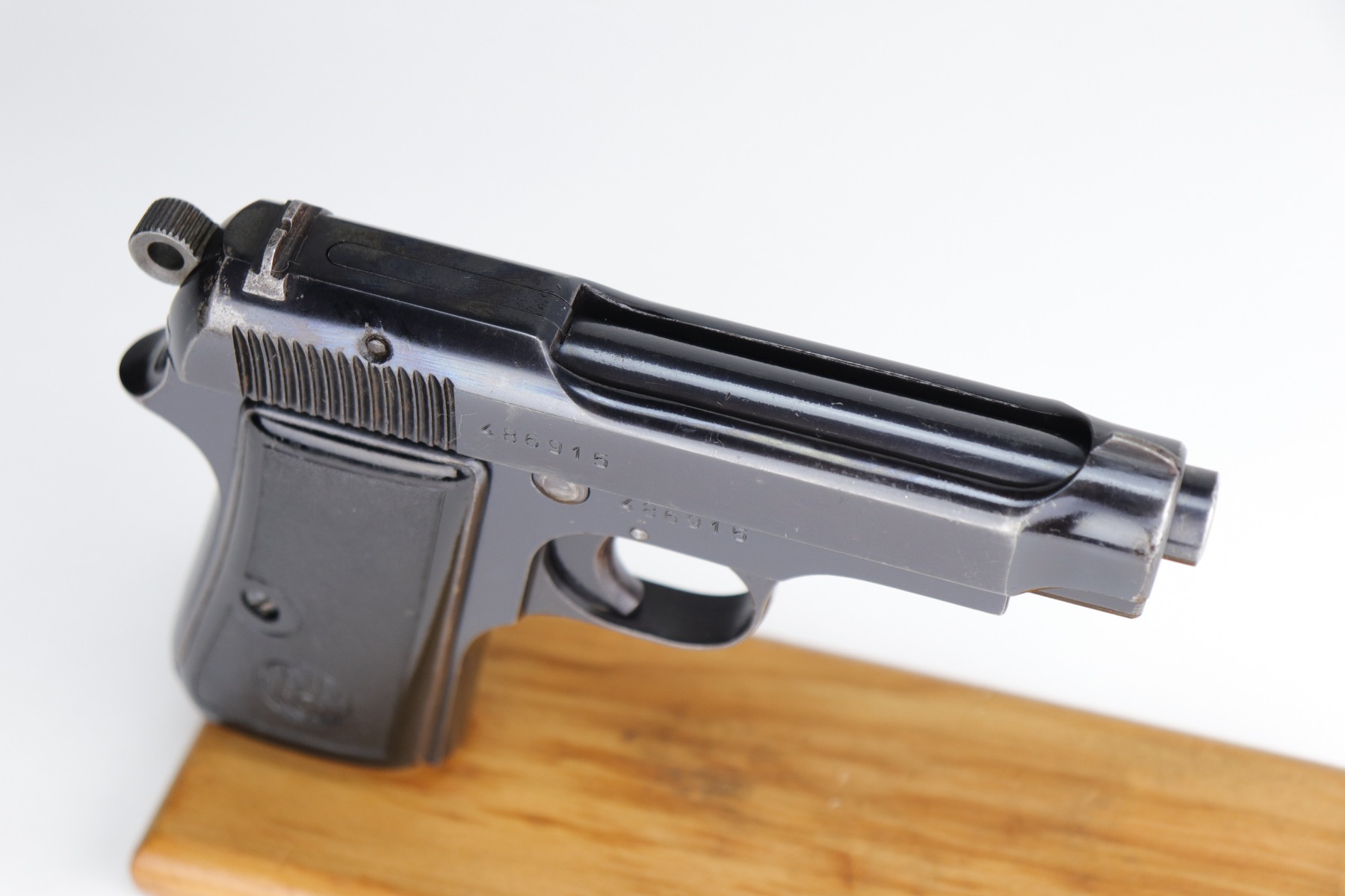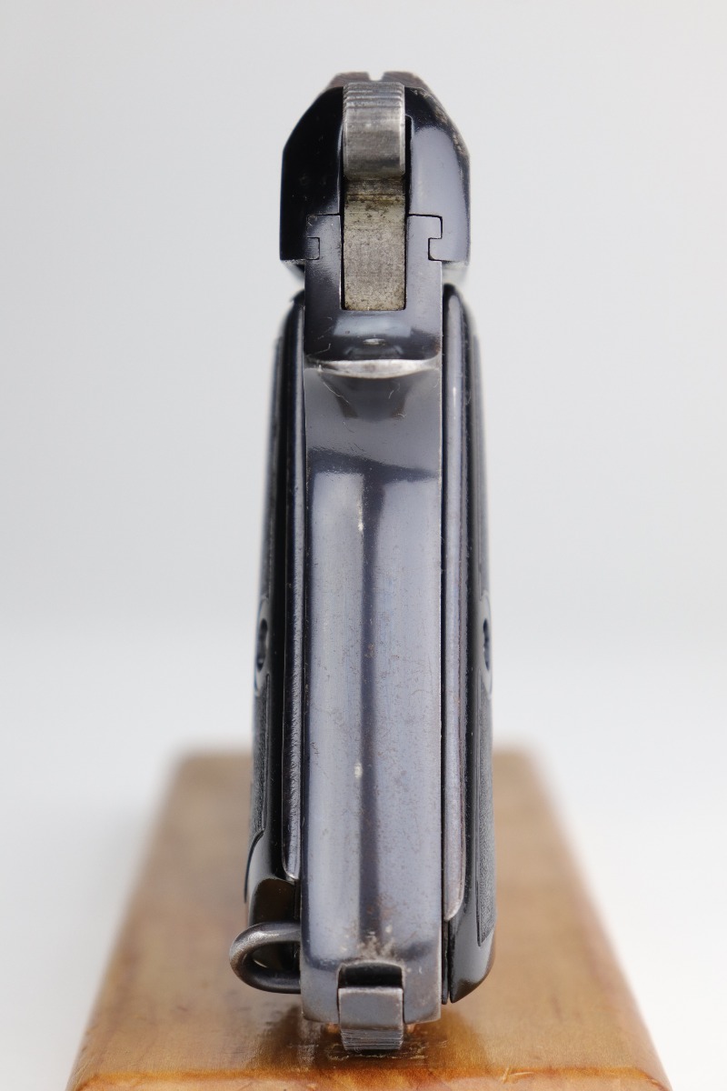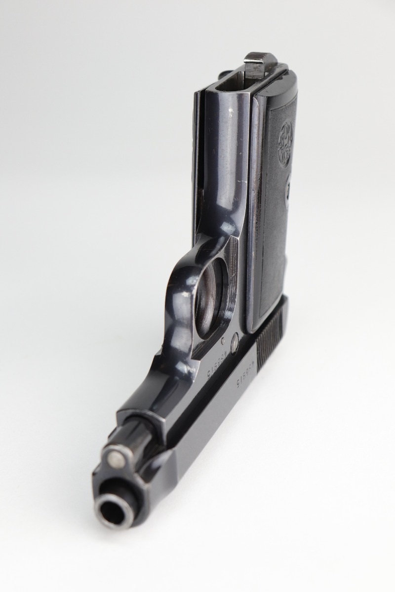 10/29/20 – This is a very nice example of an Italian Beretta Model 1935 manufactured in 1942. It has a stylized “CM” proof on the tang. From research, this would indicate it was issued to the Italian Navy before the Nazi control of the factory. This particular gun has a serial number that is consistent with other Navy-issue M1935’s. It has retained about 93-94% of its original bluing. There is muzzle wear and wear along the high edges. There is spotty wear on the right side of the slide and a more noticeable area at the back of the slide. There is one spot of wear on the left side of the frame. There are handling marks and spotty wear on the straps and underside of the trigger guard. It comes with nice period-correct grips and one period-correct magazine. The bore has decent rifling, but there is minor pitting throughout.