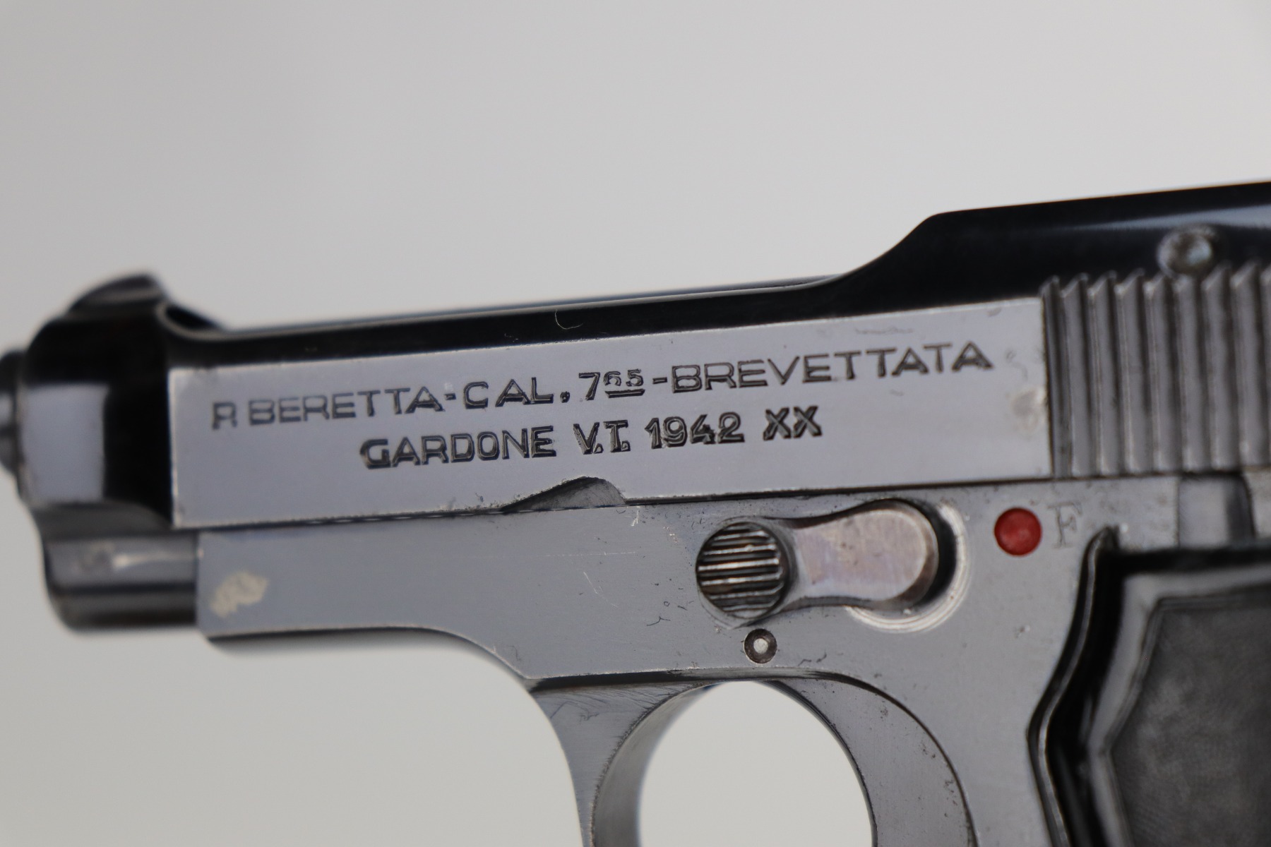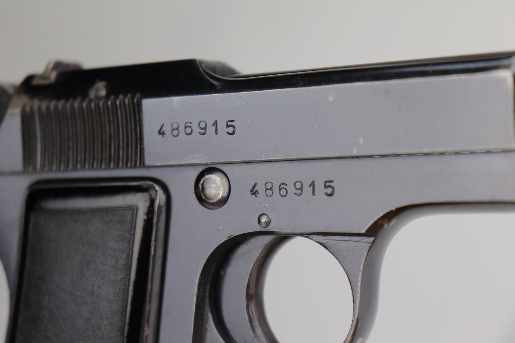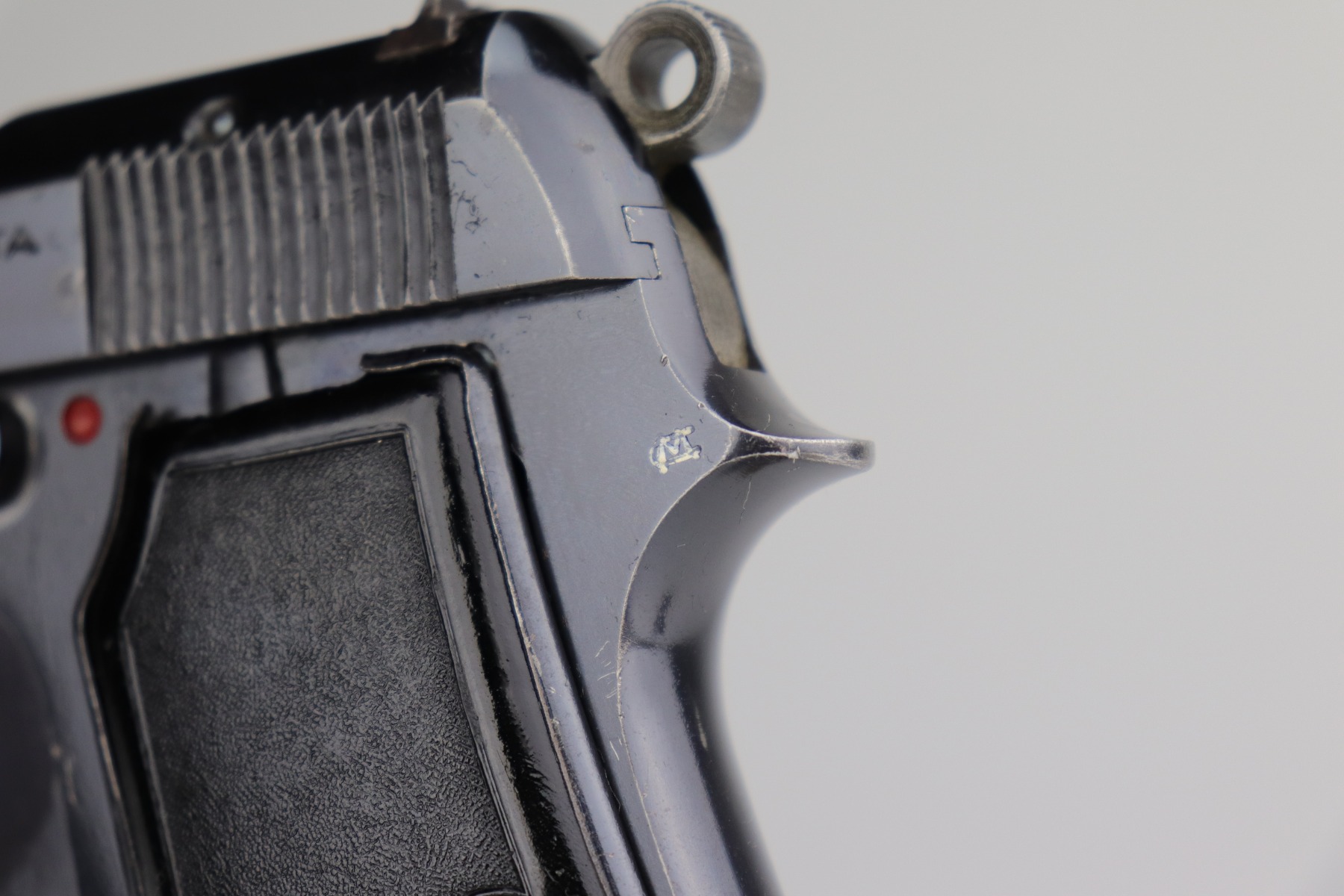 10/29/20 – This is a very nice example of an Italian Beretta Model 1935 manufactured in 1942. It has a stylized “CM” proof on the tang. From research, this would indicate it was issued to the Italian Navy before the Nazi control of the factory. This particular gun has a serial number that is consistent with other Navy-issue M1935’s. It has retained about 93-94% of its original bluing. There is muzzle wear and wear along the high edges. There is spotty wear on the right side of the slide and a more noticeable area at the back of the slide. There is one spot of wear on the left side of the frame. There are handling marks and spotty wear on the straps and underside of the trigger guard. It comes with nice period-correct grips and one period-correct magazine. The bore has decent rifling, but there is minor pitting throughout.