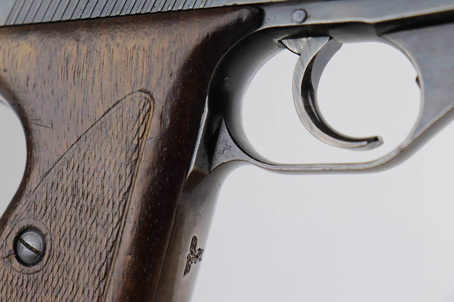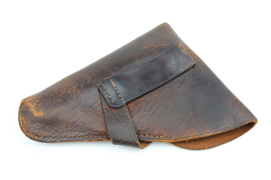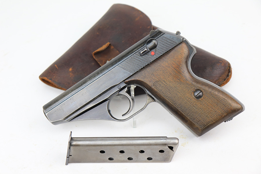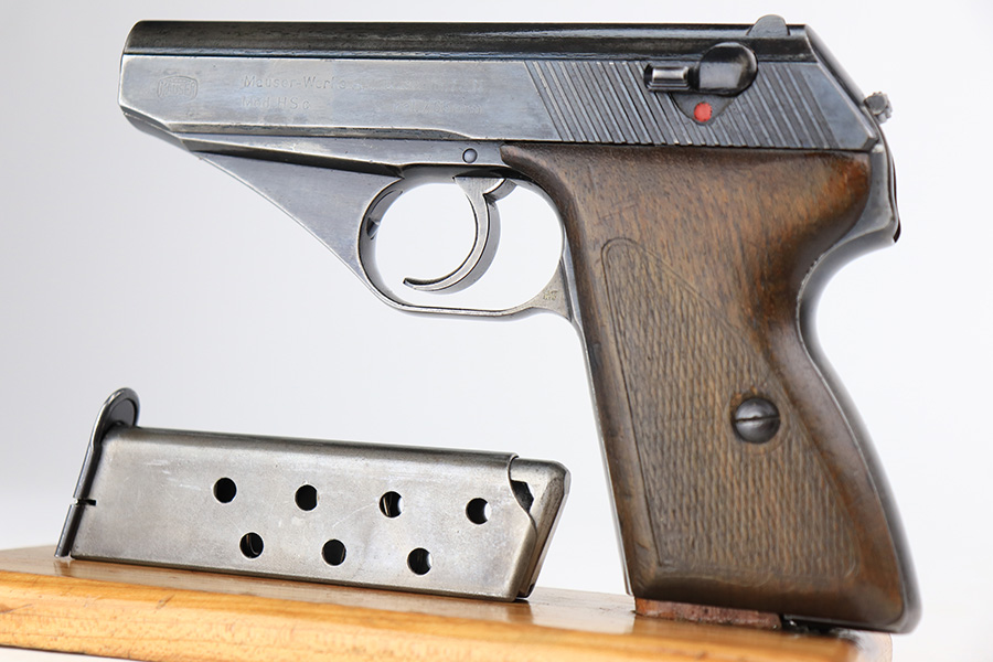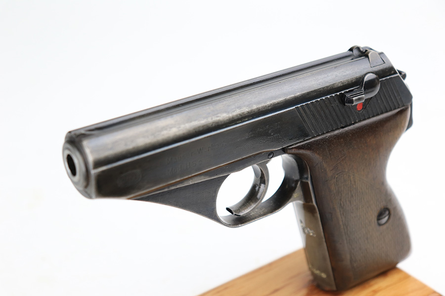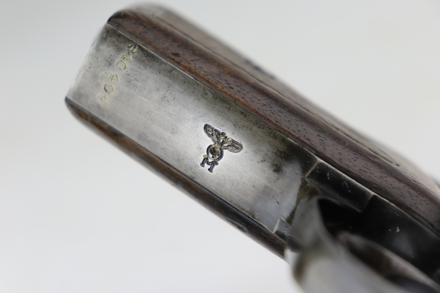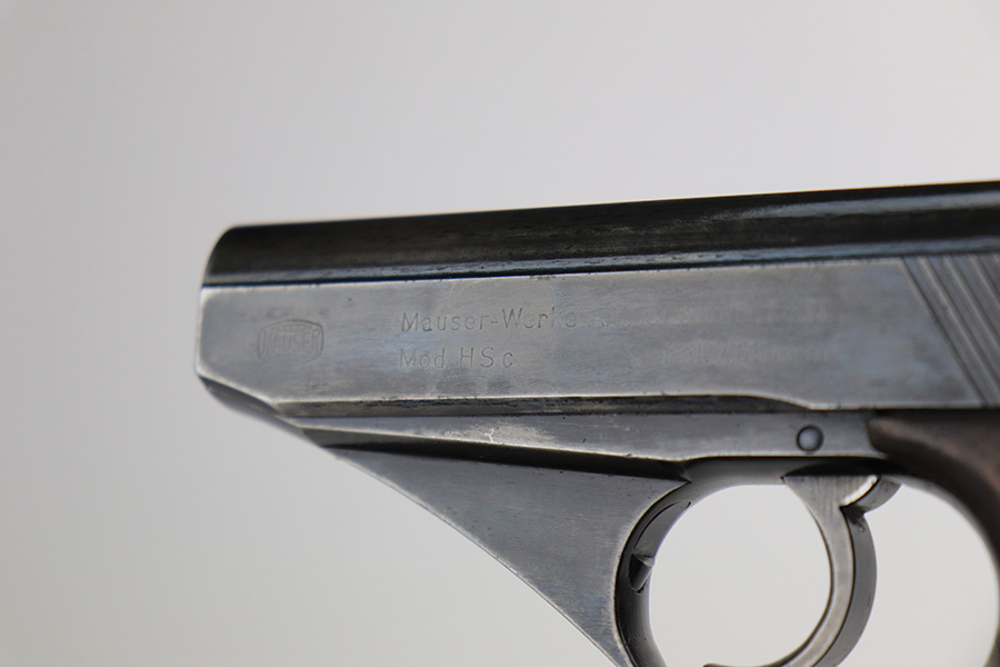 4/29/22 – This is a nice example of a Mauser HSC issued to the Kriegsmarine in 1943. The gun is all matching and is a 3rd variation example, characterized by the Nazi “Eagle M” Navy marking on the front strap and additional “Eagle III/8” marking on the left side of the trigger guard. They only made about 2,000 of this variation. It comes as a rig with a correct Navy-style holster and one period-correct magazine. The holster is not Navy-marked but does have the information of the GI who brought it home written on the inside of the top flap. The gun itself has retained roughly 75% of its finish. Most the finish loss is on the grip straps, but there are also areas of spotty wear along both sides of the slide. An area of minor pitting on the right side of the slide around the muzzle. Comes with nice period-correct wood grips – some minor bruising here and there. Minty bore.