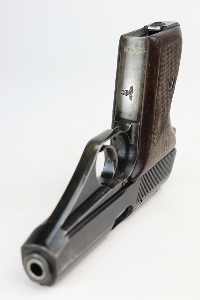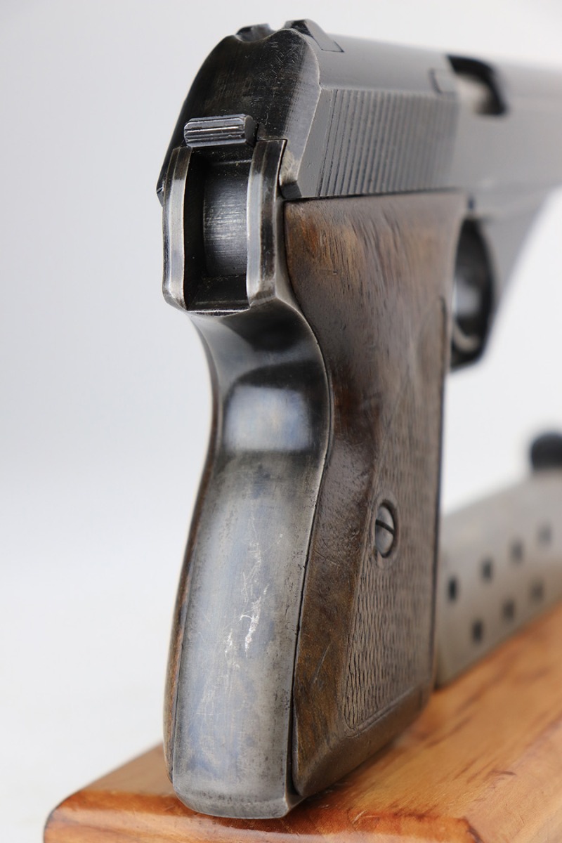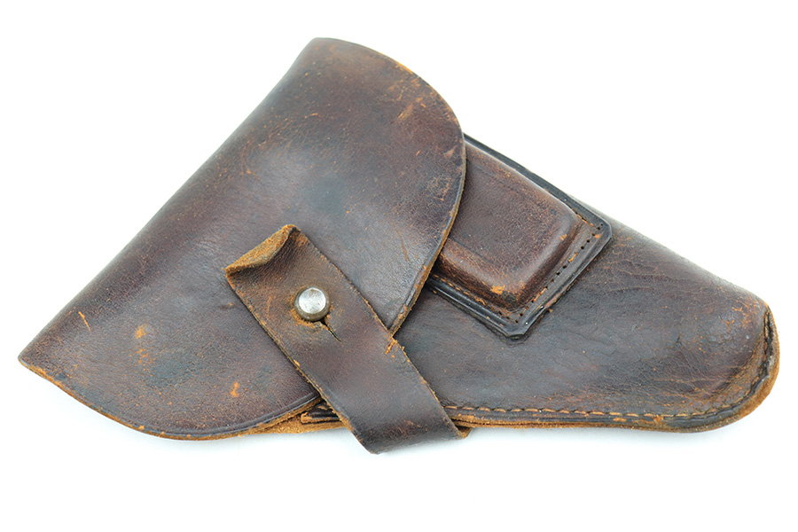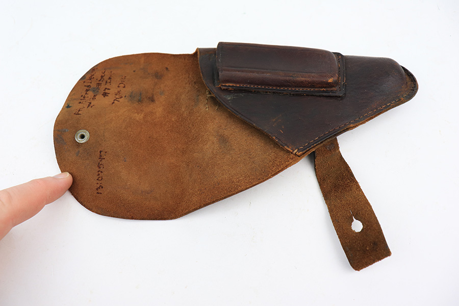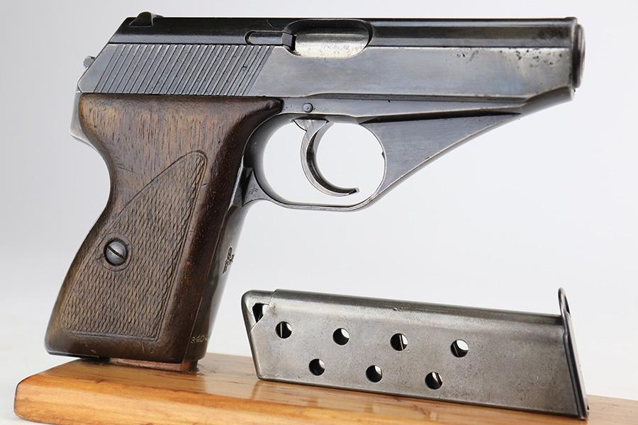 4/29/22 – This is a nice example of a Mauser HSC issued to the Kriegsmarine in 1943. The gun is all matching and is a 3rd variation example, characterized by the Nazi “Eagle M” Navy marking on the front strap and additional “Eagle III/8” marking on the left side of the trigger guard. They only made about 2,000 of this variation. It comes as a rig with a correct Navy-style holster and one period-correct magazine. The holster is not Navy-marked but does have the information of the GI who brought it home written on the inside of the top flap. The gun itself has retained roughly 75% of its finish. Most the finish loss is on the grip straps, but there are also areas of spotty wear along both sides of the slide. An area of minor pitting on the right side of the slide around the muzzle. Comes with nice period-correct wood grips – some minor bruising here and there. Minty bore.