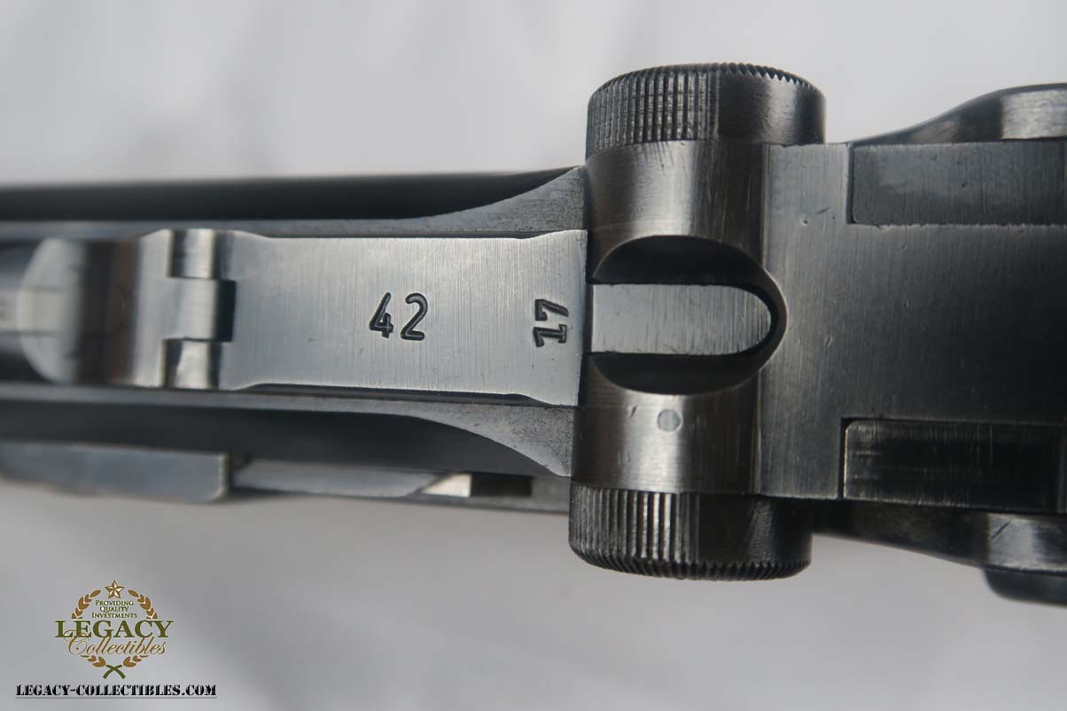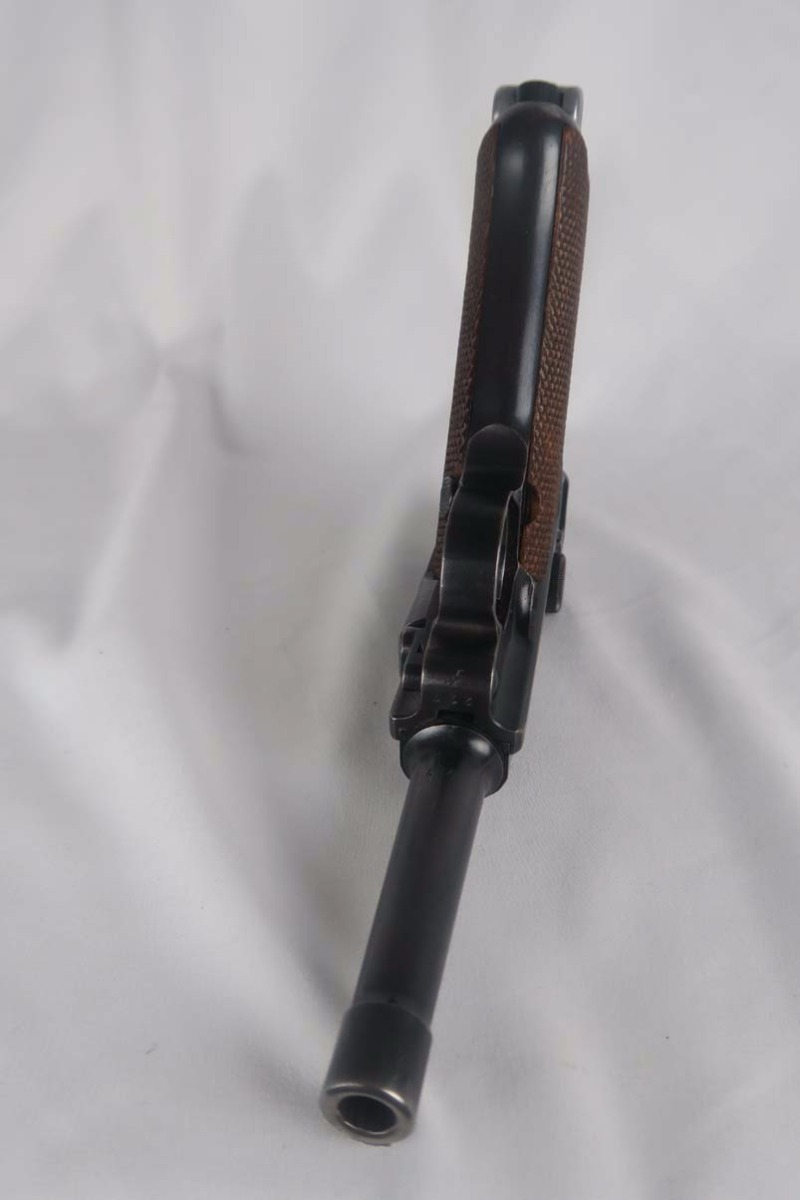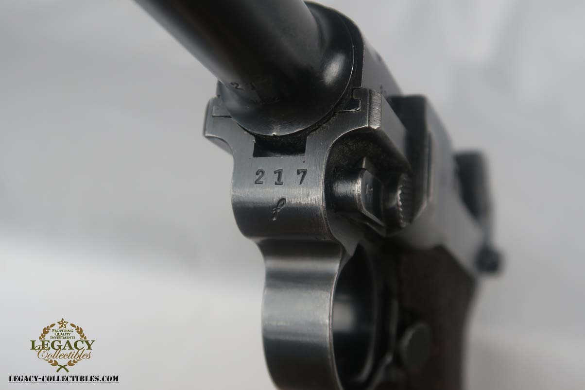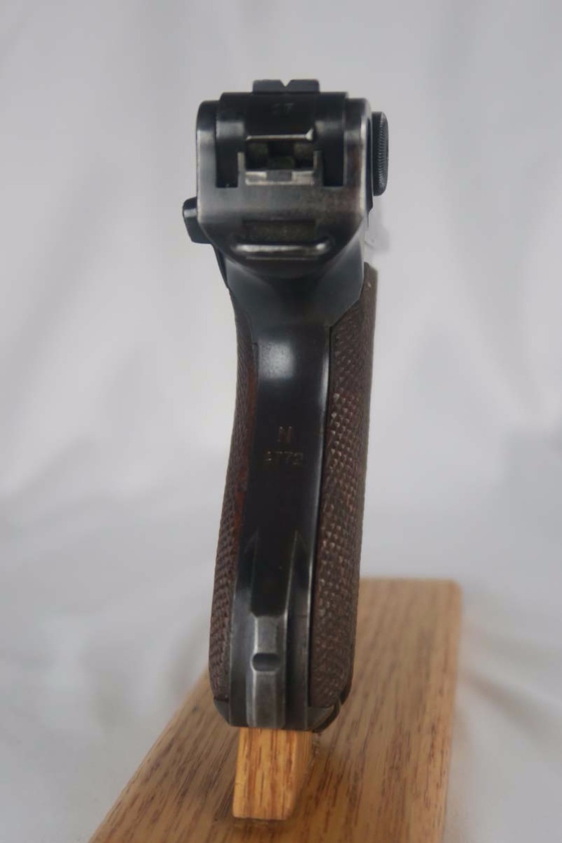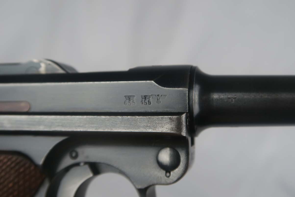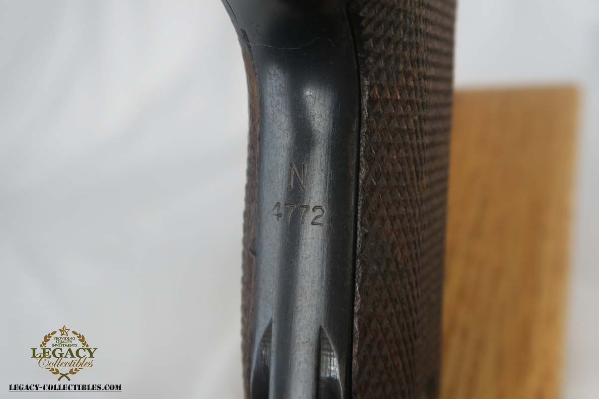 6/7/17 – This is a rare 1940 Mauser Luger, with Navy property mark on the back strap (Nordsee).  The original finish rates at about 94-95%, with some thinning on the barrel and wear on the sideplate.  There were only 6,000 Navy lugers of this variation procured, all from 1936-1940.  All numbered small parts are matching, as well as the grips.  The magazine is period correct but not matching to the pistol.  The bore has strong rifling and is in very good condition overall, with no pitting.