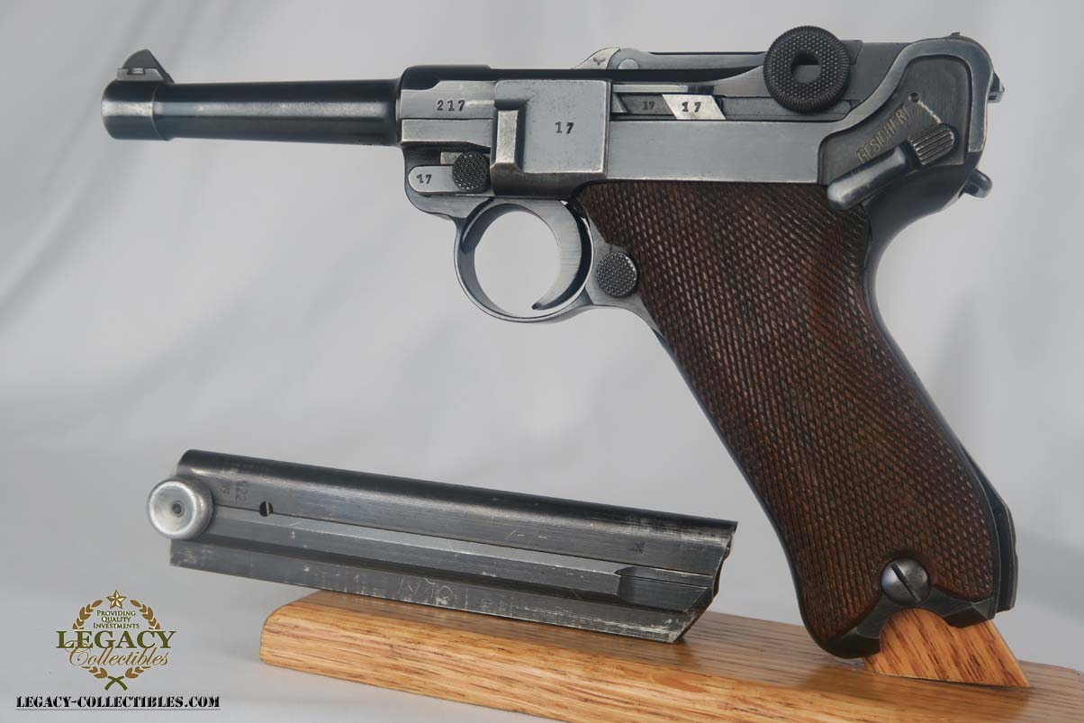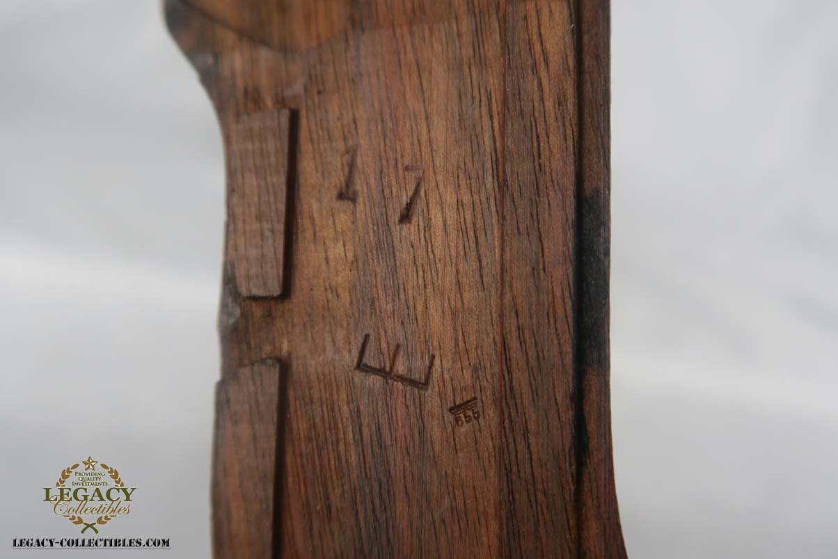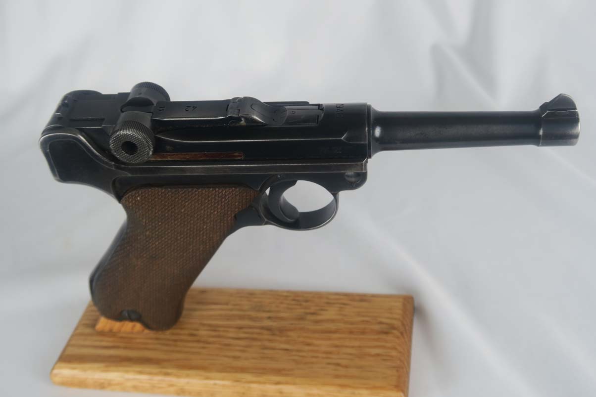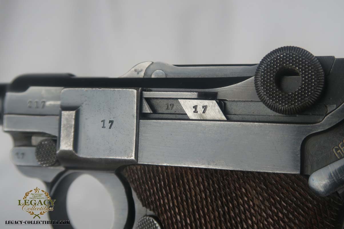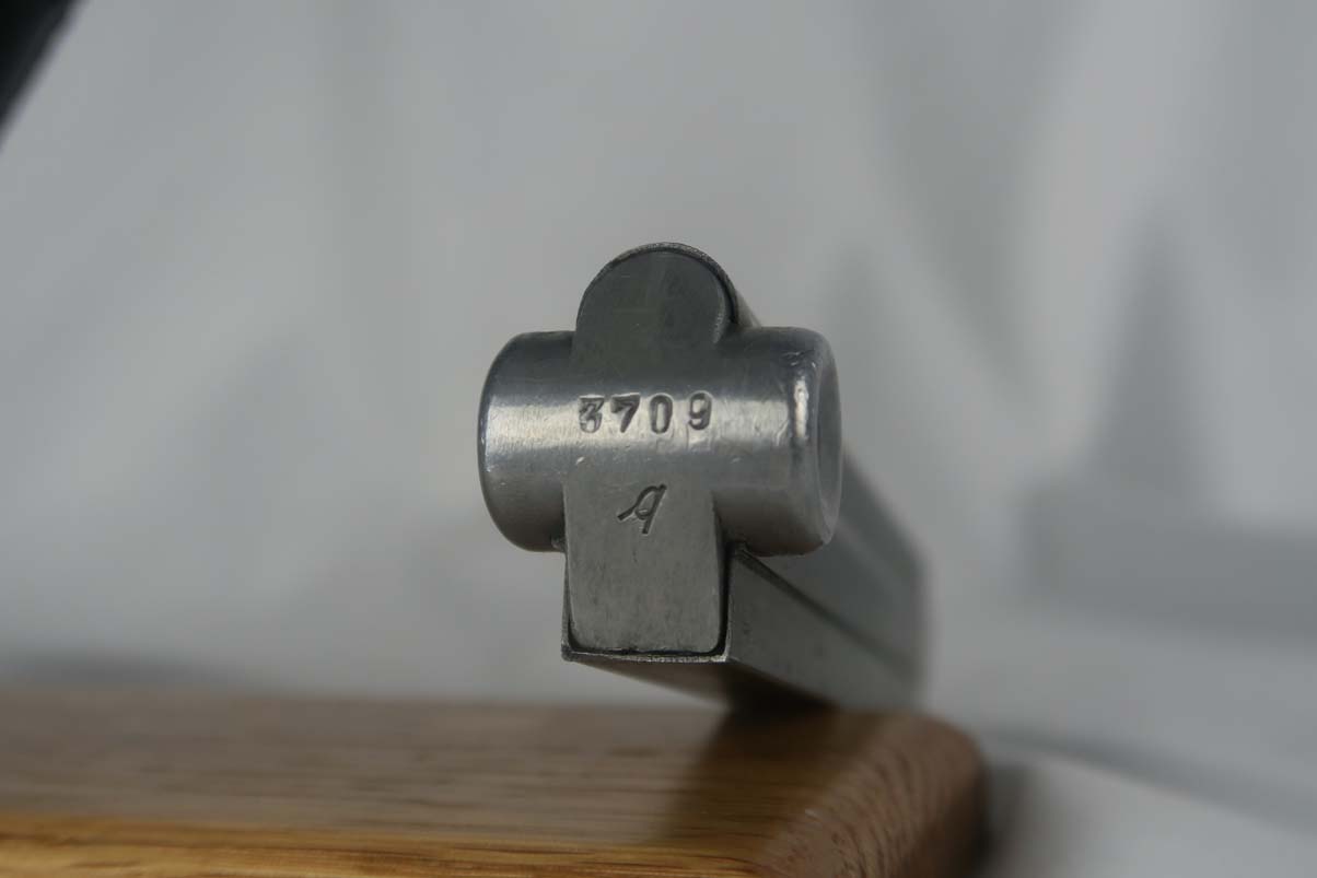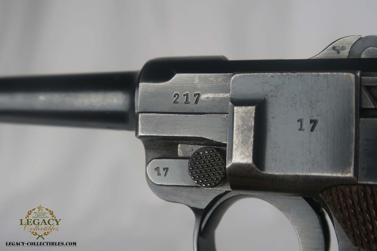 6/7/17 – This is a rare 1940 Mauser Luger, with Navy property mark on the back strap (Nordsee).  The original finish rates at about 94-95%, with some thinning on the barrel and wear on the sideplate.  There were only 6,000 Navy lugers of this variation procured, all from 1936-1940.  All numbered small parts are matching, as well as the grips.  The magazine is period correct but not matching to the pistol.  The bore has strong rifling and is in very good condition overall, with no pitting.