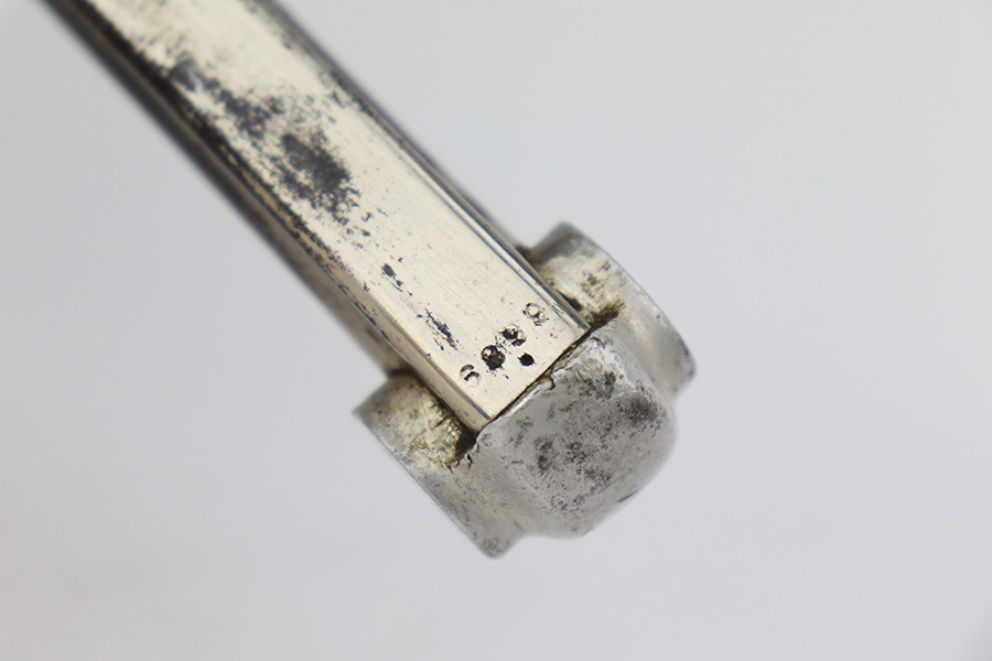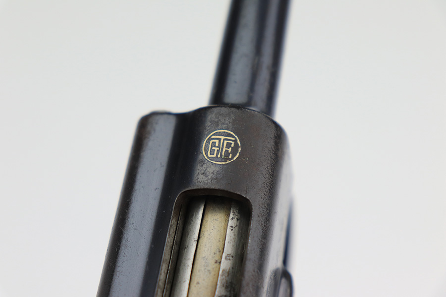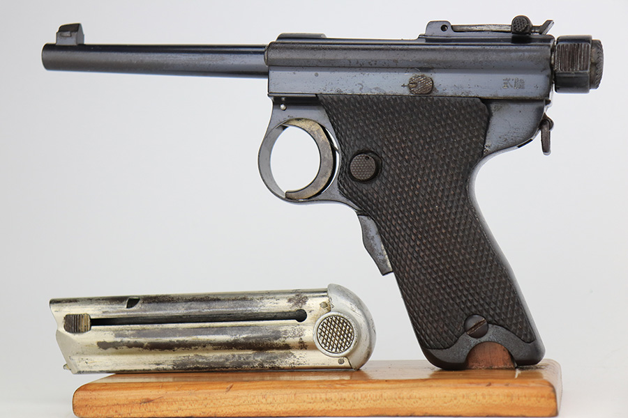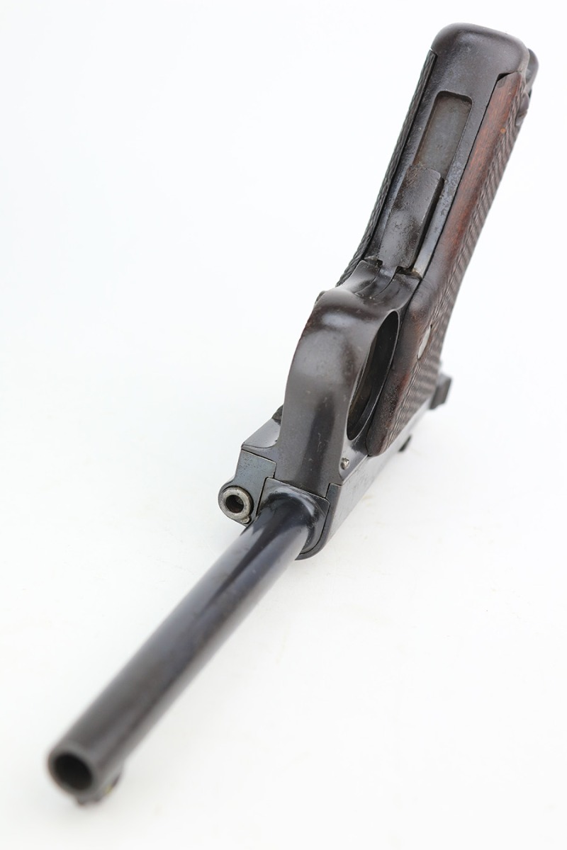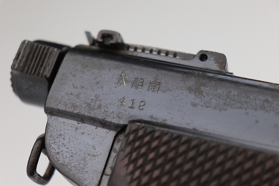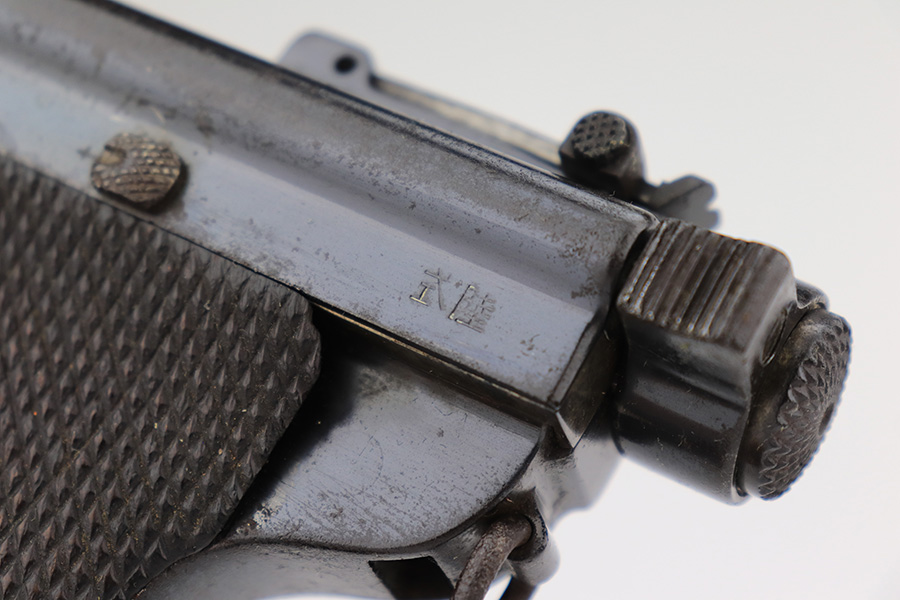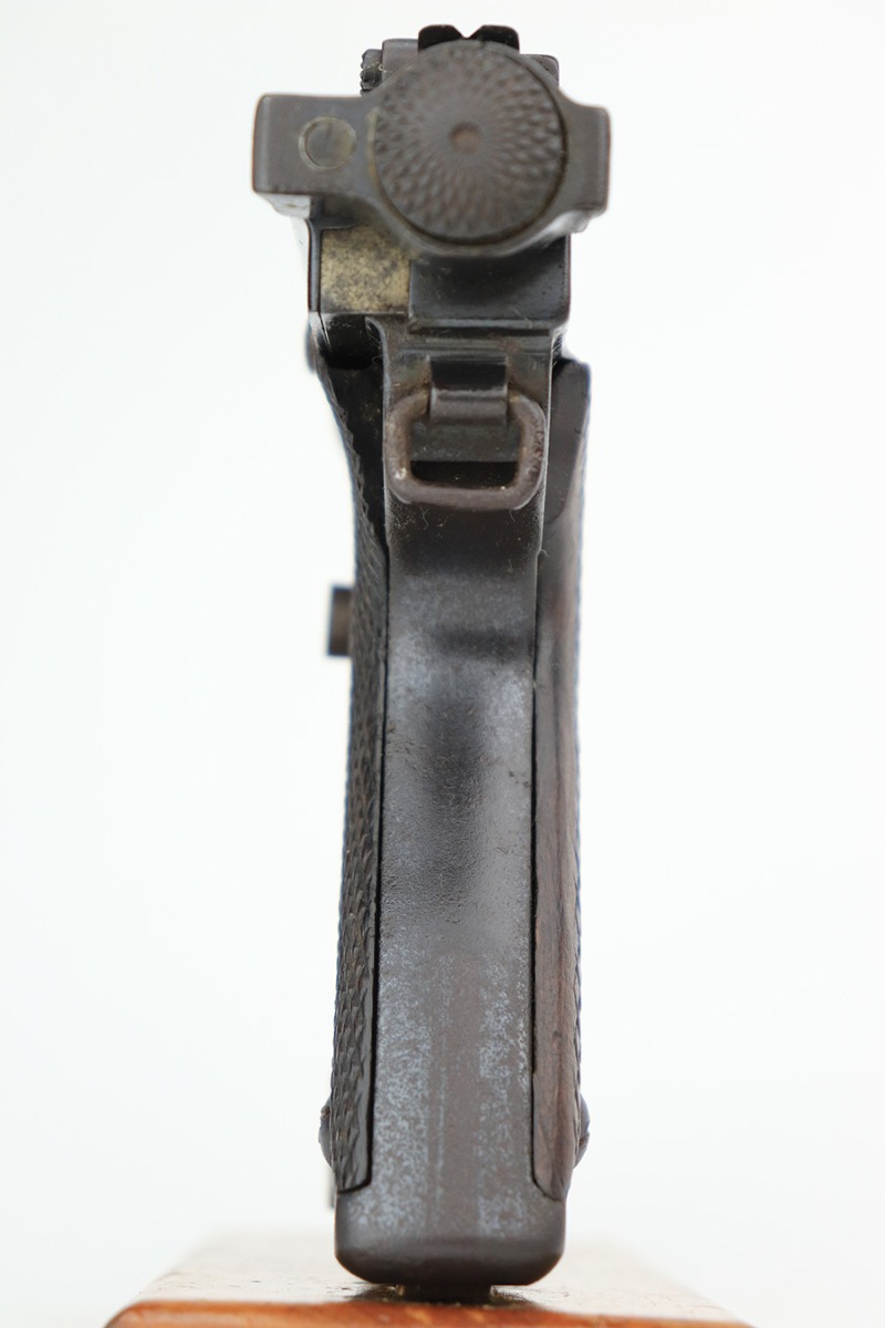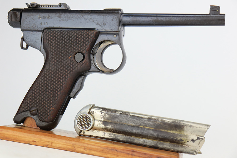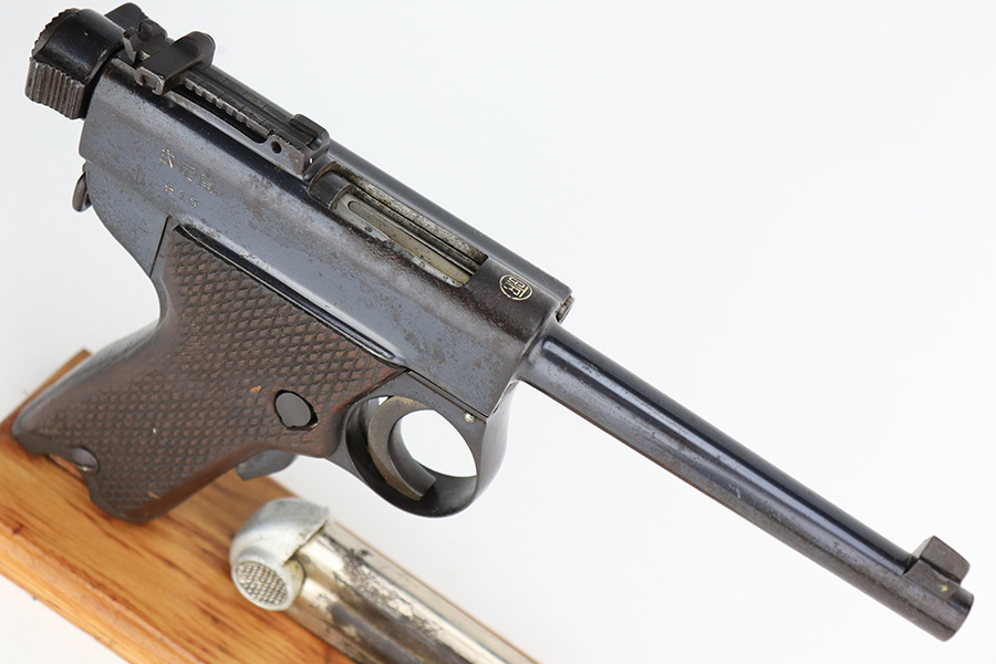 4/3/23 – This a very nice example of a rare Papa Nambu manufactured by Tokyo Gas & Electric in the 1920’s. This one is all matching and has a very faint anchor marking near the serial number, indicating it was issued to the Japanese Navy. This particular pistol also has a very low serial number. There is very little actual bluing loss, but there is noticeable spotty oxidation and pin-pricking covering the whole gun. Areas of minor pitting here and there. Fitted with nice wood grips – the left panel is numbered and matching, no legible numbering on the right side. Comes with a period-correct but mismatched magazine. The rifling in the bore is fairly worn with small spots of oxidation here and there.