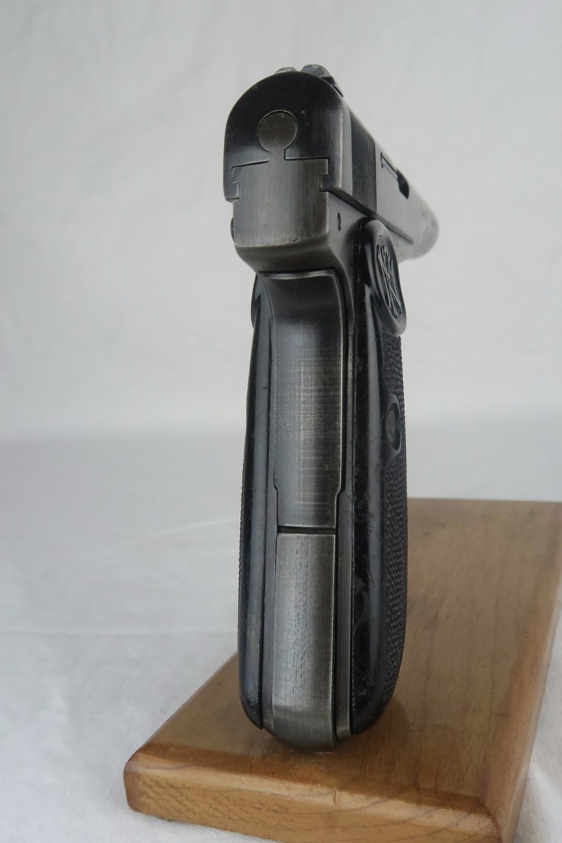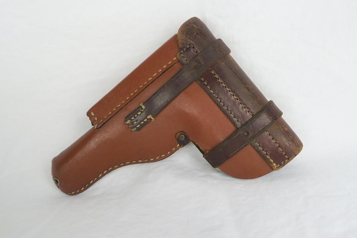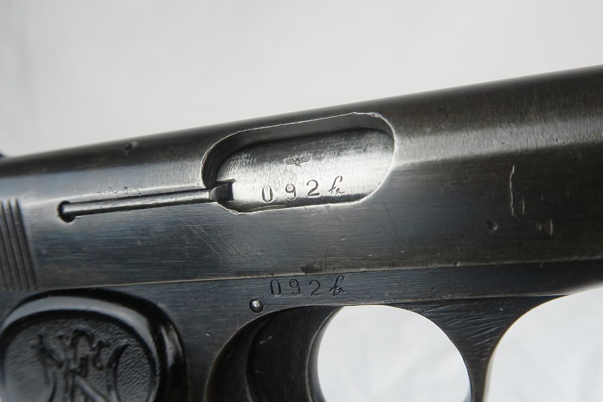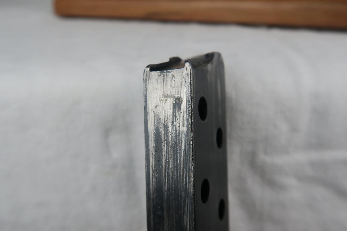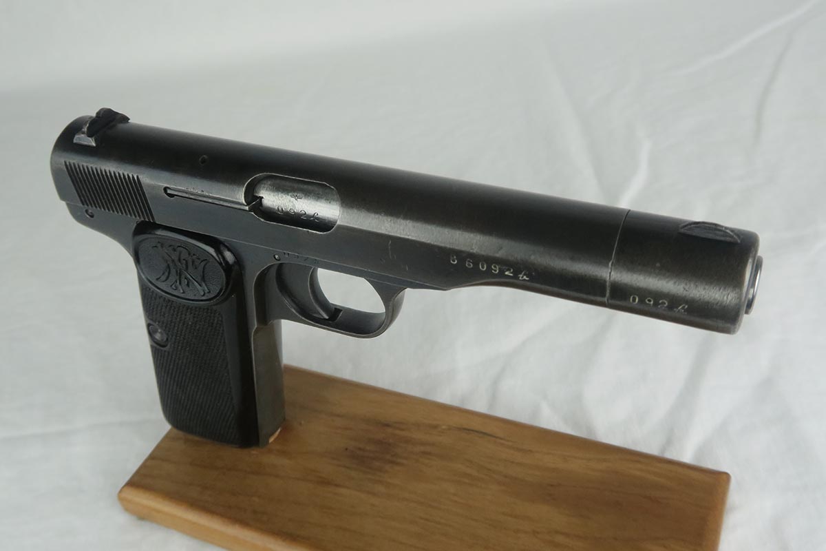 11/29/17 – This is a Nazi FN Browning 1922 from World War II. The original finish is about 85% with no rust or pitting. The slide shows some finish loss, and the front strap is thin.  All parts are matching and it is E/WaA140 on the slide and frame. FN black grips and two correct magazines. Minty bore. It comes with a late war Ersatz holster. These were made from parts, and it appears to have a faint Eagle/2 proof. Cool rig!