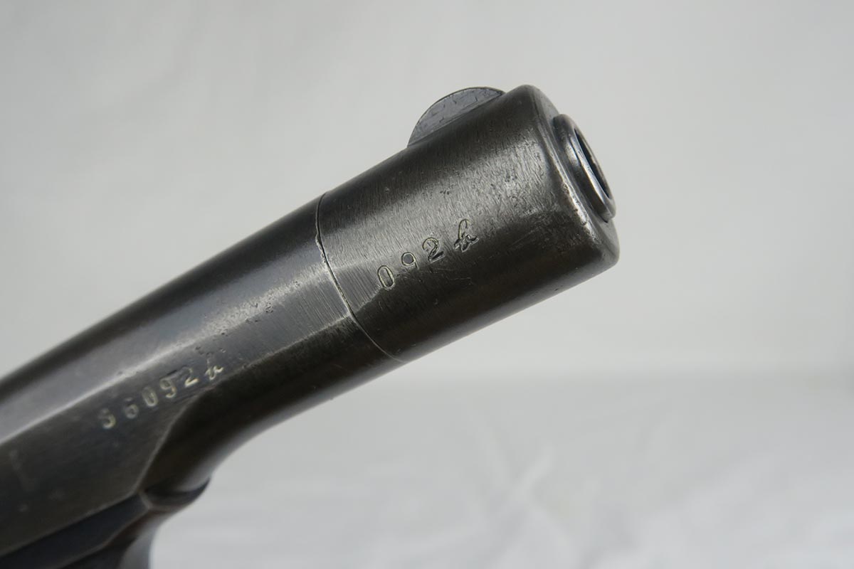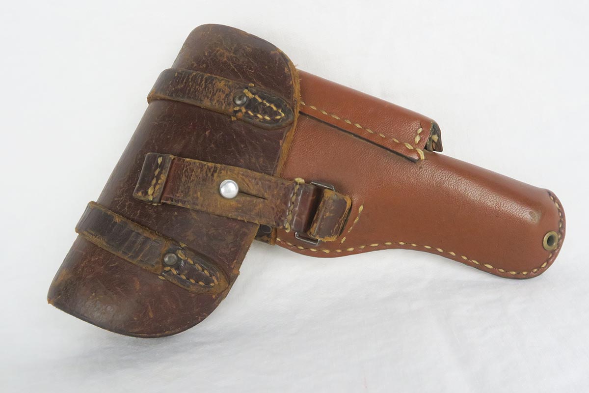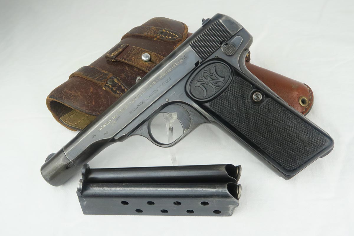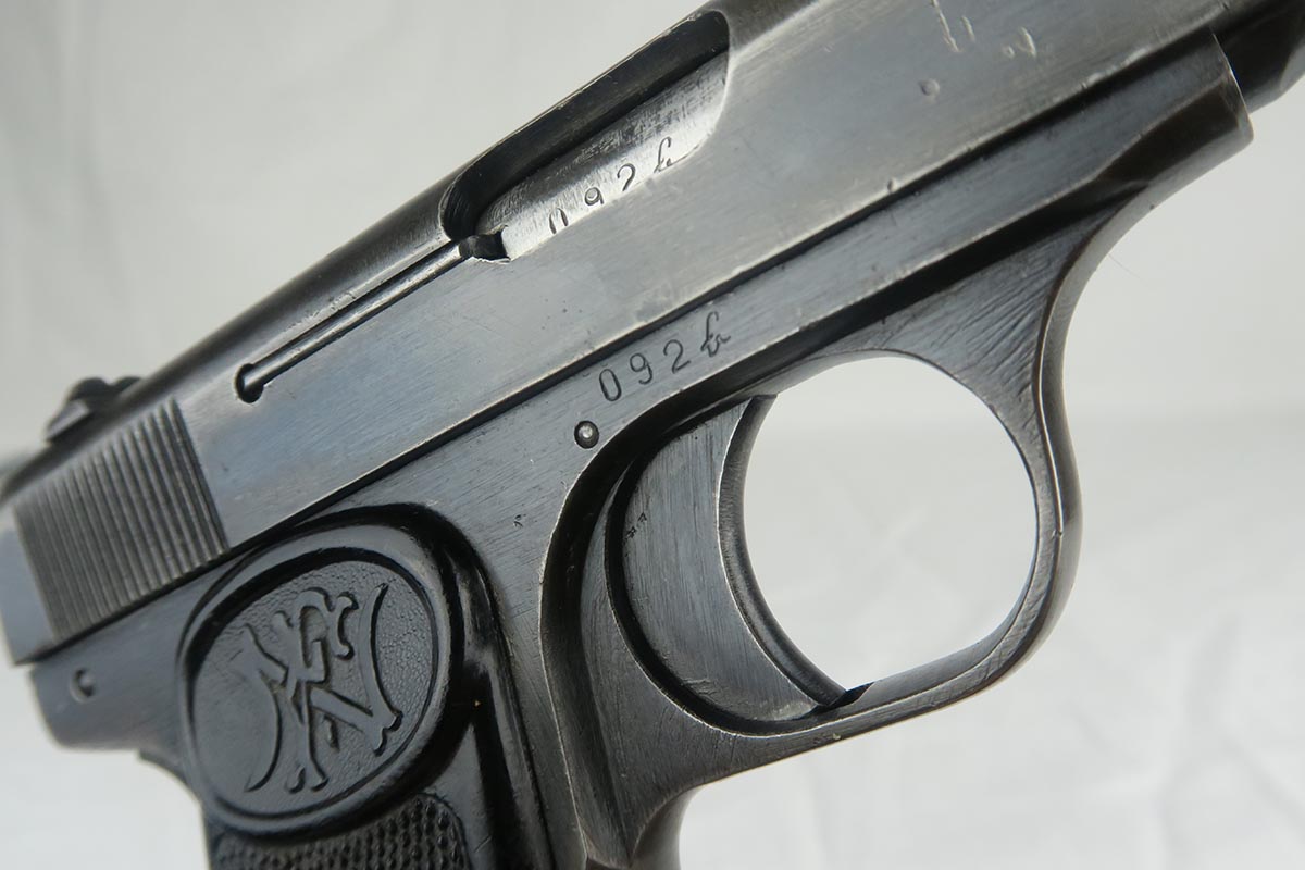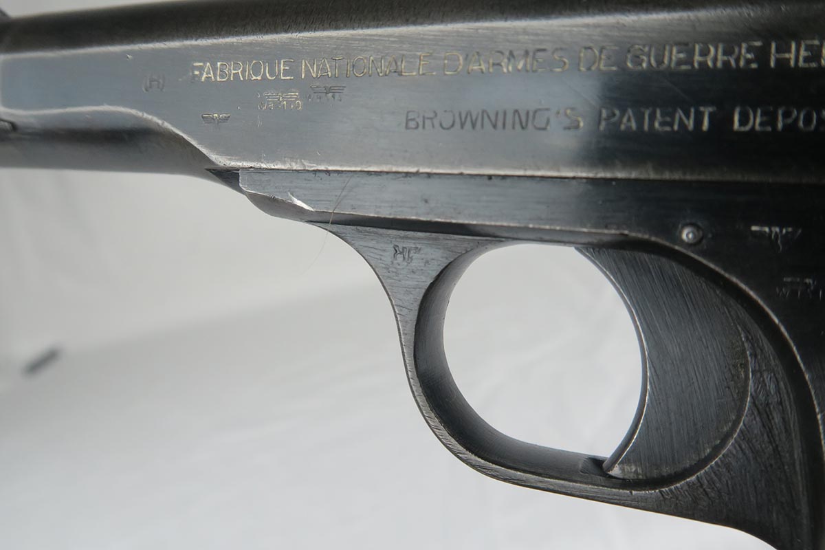11/29/17 – This is a Nazi FN Browning 1922 from World War II. The original finish is about 85% with no rust or pitting. The slide shows some finish loss, and the front strap is thin.  All parts are matching and it is E/WaA140 on the slide and frame. FN black grips and two correct magazines. Minty bore. It comes with a late war Ersatz holster. These were made from parts, and it appears to have a faint Eagle/2 proof. Cool rig!