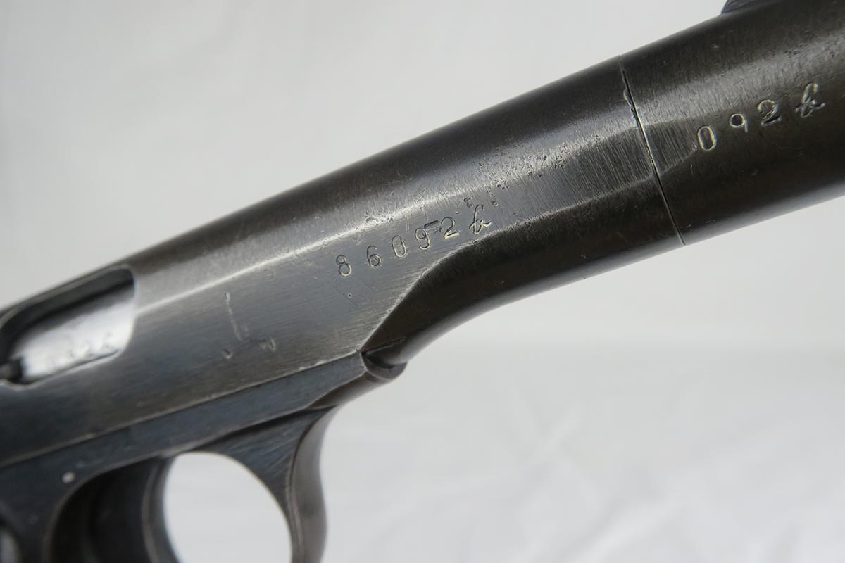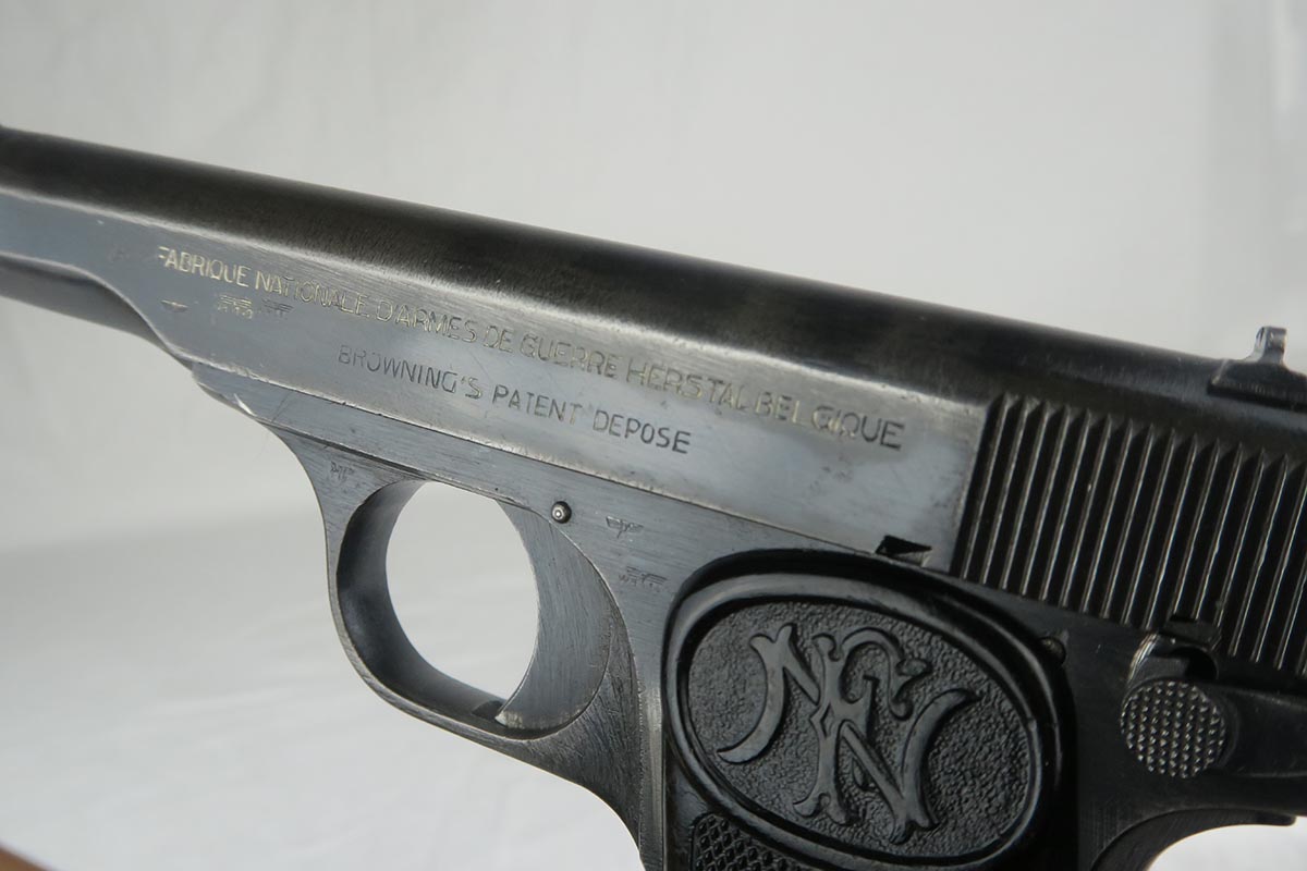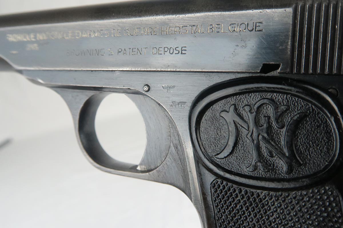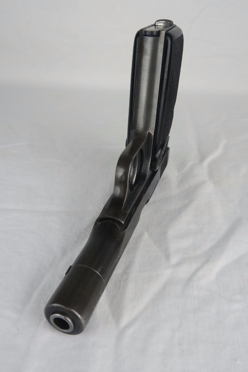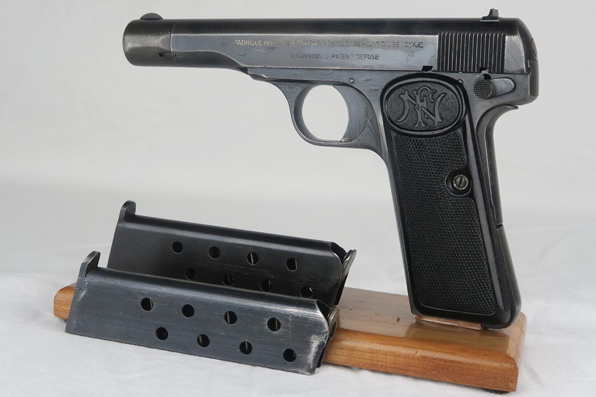 11/29/17 – This is a Nazi FN Browning 1922 from World War II. The original finish is about 85% with no rust or pitting. The slide shows some finish loss, and the front strap is thin.  All parts are matching and it is E/WaA140 on the slide and frame. FN black grips and two correct magazines. Minty bore. It comes with a late war Ersatz holster. These were made from parts, and it appears to have a faint Eagle/2 proof. Cool rig!