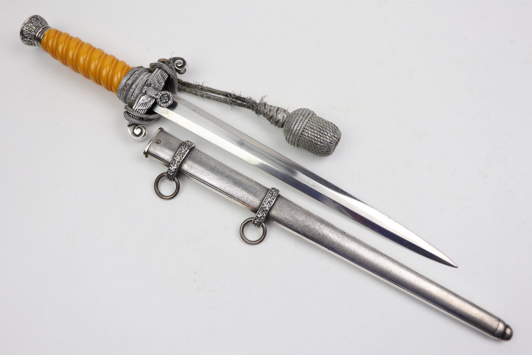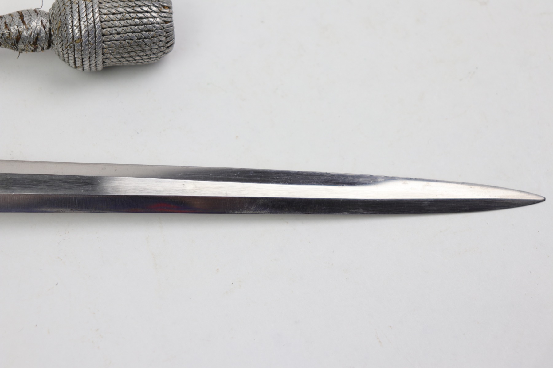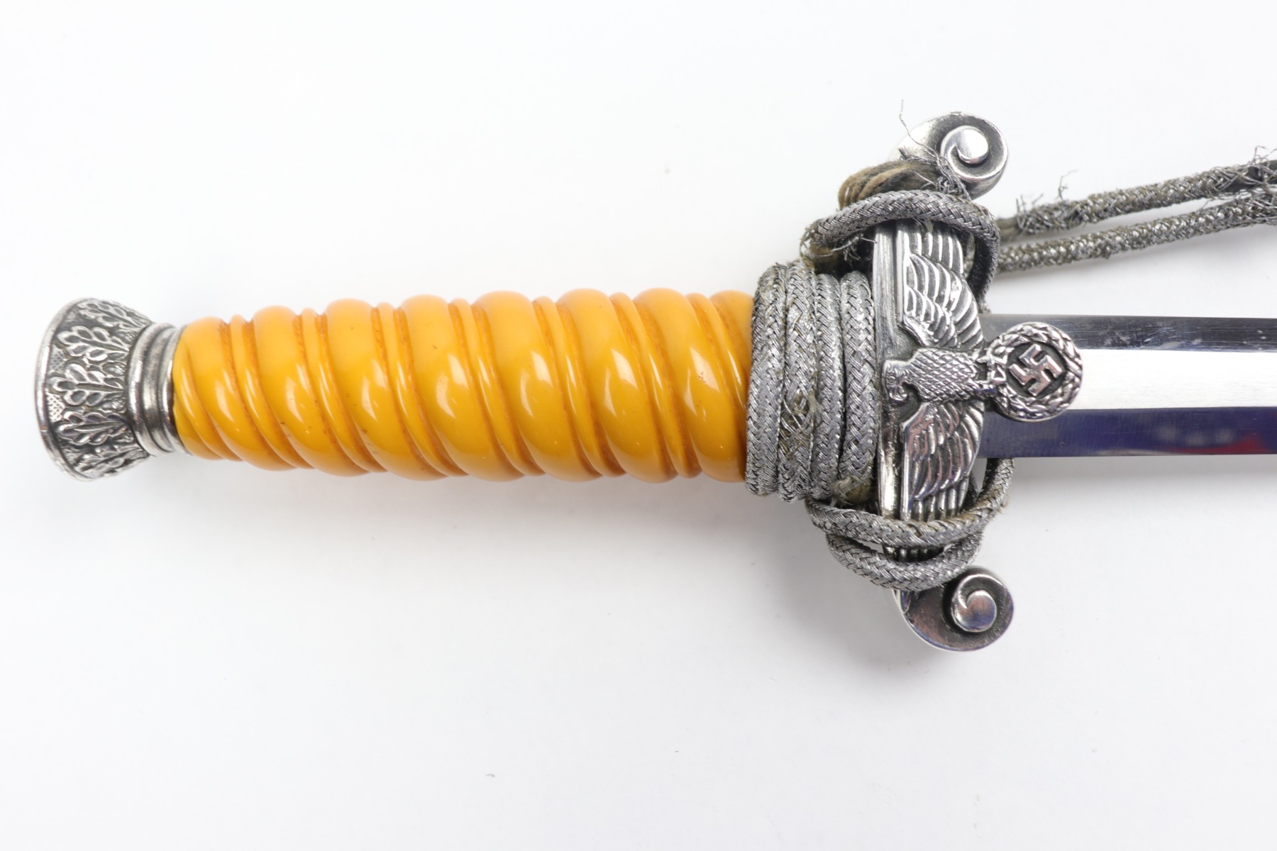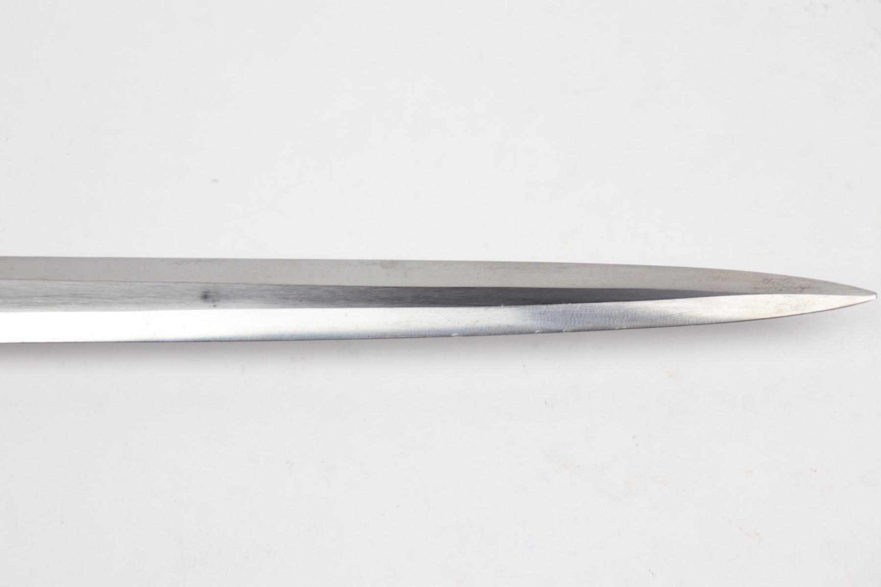 12/23/20 – This is an original, excellent condition nazi army dagger. This dagger comes with an original sheath and portepee. The dagger has a 1st variation hand guard and a burnt orange bakelite handle with no cracks or chips. The blade is excellent and very clean. Cross graining is evident and the maker marking is crisp. Only some mild surface scratching from the sheath. The portepee has some fraying, as shown. Excellent sheath with no dents or issues.