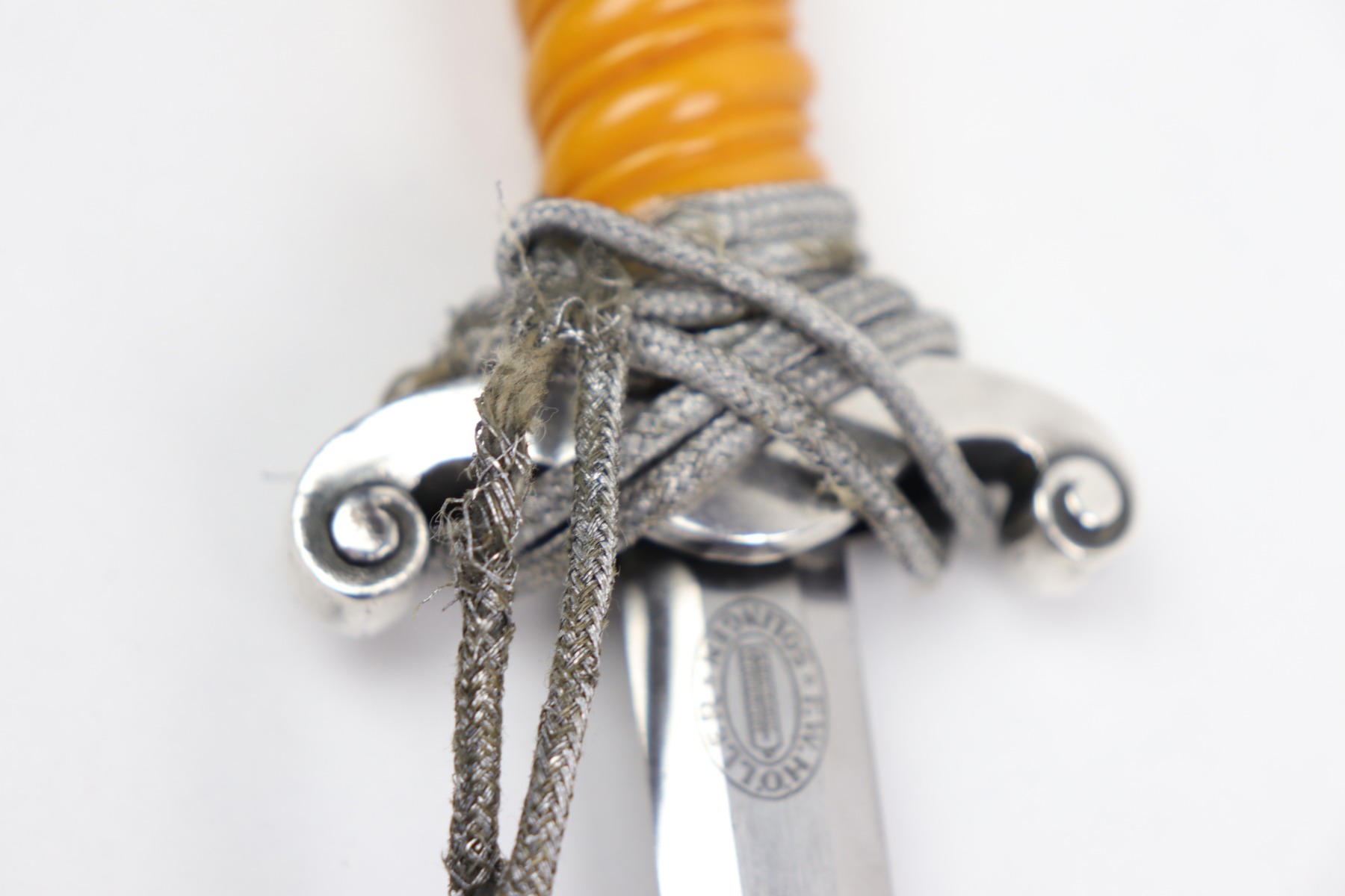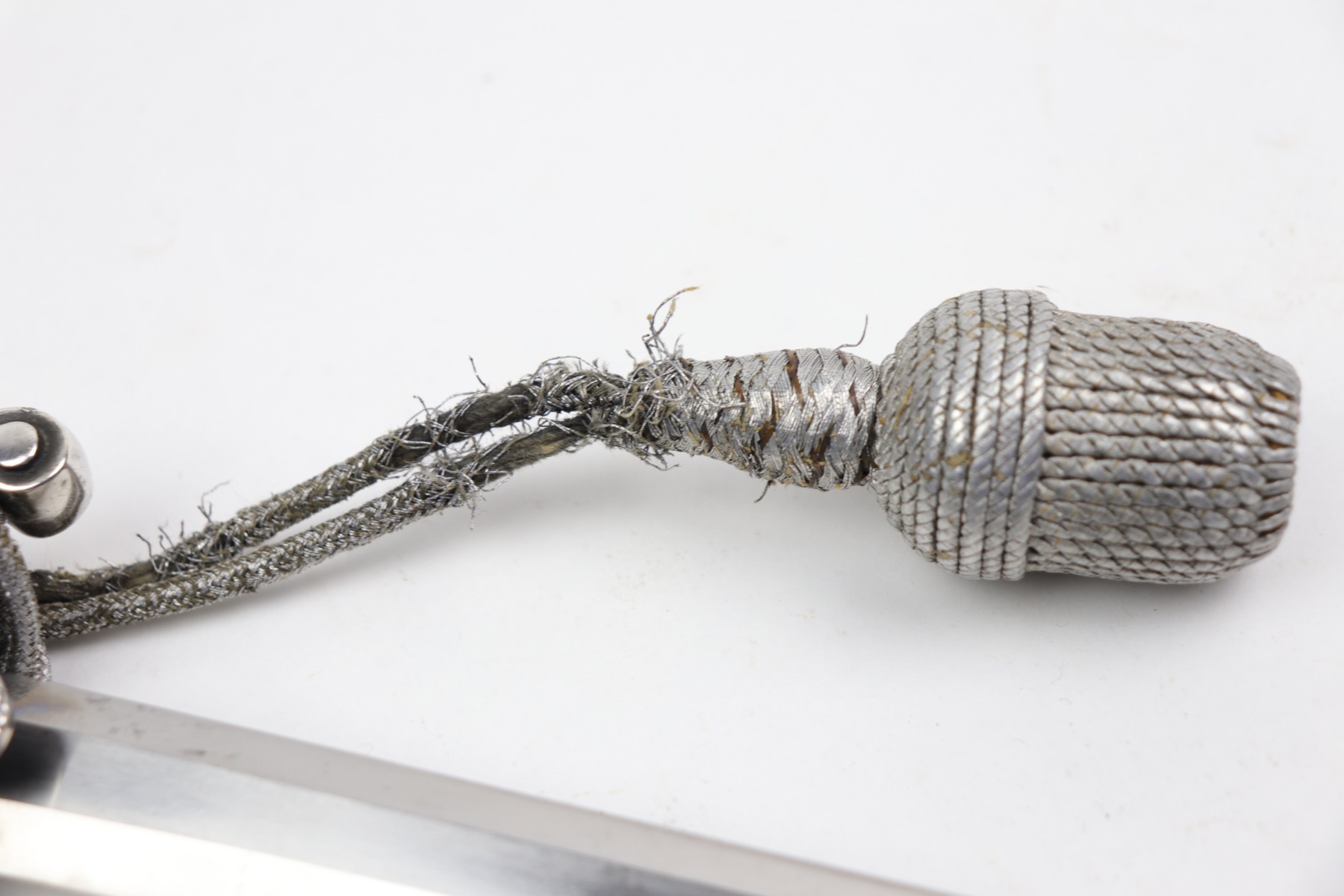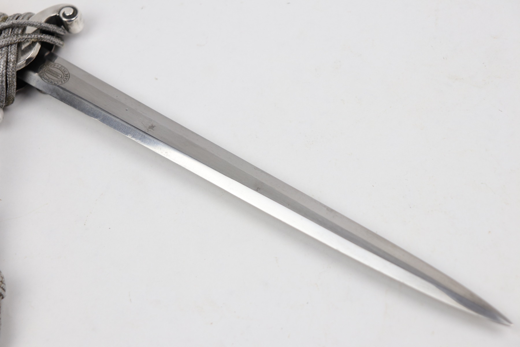 12/23/20 – This is an original, excellent condition nazi army dagger. This dagger comes with an original sheath and portepee. The dagger has a 1st variation hand guard and a burnt orange bakelite handle with no cracks or chips. The blade is excellent and very clean. Cross graining is evident and the maker marking is crisp. Only some mild surface scratching from the sheath. The portepee has some fraying, as shown. Excellent sheath with no dents or issues.