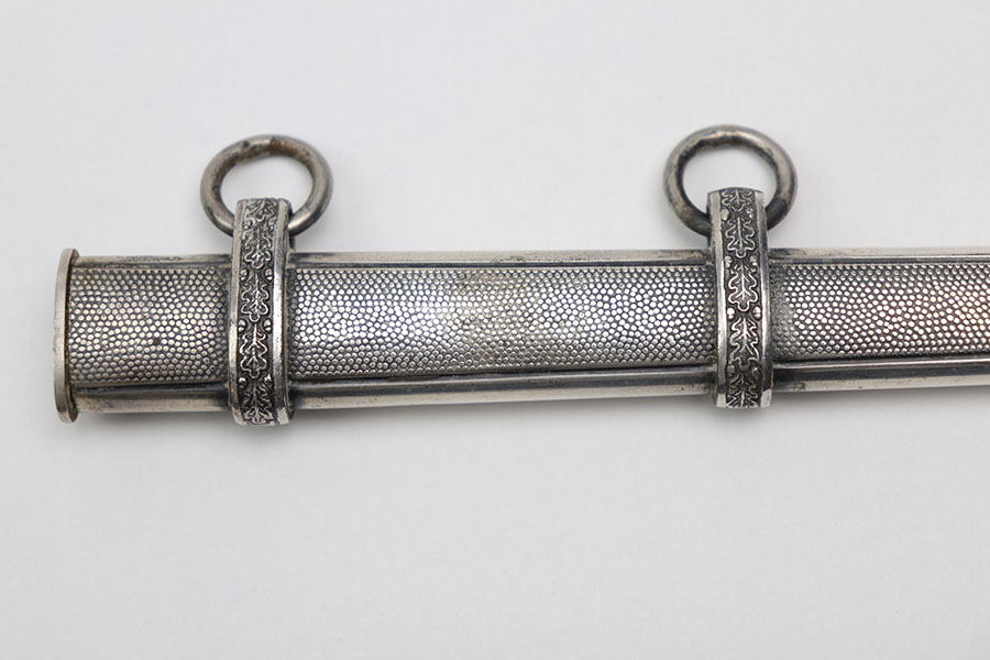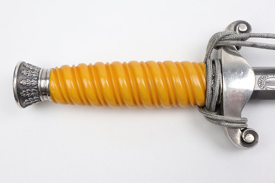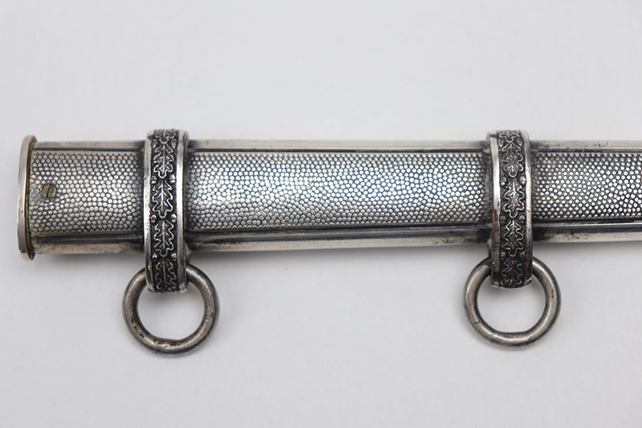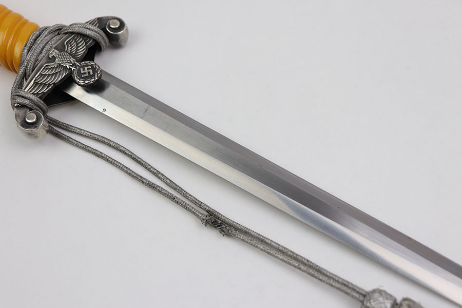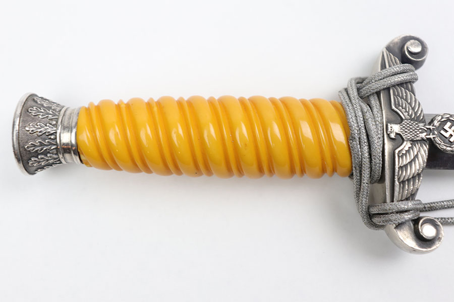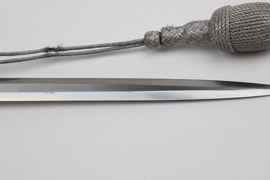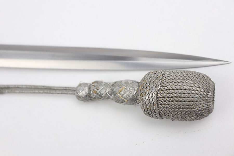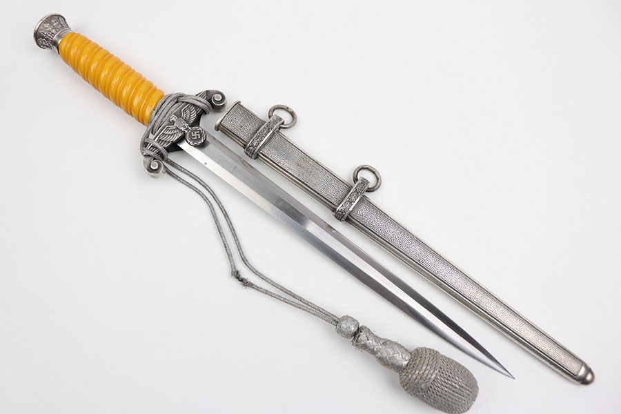 12/31/20 – This is an excellent condition F.W. Holler army dagger with an original portepee. The dagger is in minty overall condition with minimal wear on the blade. No cracks on the bakelite handle. The scabbard is minty as well with no dents or issues.