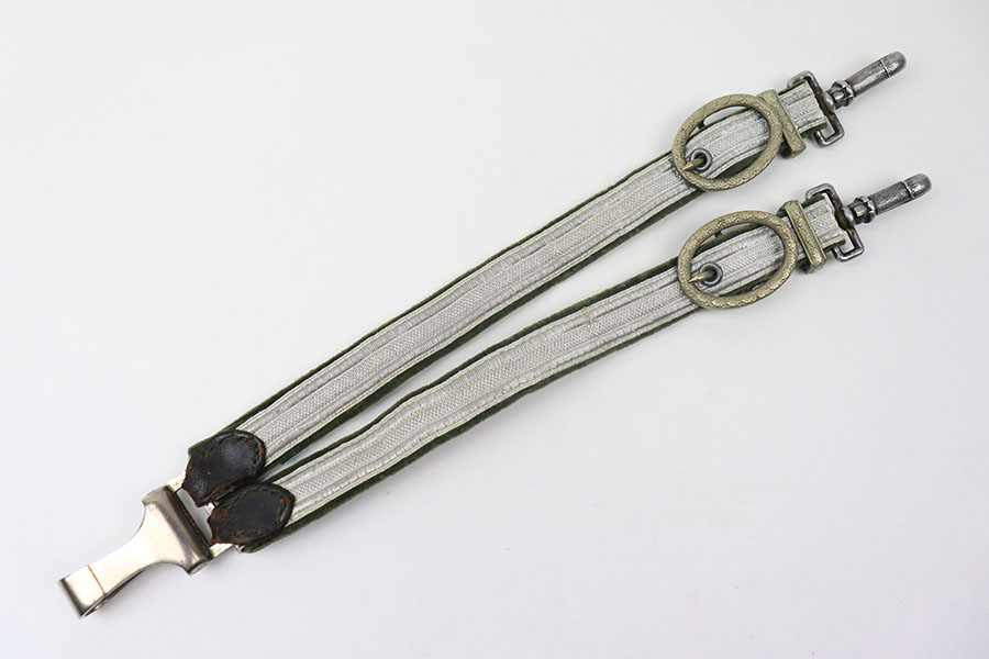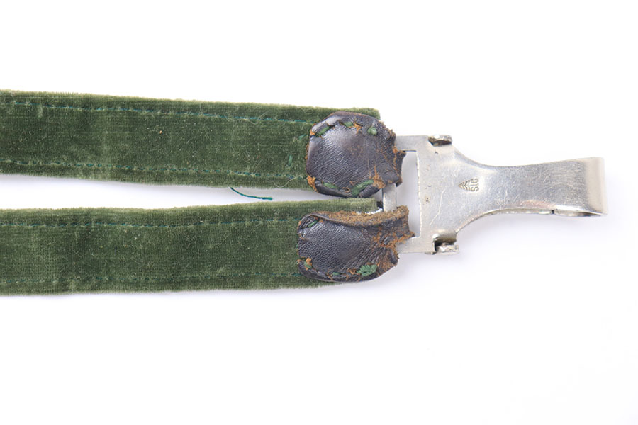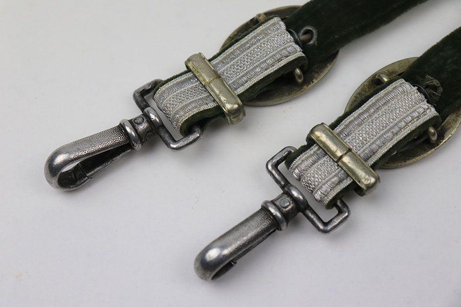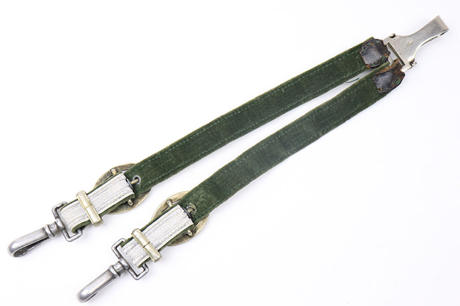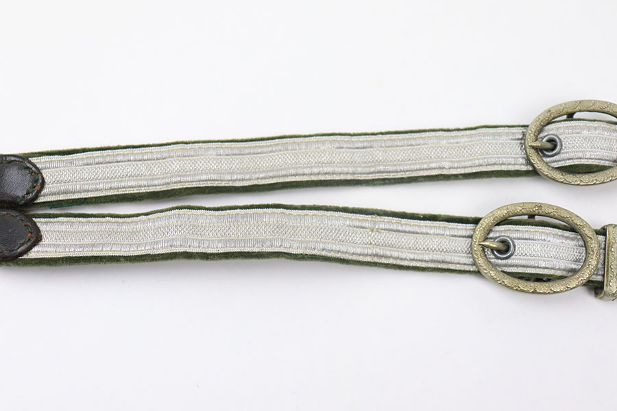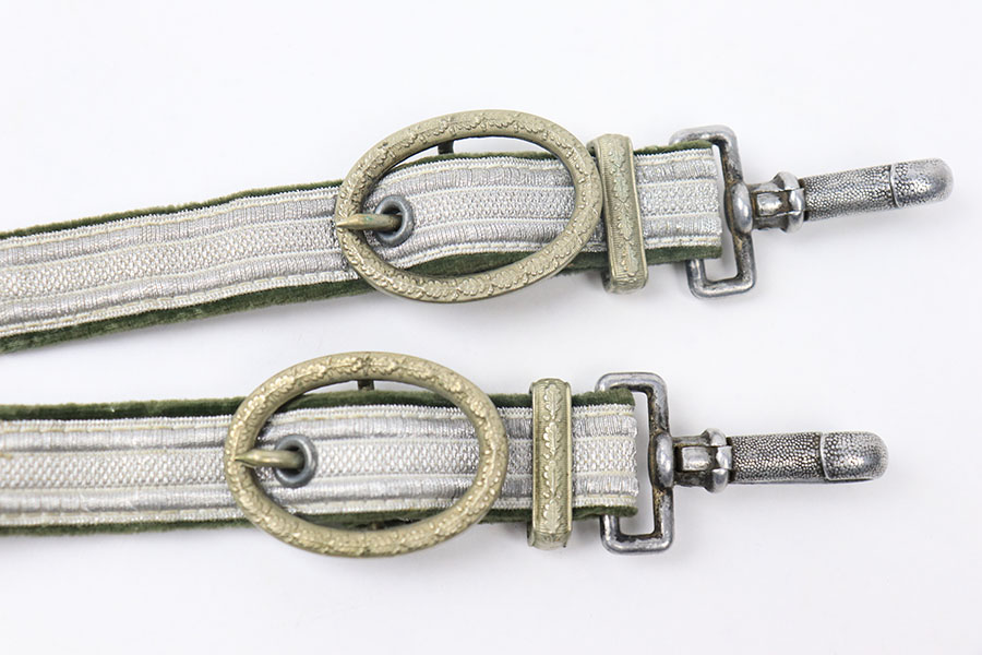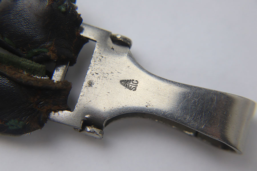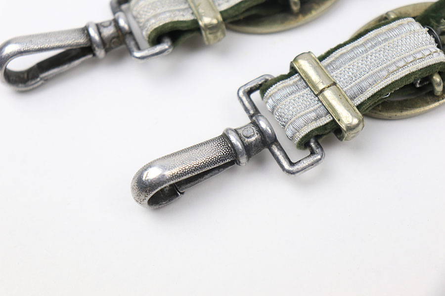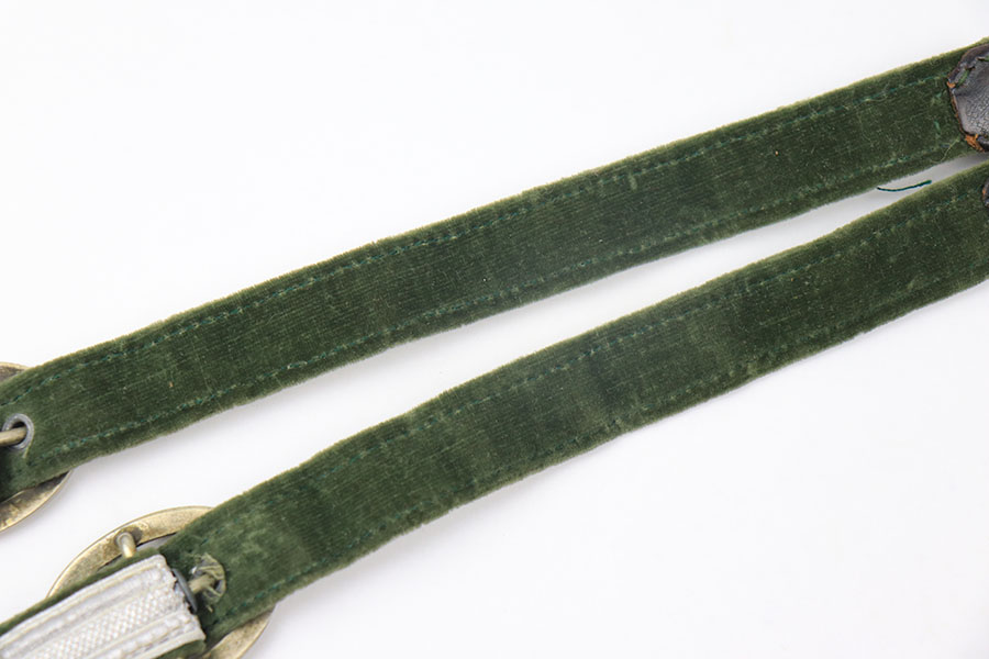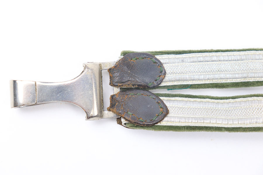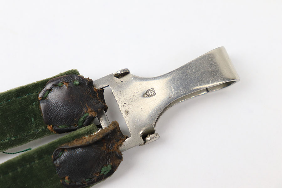 12/30/22 – This is an original WW2 hanger for a Nazi Army dagger. The hanger is in excellent overall condition with very nice silver and green material. Some light tattering on the leather pieces that attach to the clip. The clip is maker stamped with a tree logo and “SC”. The metal parts have some mild patina but no major issues.