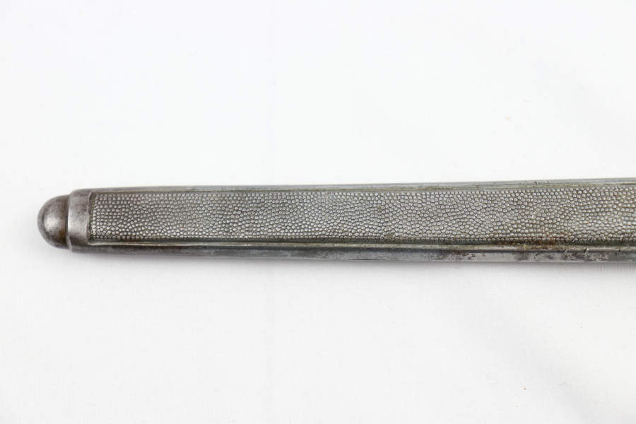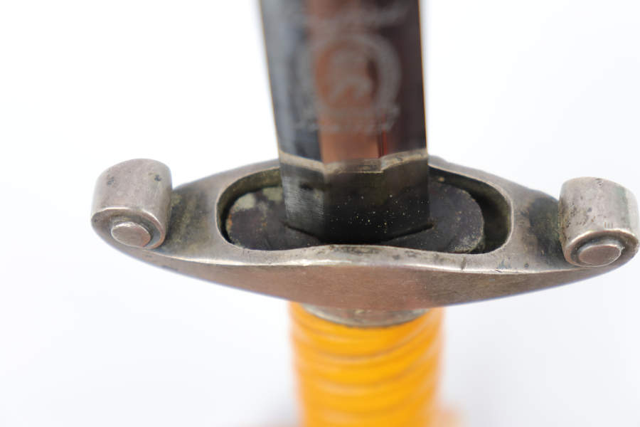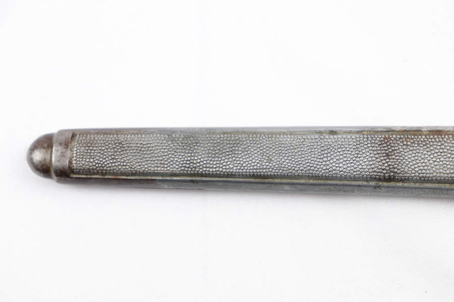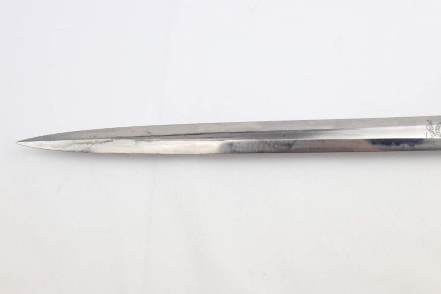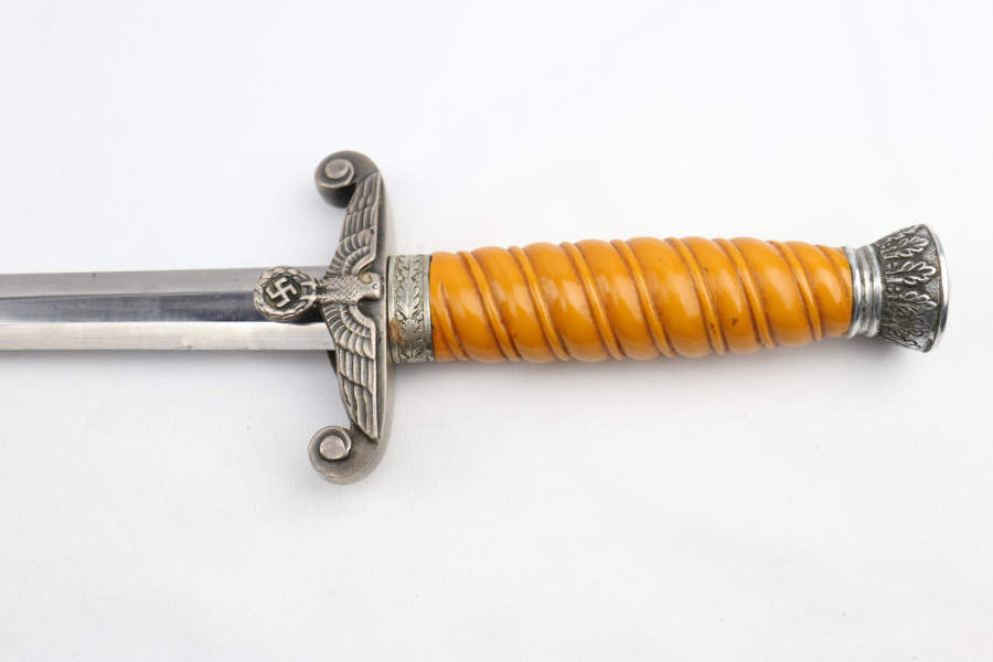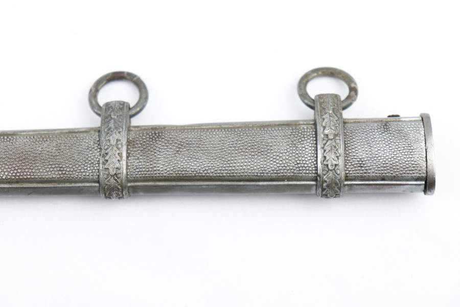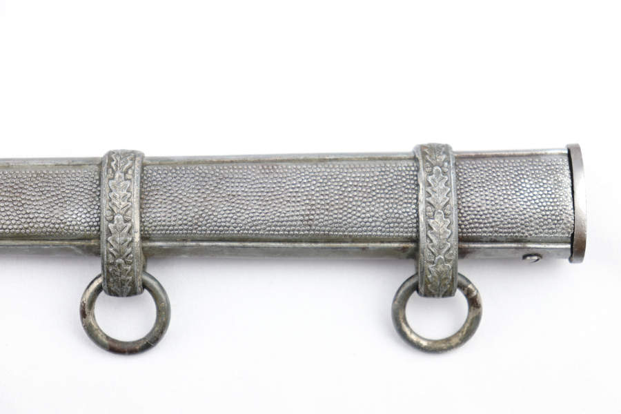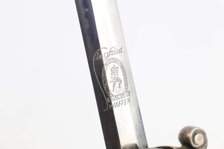 9/23/19 – This is an original WW2 Nazi Army Dagger made by Ernest Pack Siegfried. The makers mark on the blade reads “Siegfried Waffen Ernest Pack and Sohne M.B.H Waffenfabrik”. This is a fairly scarce and uncommon maker. The blade is in excellent condition. The grip and pommel are also in excellent condition. The scabbard is in great condition except for some minor discoloration throughout. Similar maker marked, all original army daggers are priced near $600-700.