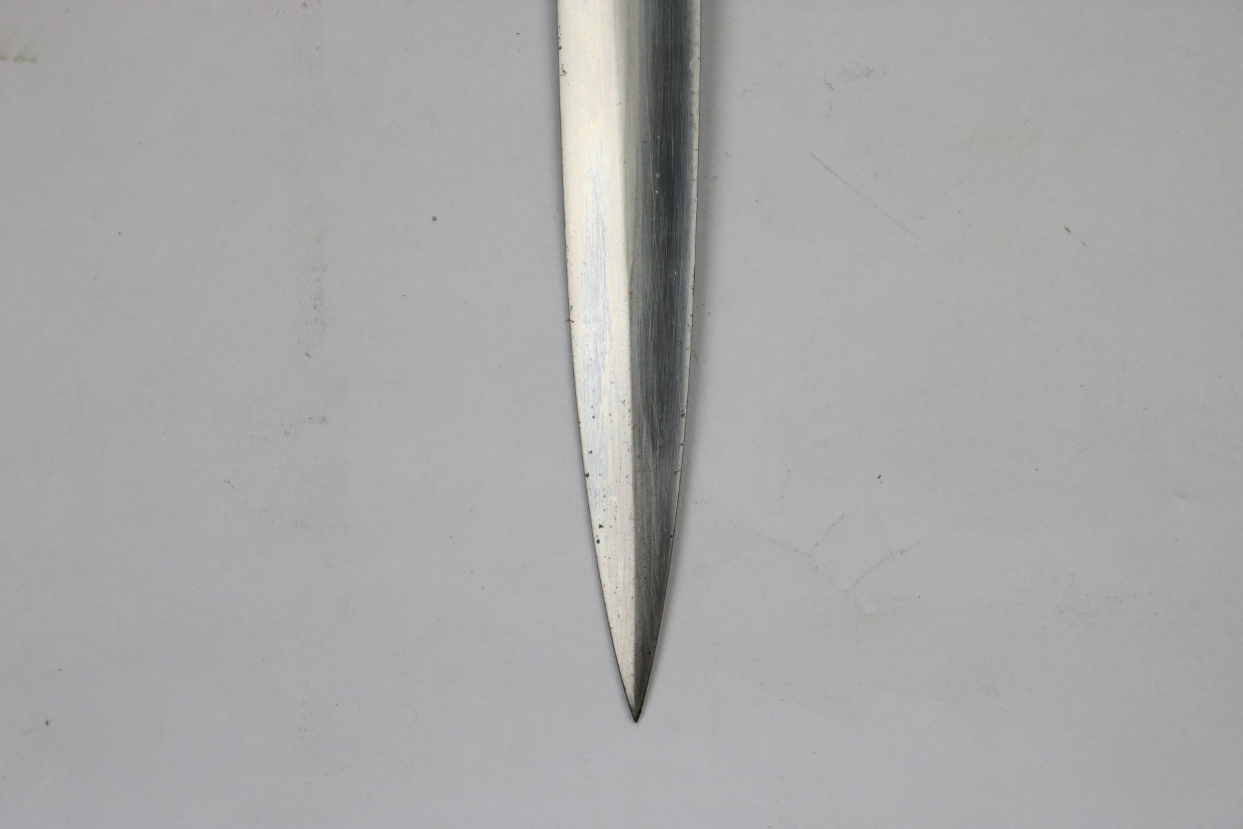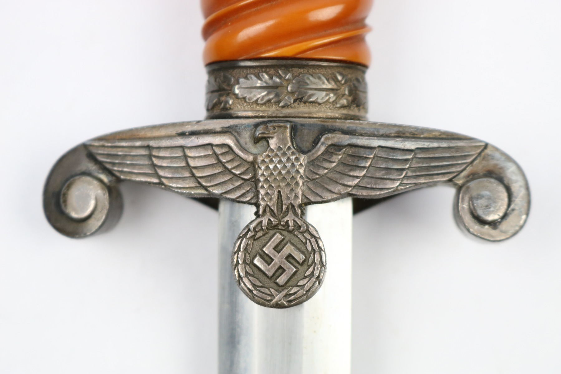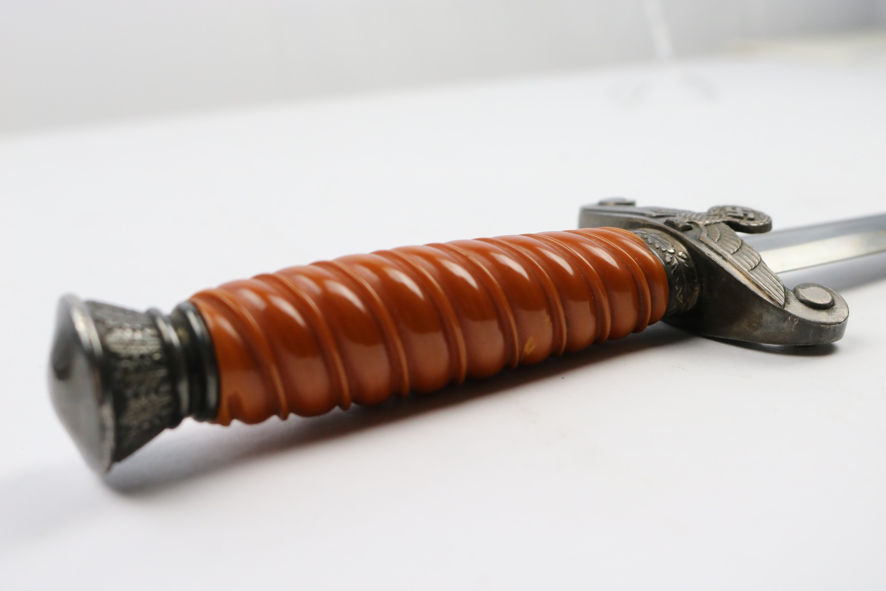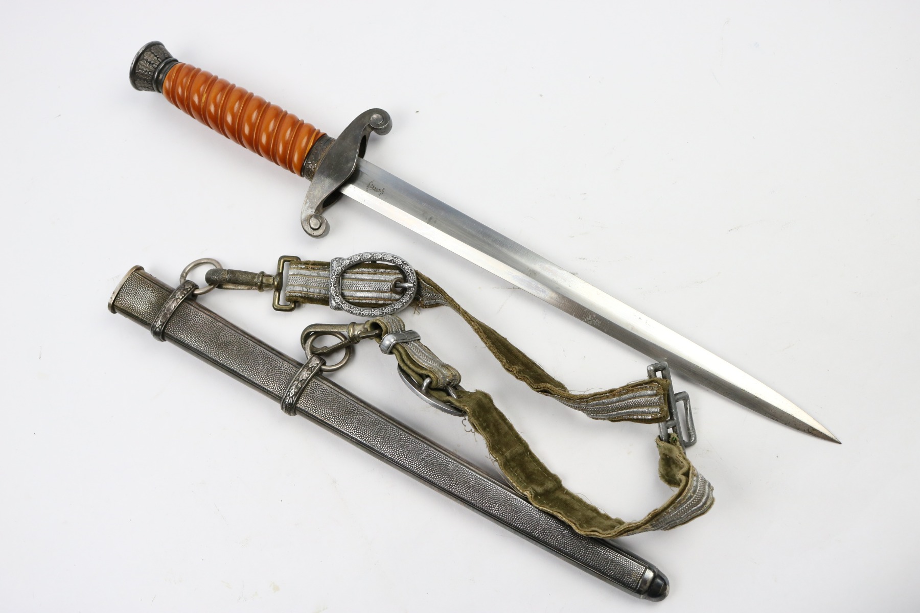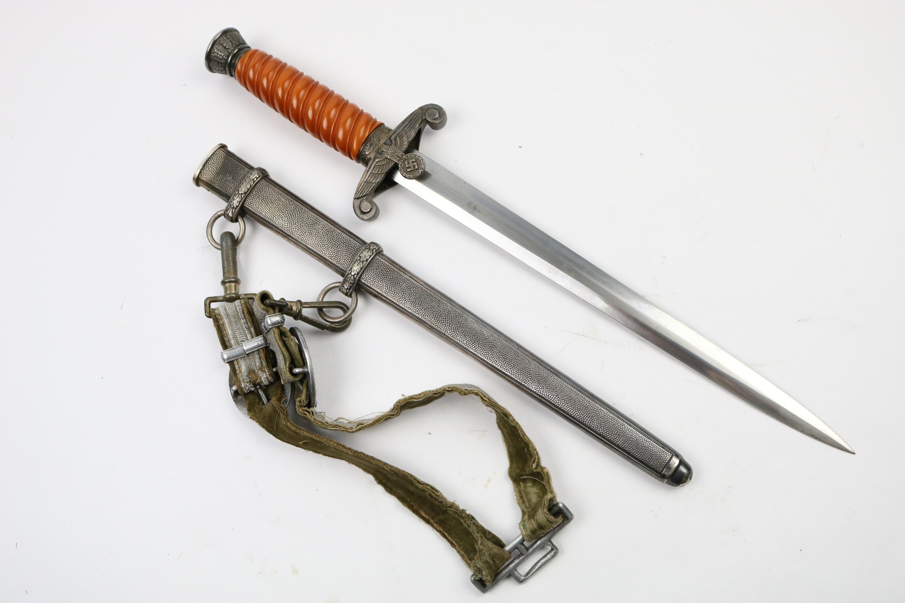 6/19/18 – This is an original WW2 production nazi army dagger. The dagger comes with a period correct uniform hanger. The hanger is unmarked with aluminum fittings and all clips functional. There’s some light cloth fraying, but overall this is in great shape. The scabbard has no dents or issues. The handle has no cracks and is all original orange bakelite. The blade is maker stamped A.W. Jr. and in beautiful condition. A few light scuffs and light oxidation, but no glaring issues. Guaranteed original.