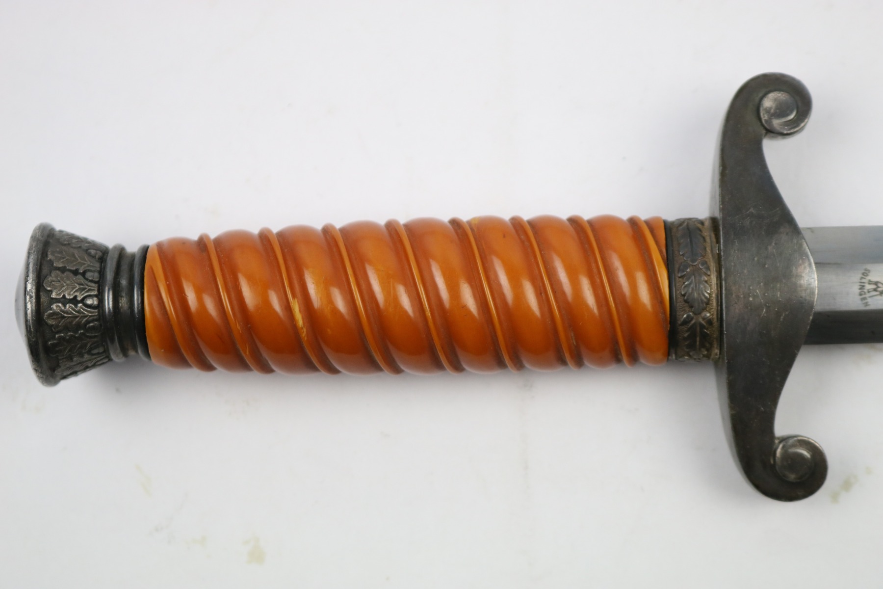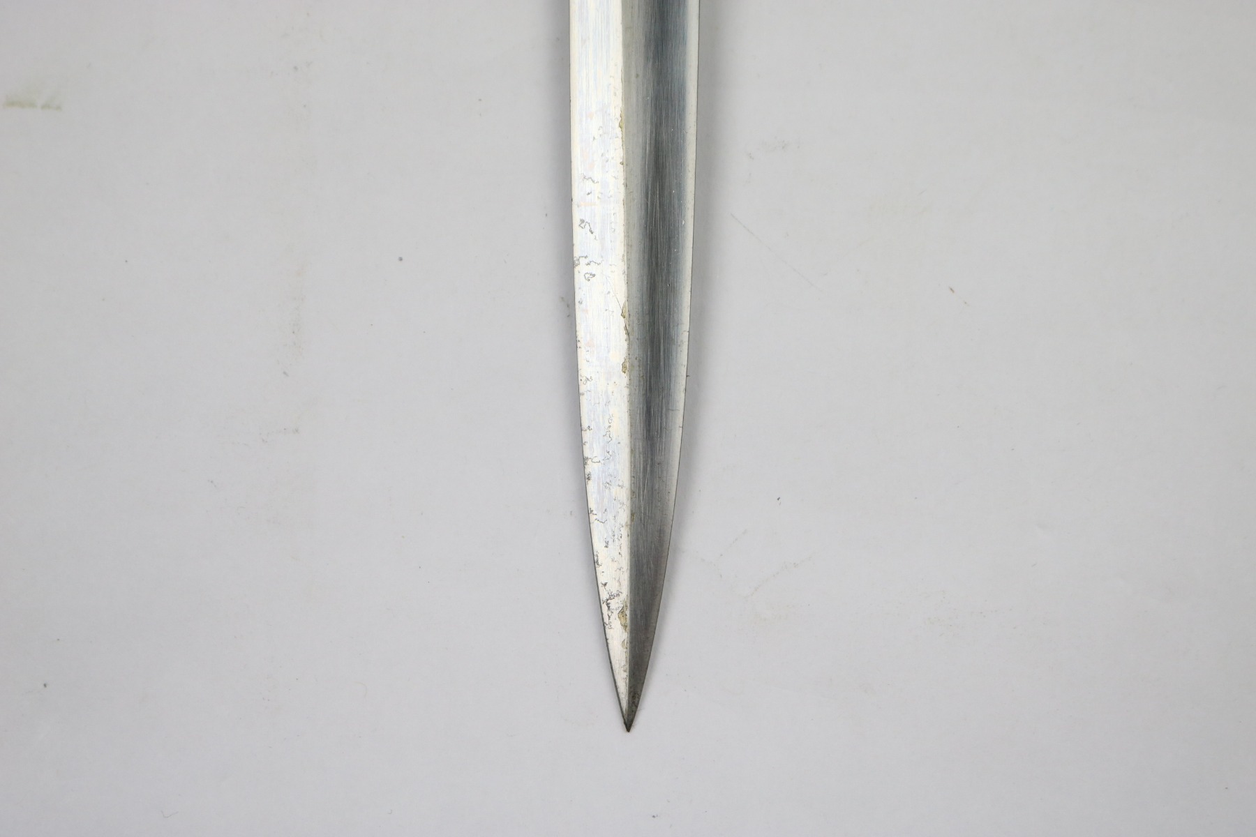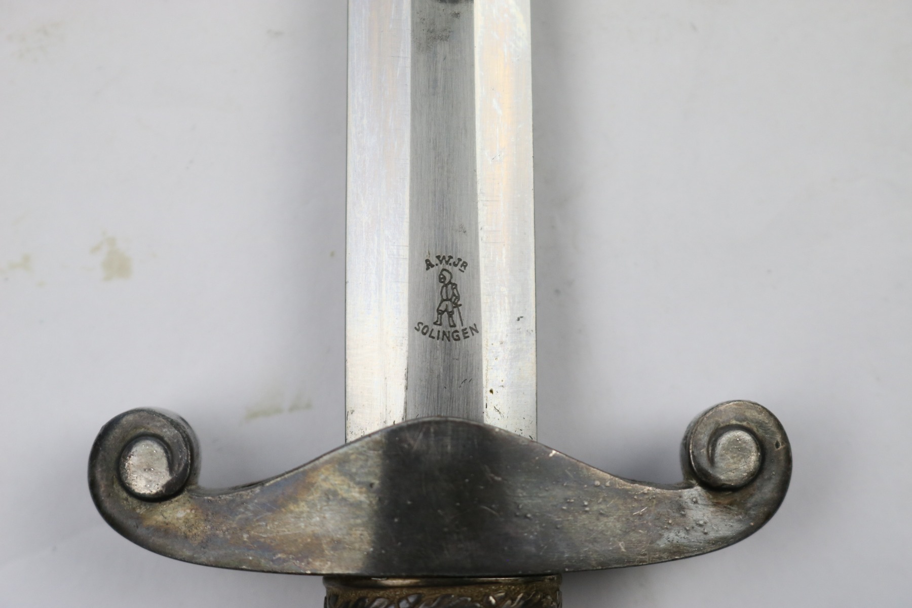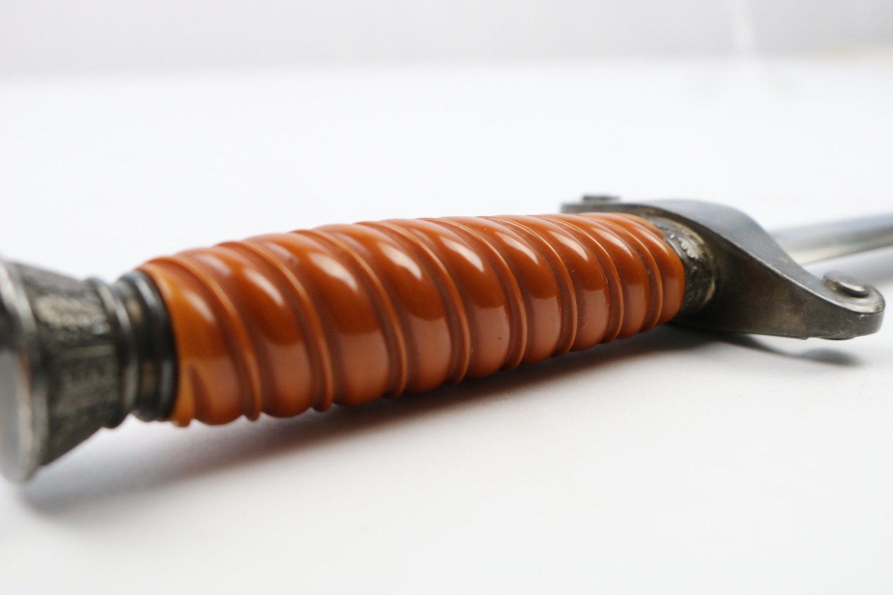 6/19/18 – This is an original WW2 production nazi army dagger. The dagger comes with a period correct uniform hanger. The hanger is unmarked with aluminum fittings and all clips functional. There’s some light cloth fraying, but overall this is in great shape. The scabbard has no dents or issues. The handle has no cracks and is all original orange bakelite. The blade is maker stamped A.W. Jr. and in beautiful condition. A few light scuffs and light oxidation, but no glaring issues. Guaranteed original.