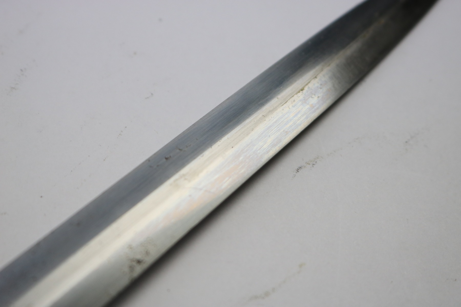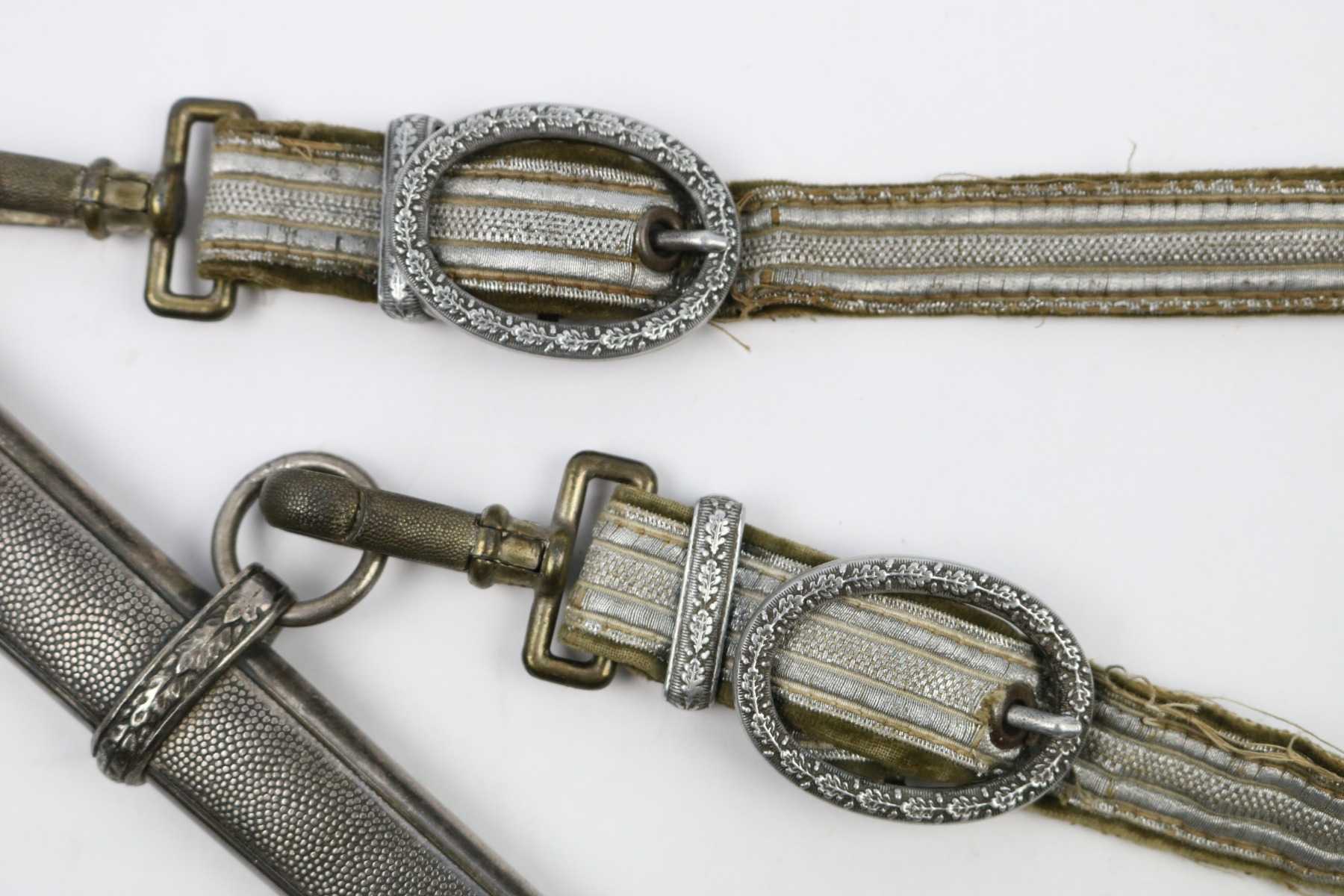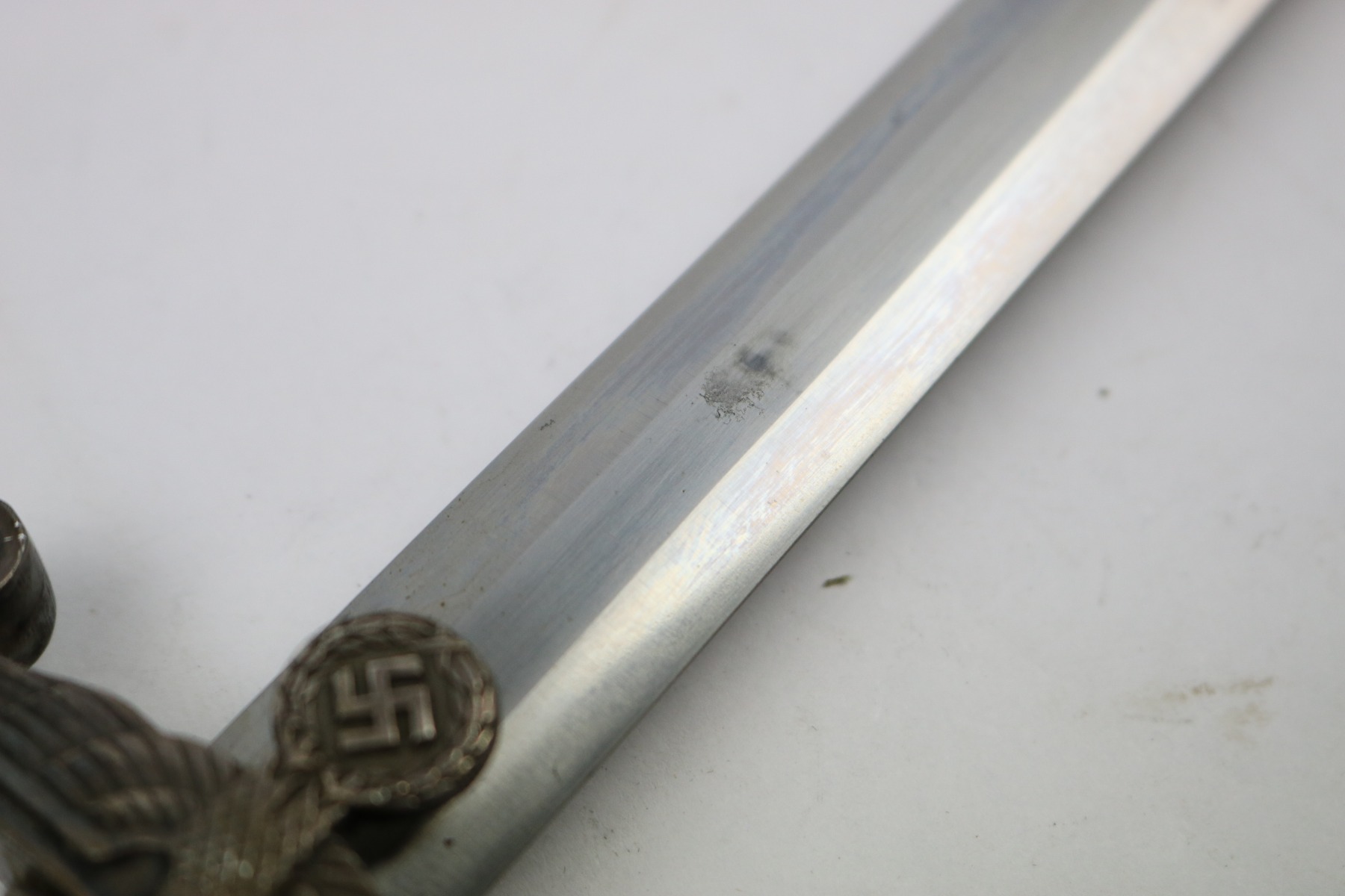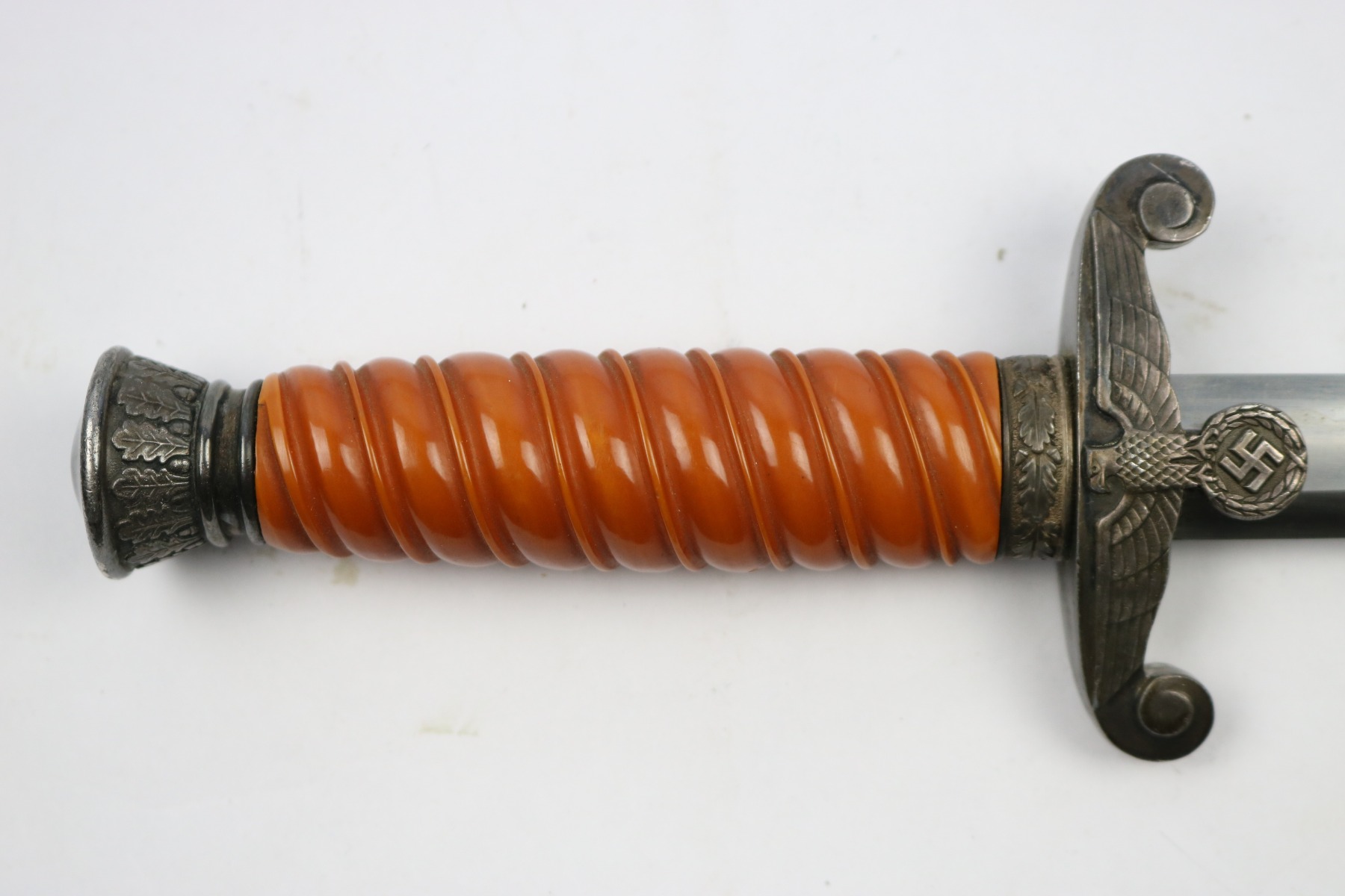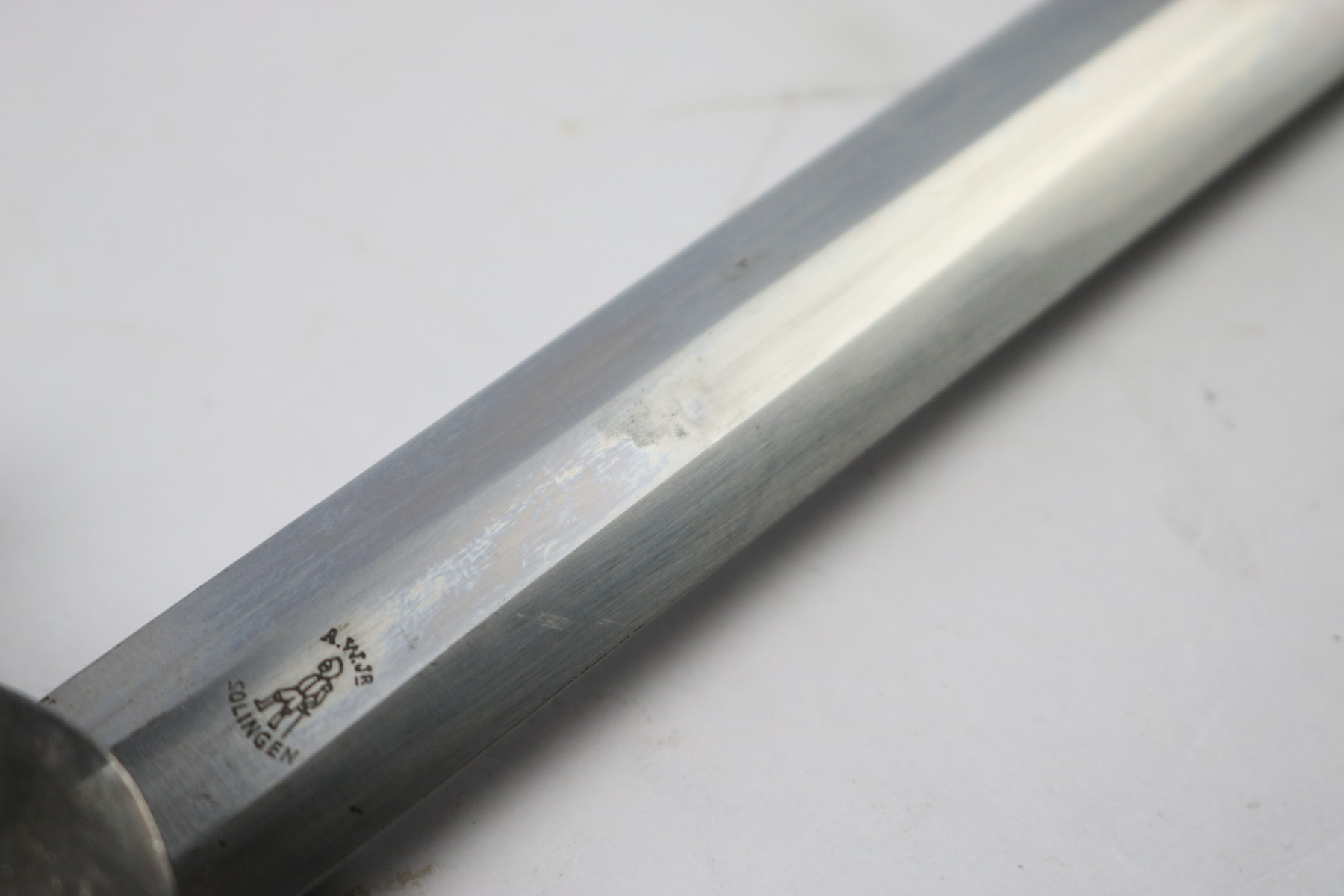 6/19/18 – This is an original WW2 production nazi army dagger. The dagger comes with a period correct uniform hanger. The hanger is unmarked with aluminum fittings and all clips functional. There’s some light cloth fraying, but overall this is in great shape. The scabbard has no dents or issues. The handle has no cracks and is all original orange bakelite. The blade is maker stamped A.W. Jr. and in beautiful condition. A few light scuffs and light oxidation, but no glaring issues. Guaranteed original.