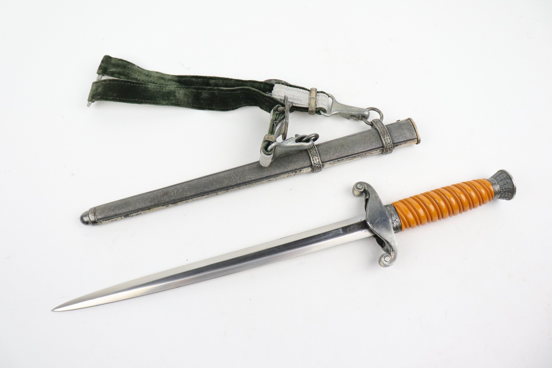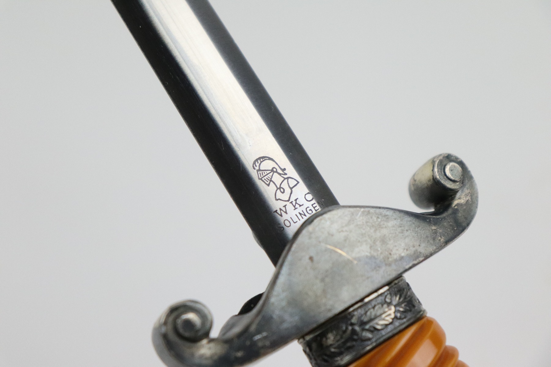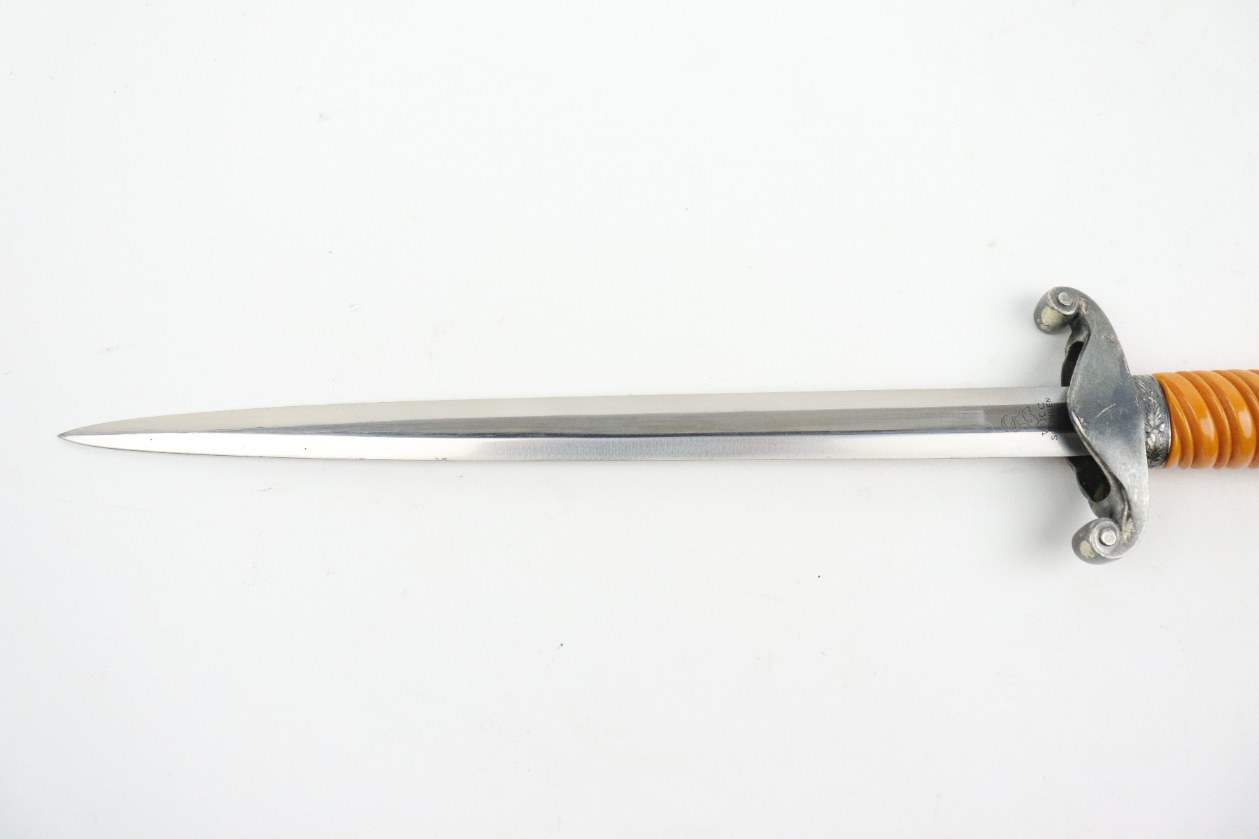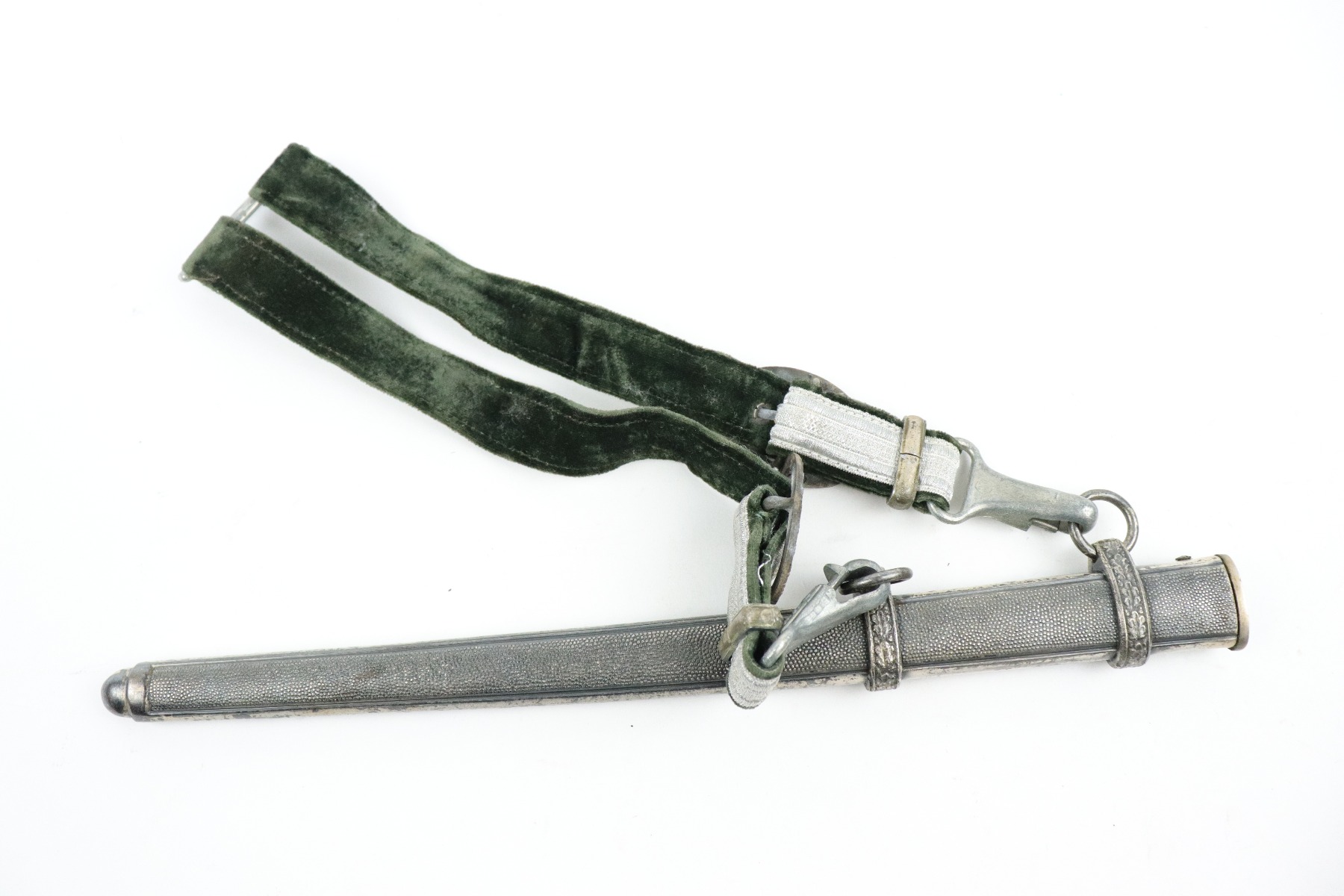 8/18/20 – This is an original WW2 Nazi dagger with an original scabbard and hanger. Overall, they are all in very nice condition. The blade is shiny and in tact with just a few small areas of light surface scratches and one or two dots of discoloration. There is wear in the finish on the cross guard and pommel. There is spotty discoloration along the sides of the scabbard. The original hanger is in tact and in excellent condition. Excellent green velvet on the reverse side. The blade is “WKC Solingen” makers marked. The leather stopper at the base of the blade is in tact.