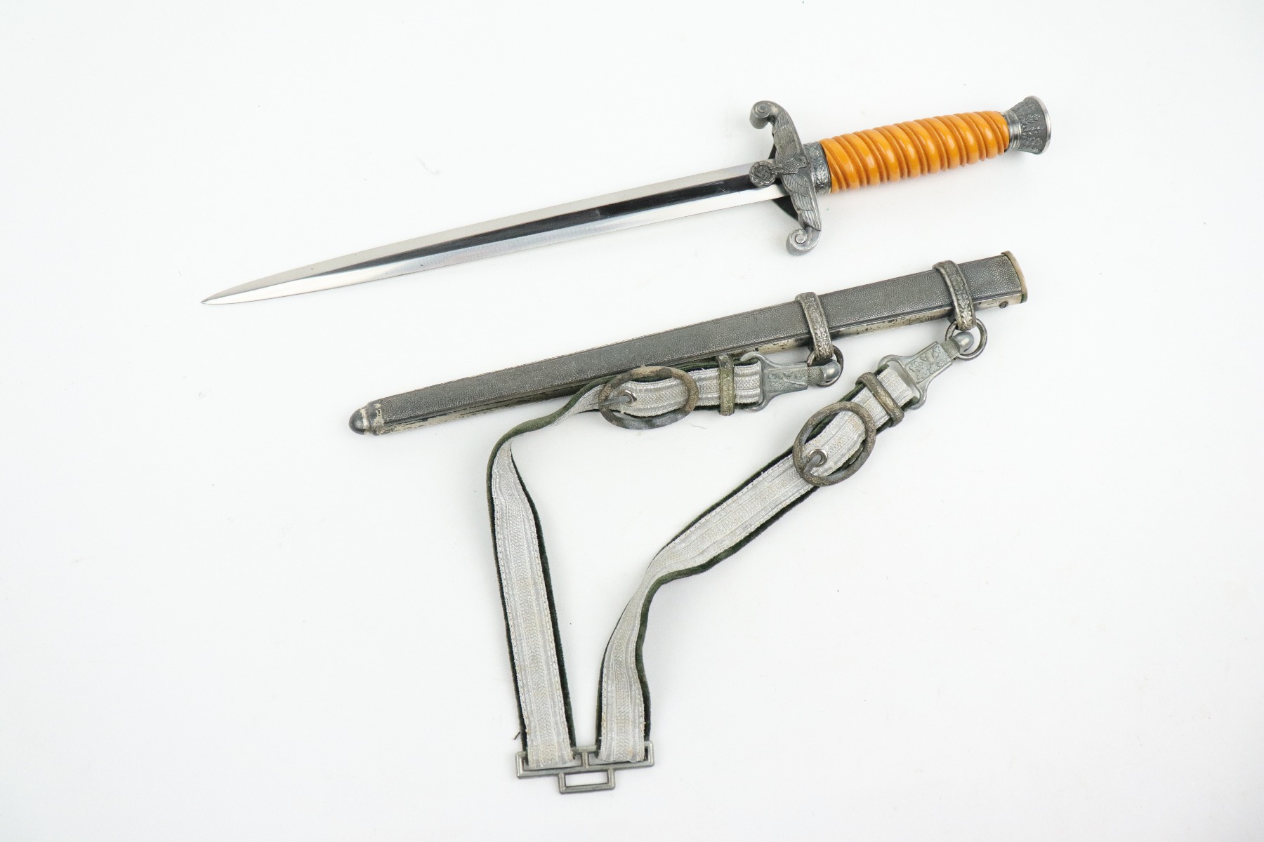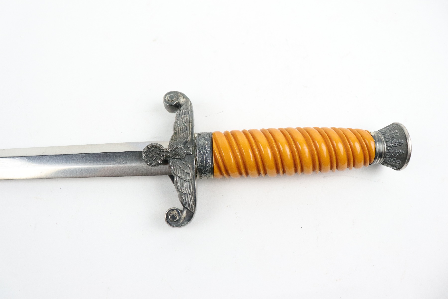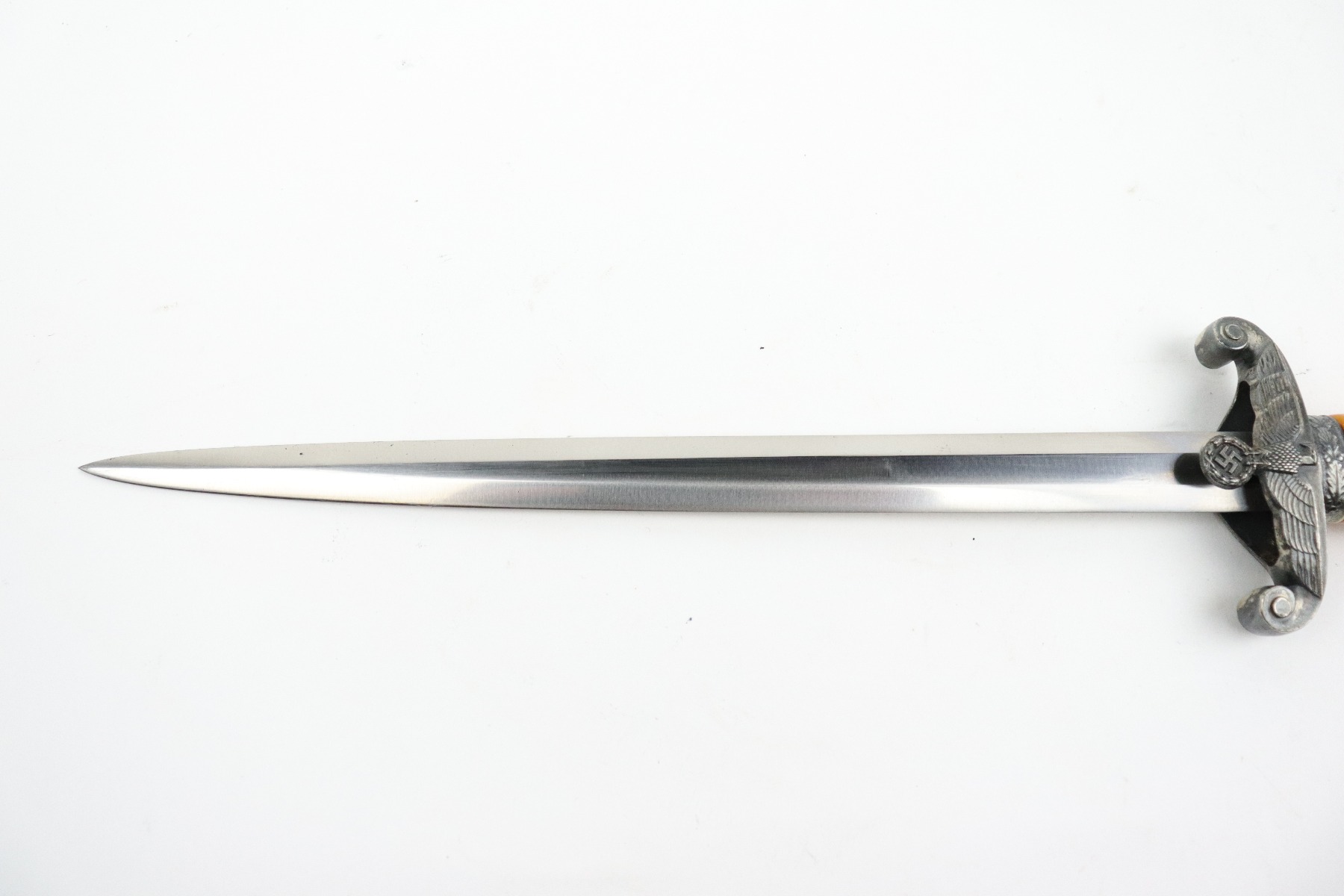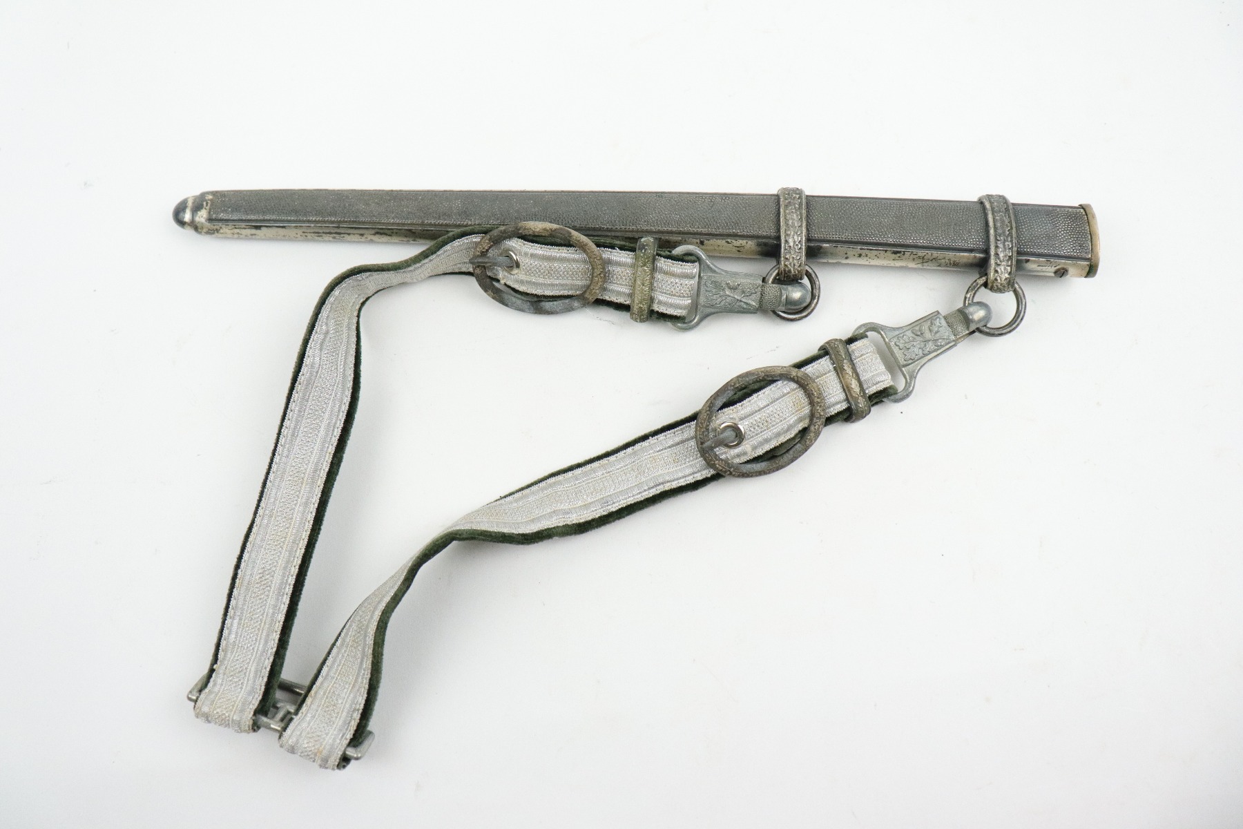 8/18/20 – This is an original WW2 Nazi dagger with an original scabbard and hanger. Overall, they are all in very nice condition. The blade is shiny and in tact with just a few small areas of light surface scratches and one or two dots of discoloration. There is wear in the finish on the cross guard and pommel. There is spotty discoloration along the sides of the scabbard. The original hanger is in tact and in excellent condition. Excellent green velvet on the reverse side. The blade is “WKC Solingen” makers marked. The leather stopper at the base of the blade is in tact.