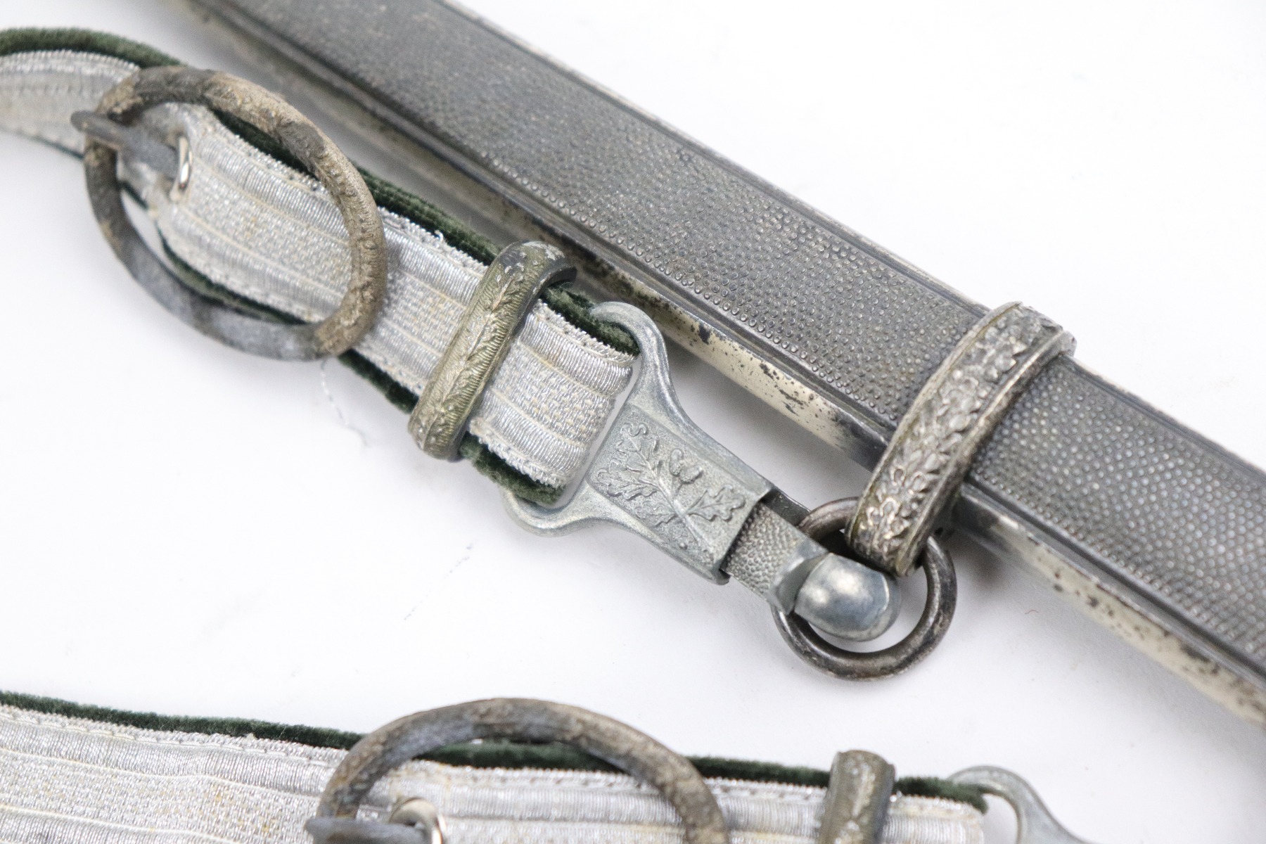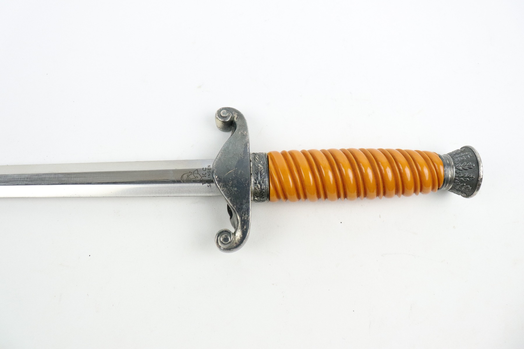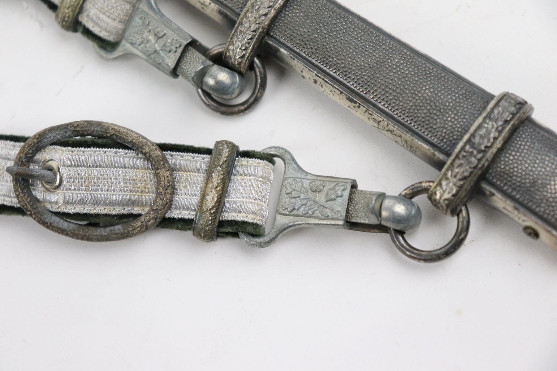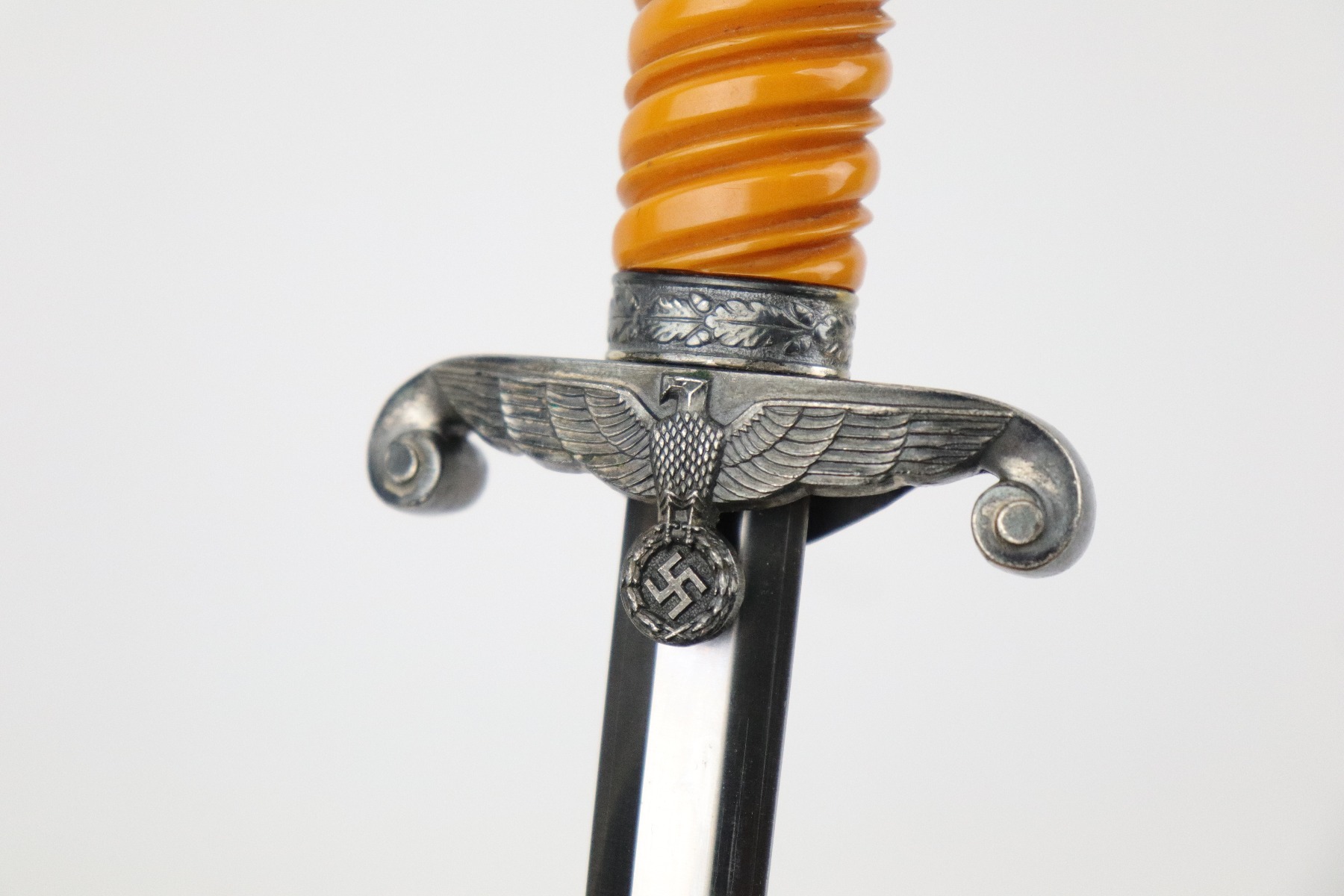 8/18/20 – This is an original WW2 Nazi dagger with an original scabbard and hanger. Overall, they are all in very nice condition. The blade is shiny and in tact with just a few small areas of light surface scratches and one or two dots of discoloration. There is wear in the finish on the cross guard and pommel. There is spotty discoloration along the sides of the scabbard. The original hanger is in tact and in excellent condition. Excellent green velvet on the reverse side. The blade is “WKC Solingen” makers marked. The leather stopper at the base of the blade is in tact.