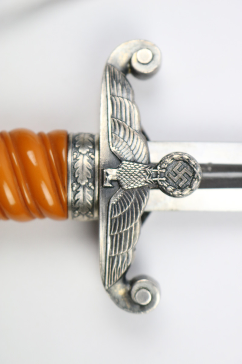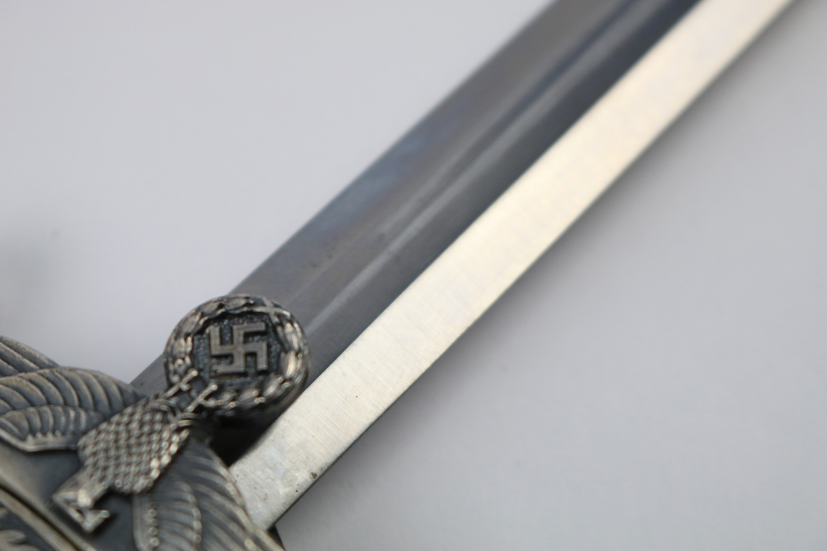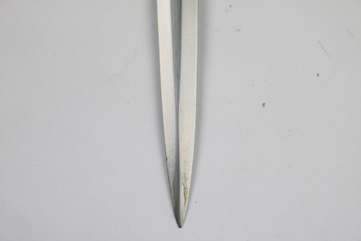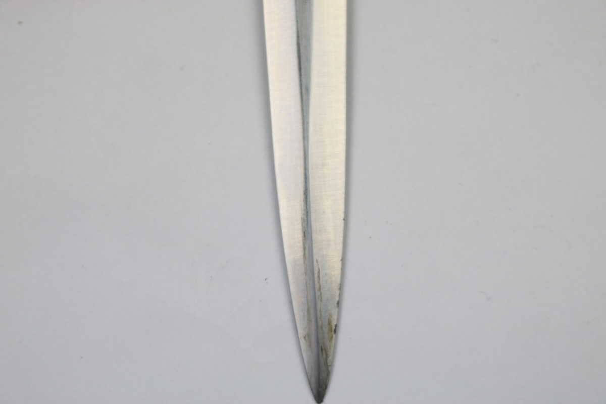 6/12/18 – This is an original WW2 nazi army dagger. The dagger is complete with the original hanger and portepee. The portepee has minimal fraying / wear and is excellent. The hanger has some rust stains on the metal very clean and excellent as well. The dagger handle doesn’t have any cracks or chips and the scabbard has no dents. The blade is WKC maker stamped and excellent with no notable wear / patina, nor any signs of sharpening. Guaranteed original.
