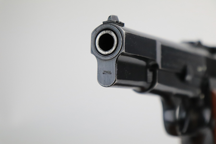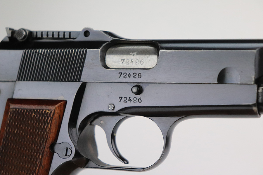 7/21/22 – This is an excellent example of a desirable FN Browning High Power with early tangent rear sight, made in ~1941 for the German Army. All matching and original with 93-94% of the blue remaining. Excellent profile with most of the finish loss on the grip straps, and an area of wear on the trigger guard. Minty grips with fine checkering. WaA103 proofs on slide, frame and barrel. Mag is WaA140 marked. Bore has minor frost but generally shiny with good rifling.