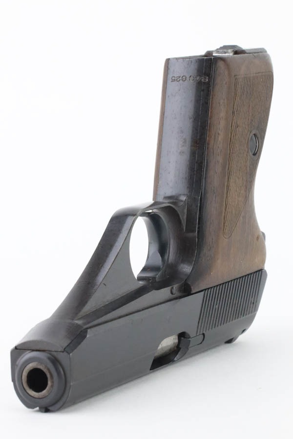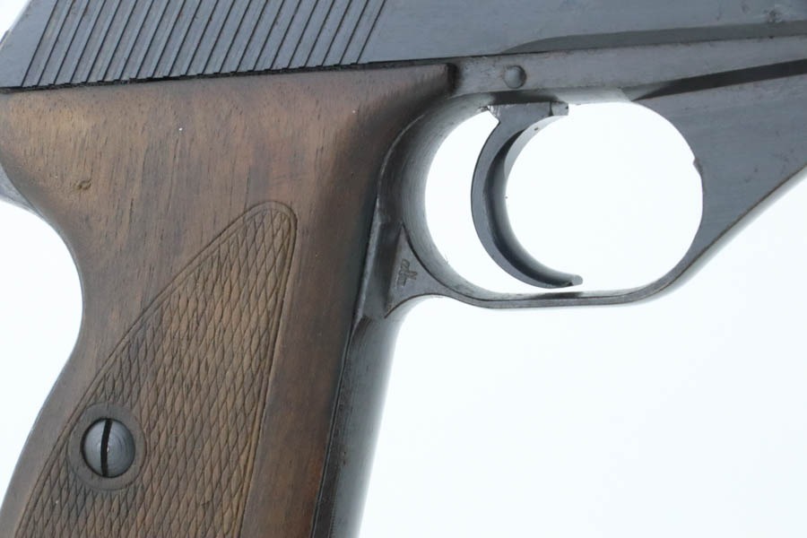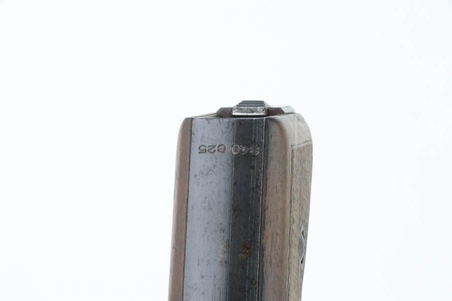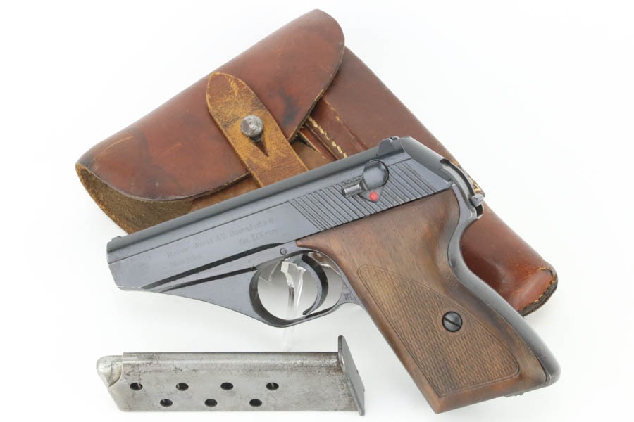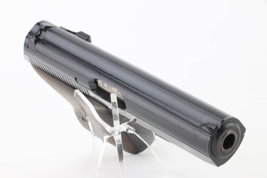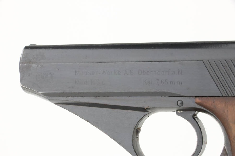 10/1/24 – This is an excellent example of a Mauser HSC issued to the Nazi military in 1943. All matching with the proper “Eagle 135” military acceptance proof on the trigger guard. It comes as a rig with one proper magazine and a generic tan leather holster. The gun itself has retained nearly all of its finish, but there is a spot of oxidation on the left side of the muzzle, some light freckling on the straps, and a few small pits on the right side of the slide. Fitted with period-correct wood grips. Minty bore.