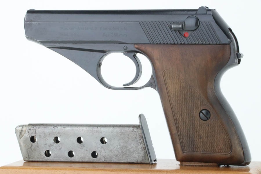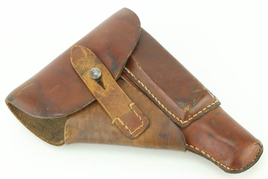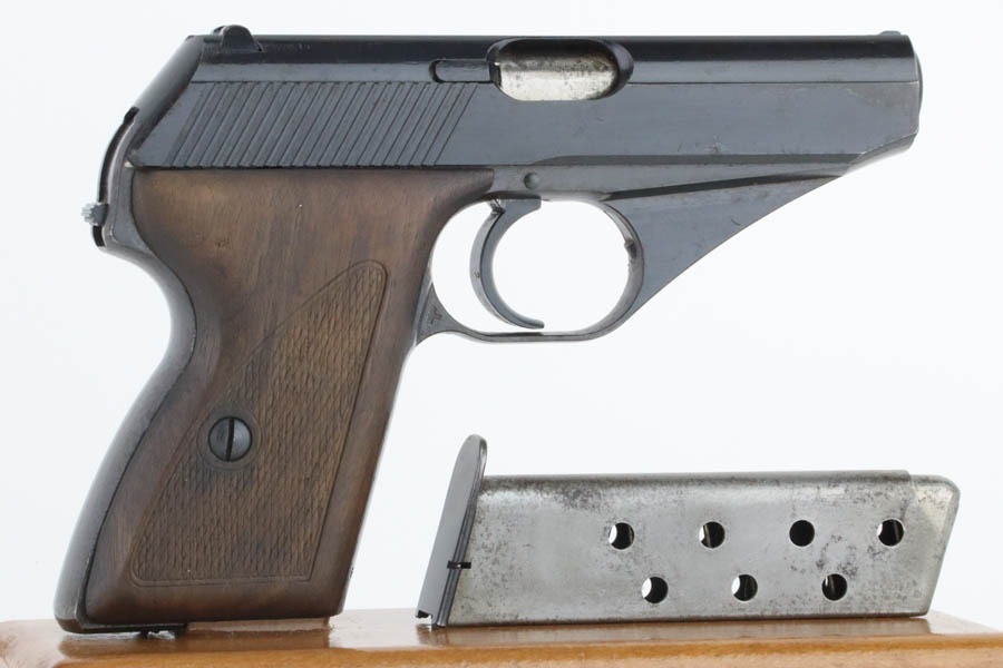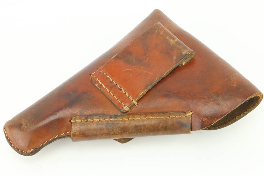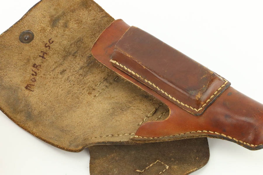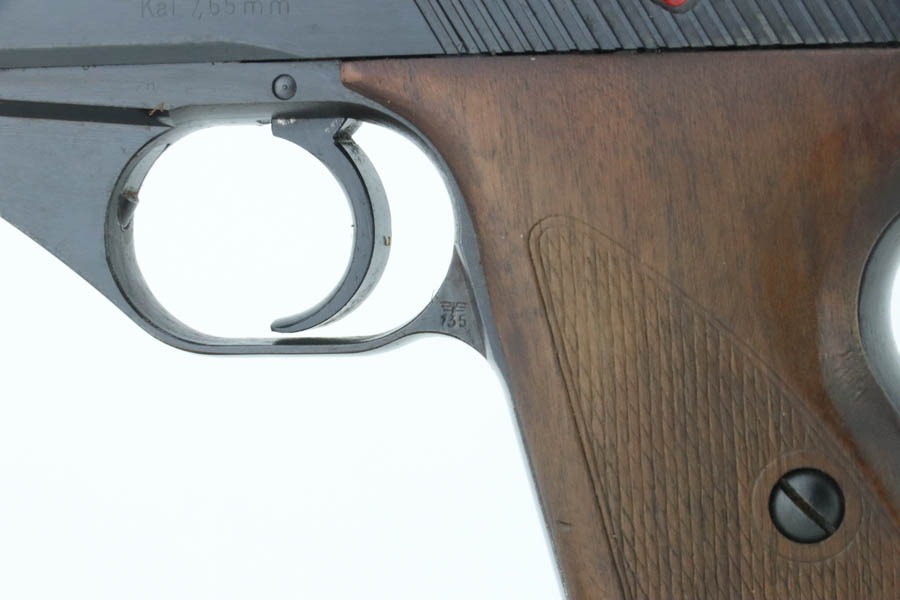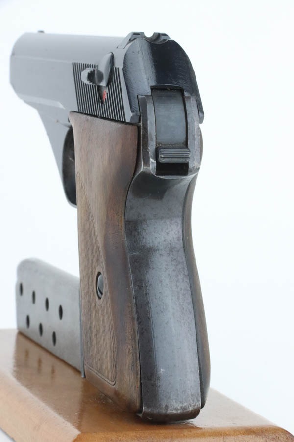 10/1/24 – This is an excellent example of a Mauser HSC issued to the Nazi military in 1943. All matching with the proper “Eagle 135” military acceptance proof on the trigger guard. It comes as a rig with one proper magazine and a generic tan leather holster. The gun itself has retained nearly all of its finish, but there is a spot of oxidation on the left side of the muzzle, some light freckling on the straps, and a few small pits on the right side of the slide. Fitted with period-correct wood grips. Minty bore.